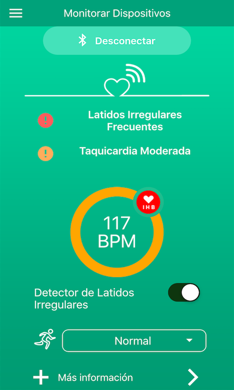 Según la severidad y tipo de alarma registrada en función del modo de actividad, Arrhythmial App enviará una alarma visual y auditiva con una guía de actuación, al propio usuario o a un tercero de su elección, para el control y monitorización de un paciente o un familiar, siempre y cuando exista consentimiento previo.