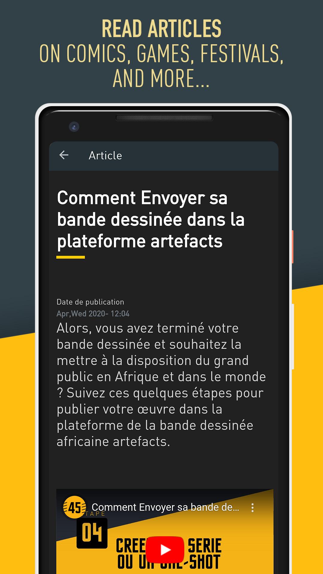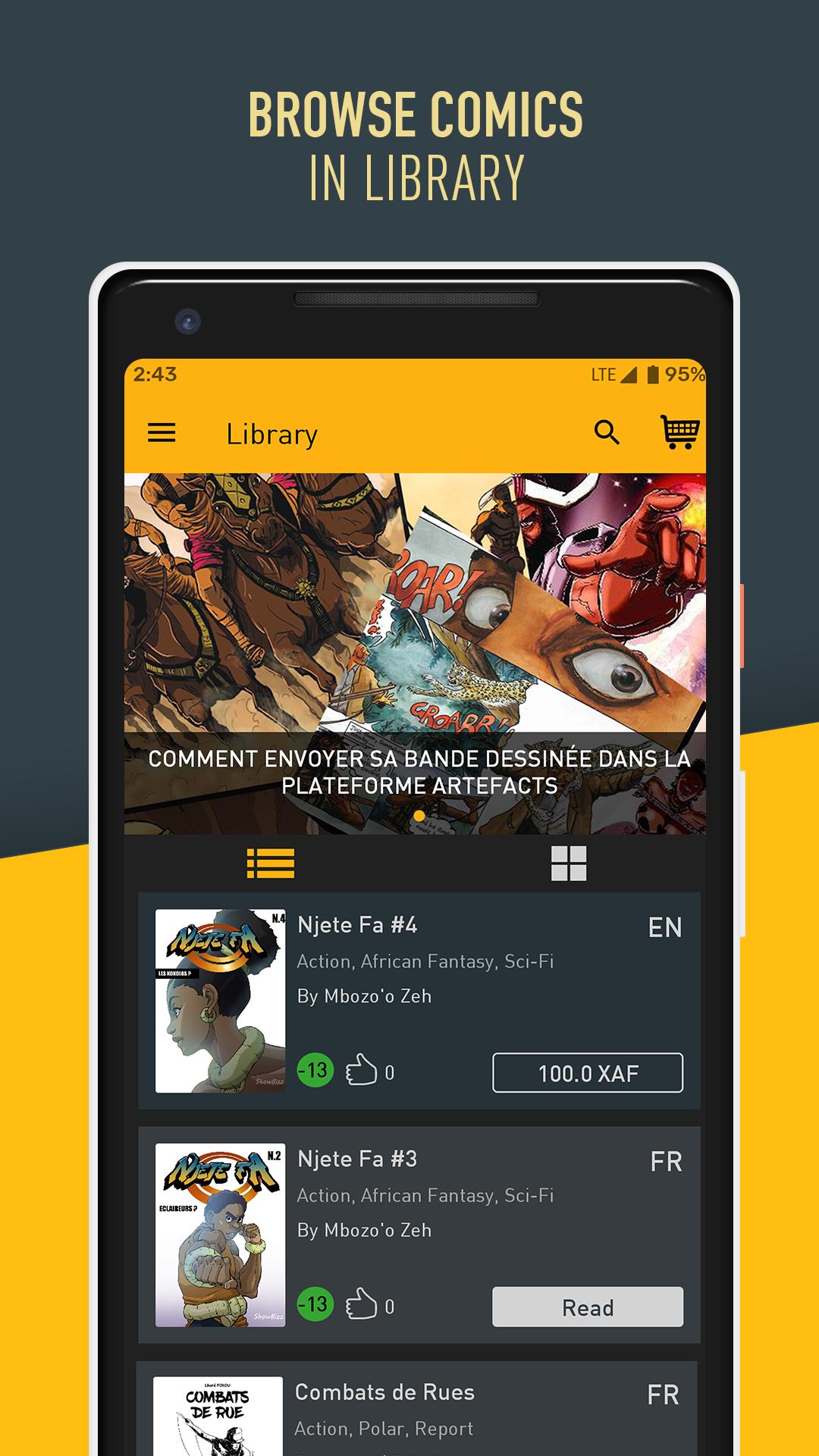 Artefacts app provides you with a rich catalogue of comics, sent to the platform by the authors themselves. Enjoy the best reading experience, with the panel-by-panel and page mode. Some comics are free, and others are very affordable. Several payment methods are available to you, including mobile payment. You can also take advantage of artwork by African digital artists, which you can use as wallpaper for your phone. You will also find in the application, articles on topics related to the world of comics and drawing in general (animation, video games, festivals, etc..). several other surprises are coming in the application. Stay tuned.
