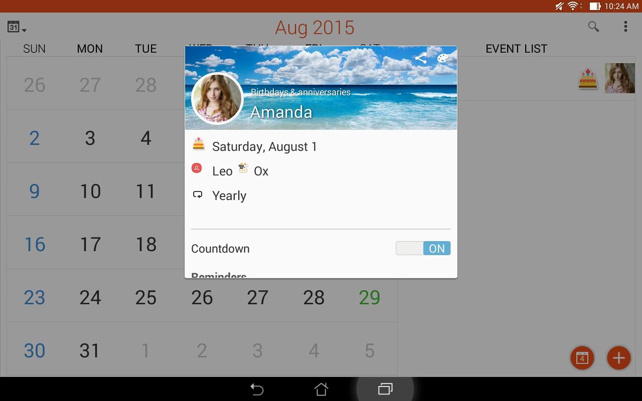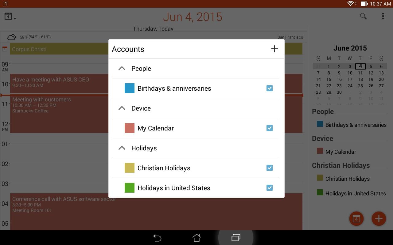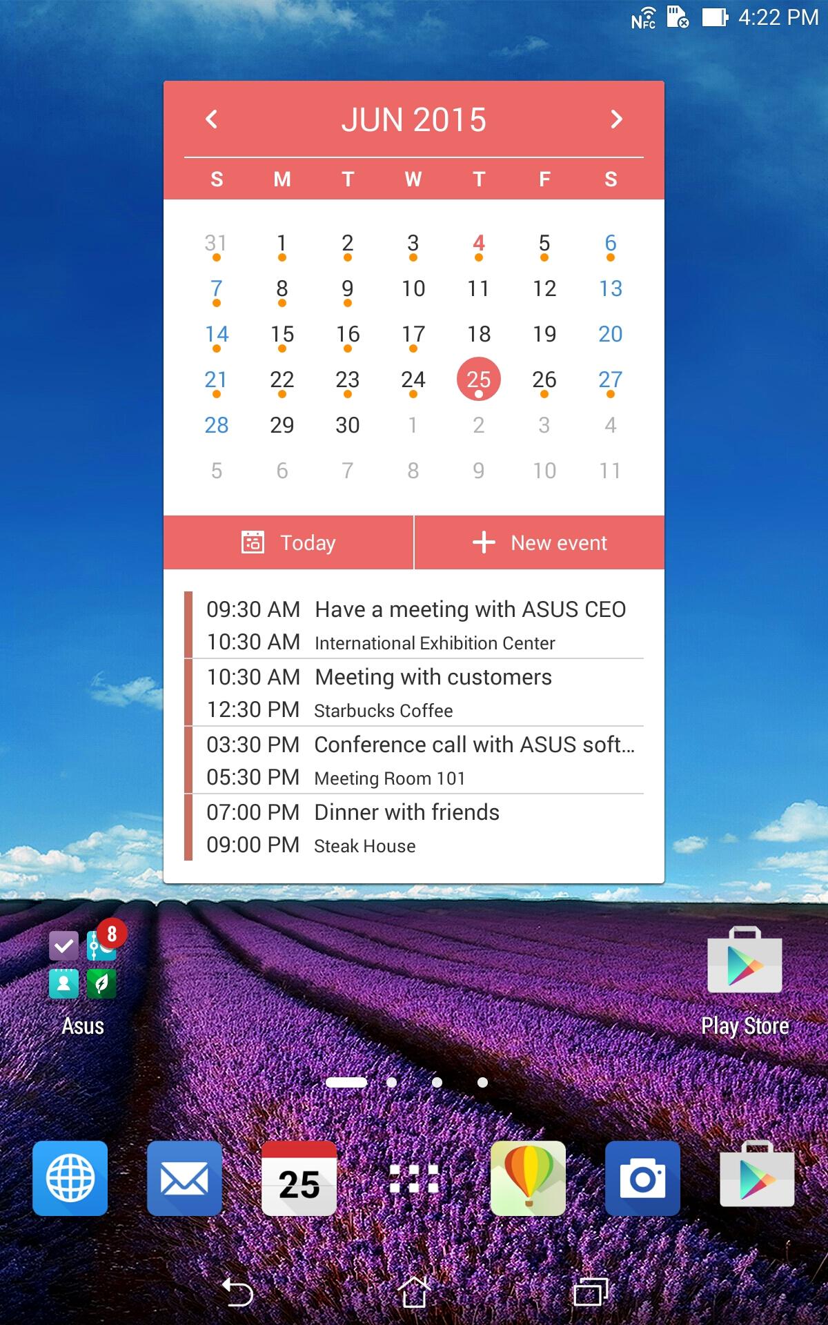 ASUS ZenUI Calendar is the essential scheduling partner for your ASUS ZenUI device, allowing you to integrate appointments from multiple agendas, including Google Calendar and Microsoft Exchange – seamlessly! ZenUI Calendar also synchronizes with your favorite social-media tools, such as Plurk and Weibo, keeping all parts of your life in harmony. Whether you like to like to browse your schedule by the day or week, or via a monthly view, ZenUI Calendar makes quick and easy work of managing personal, social and business arrangements — and with just a few taps of your finger! Important Due to changes in Facebook's service policy, ASUS Calendar will no longer be able to access some of your Facebook services such as all your Facebook friends information including their birthdays. Some related features in ASUS Calendar have been modified in order to comply with this new policy. Thank you for your understanding. [Key features] - Support for both local, online and corporate calendars keeps all parts of your life in view. - Multiple calendar views allow you to flip easily between daily, weekly or monthly schedules. - Seamless integration with popular social networks helps you stay on top of birthdays, anniversaries and other events. - Ever-present ‘New event’ button means you can create new entries whenever you need, without having to hunt through menus. - Reply, forward, share or send invitations via ZenUI Email without having to switch apps. - Simple-to-configure countdown option provides persistent reminder of impending events, so you’ll never miss an important appointment. - Decide exactly how simple or detailed you’d like your ZenUI Calendar to be, with easy-to-customize views. - Intelligent location integrating speeds the creation of appointments, allowing you to add previous or current addresses just by tapping the Location field. [Tips] 1. Tick ‘Show number of events’ in Settings and Month view to enumerate each day’s appointments, allowing you to gauge your schedule at a glance. 2. If you’re running late for an appointment, use the ‘Quick responses’ feature in Settings to let everyone know — with just a tap. 3. Send greetings quickly and easily, right within ZenUI Calendar – just tap the entry and then choose to call or email. 4. Enable the ‘Show weather’ and ‘Show second time zone’ options in Settings for a heads-up on outdoor conditions and to keep in sync with remote friends and colleagues. 5. Link cover images for ZenUI Gallery events to ZenUI Calendar and then tap the image icon in ZenUI Calendar to instantly switch to ZenUI Gallery to view all linked photos. [Notes] 1. The appearance and operation of some features may vary, depending on your device. 2. ASUS ZenUI Calendar is a free app for ASUS devices. You will not be charged for downloading or using this app.