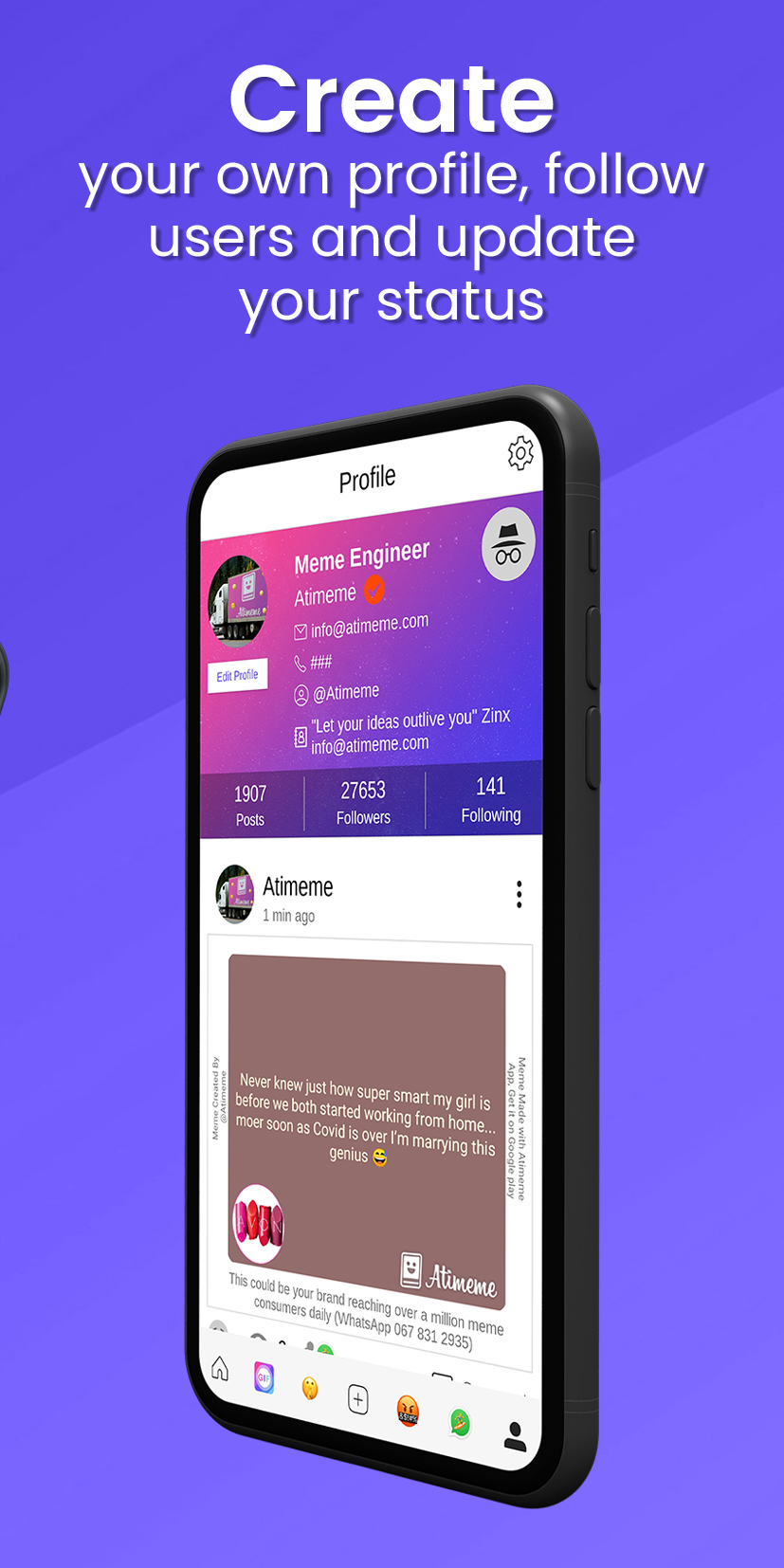 Become the next meme lord! Keep your friend’s circle alive with funny memes using one of a kind social network app dedicated for memes. Atimeme is the world’s first complete meme social media app that helps you create awesome memes, allows you to share and help preserve and centralize digital happiness. Users can not only make people laugh but also convey a very deep and essential message through memes. With the help of famous meme template collection, you can make your own personal memes and gain fame by making your memes viral through the internet. Join the Memers Community Connect and interact with memers all around the world in this meme universe. Instead of wasting your time searching the web for meme templates, us this cool meme maker to create as many memes as you want swiftly and easily Meme Creation Made Easy Explore and use the different options on the meme creator screen. Whether you are someone new to the meme editing world or someone who is a pro meme maker, this meme generator app will be there to help you find and execute fresh content on meme templates. Social Media for Humor Sometimes, laughter is what the world needs to skip the bad and move on towards betterment. Humor helps in many ways by resolving conflicts and introducing a light touch of comedy to every situation. With this meme generator, you can use your wit and creativity to make people laugh and spread joy across the world. Heaven for Meme Lovers No need to spend hours of research or ask someone to share a meme template with you. This meme maker has got you covered. Create your own memes or just scroll through millions of latest memes from around the world. Why Atimeme – Meme Social Network & Meme Creator? - Be the meme god who’s bound to be envied by many others - Atimeme is a complete meme social media that makes it easy for you to make memes and share them on any social media network - Tag your meme with your very own social media handle so people can see who created the awesome meme and also so they can follow you - Need inspiration to create memes? No problem, pick from our hilarious meme templates and let the humor begin - Users can download their favorite memes from the wall and also share them on their Facebook, Instagram, Twitter, What’s App, and many others - Follow your favorite memer and see their memes - Comment and laugh/like at memes - Get notifications whenever someone likes your meme, follows you, comments, downloads your meme, etc. - Look for people to follow & chat with them on Atimeme Chat - View top liked memes by day, week, month, quarter and year. Do not waste your time anymore, open your store to download Atimeme – Meme Social Network & Meme Creator, while it is free and enjoy a whole new world of memes and discover your talent meme making right now!