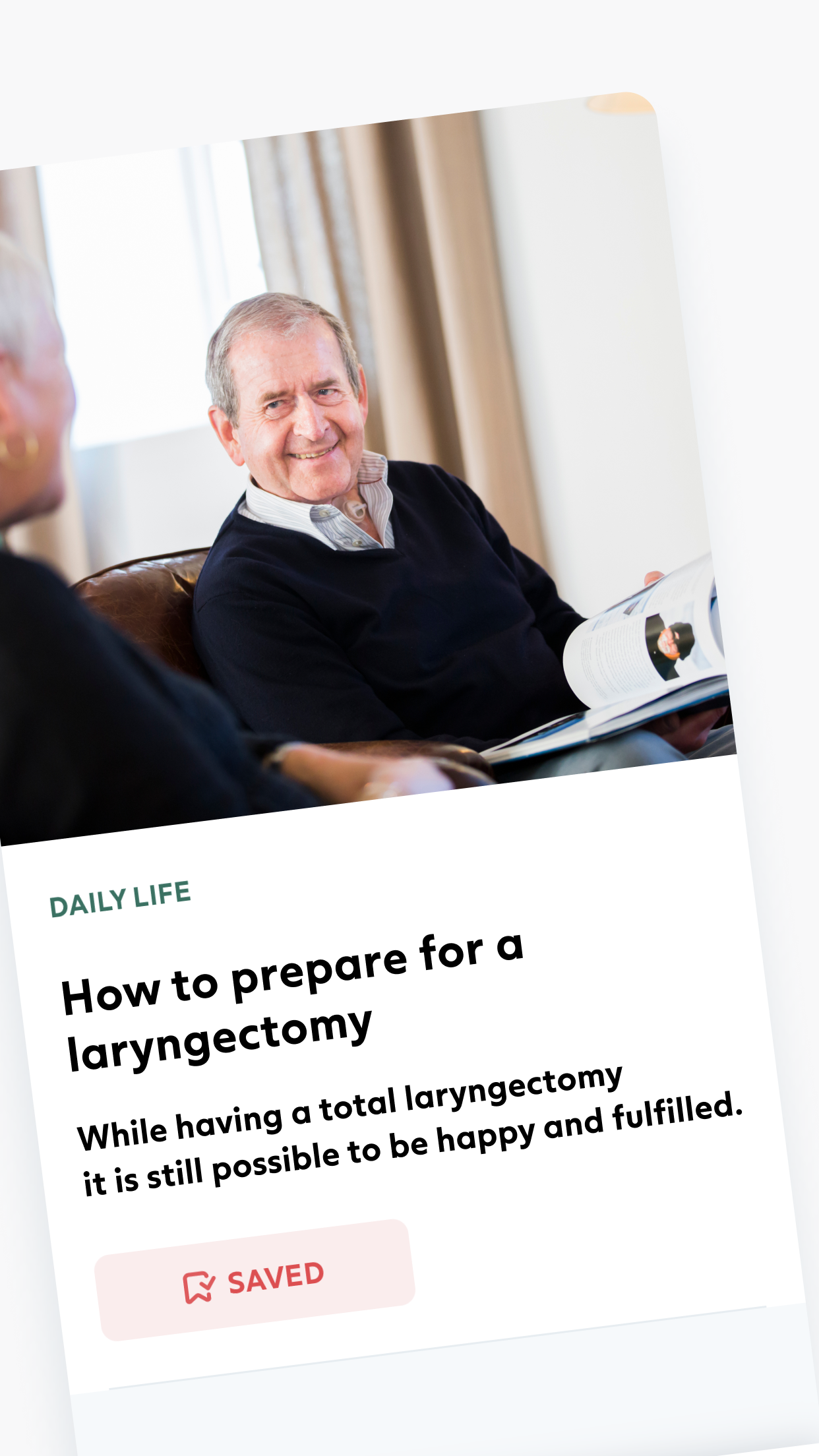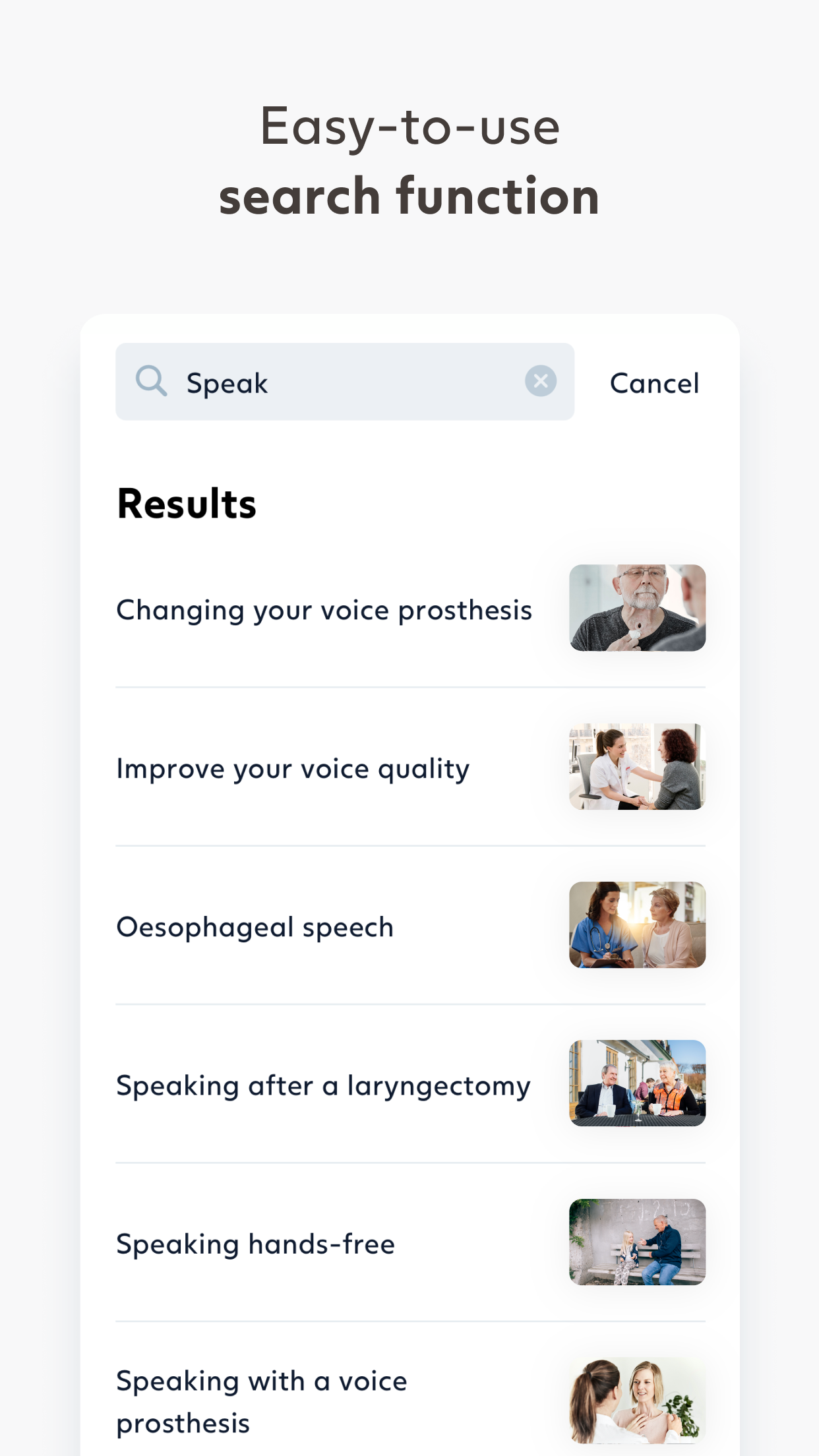- Inspirational stories: Read and watch articles and videos where clinicians and people who have undergone a total laryngectomy share unique stories and provide advice.