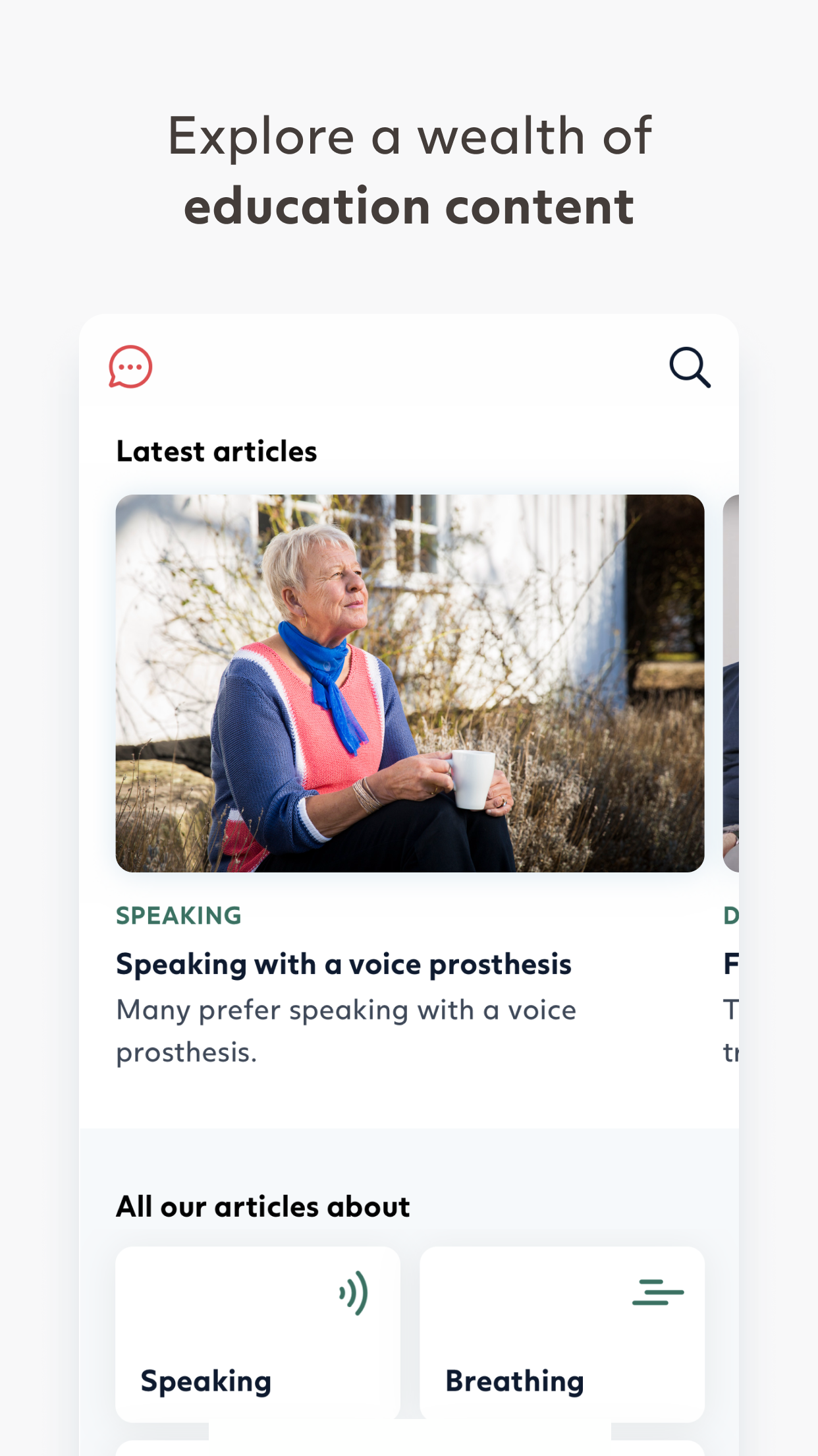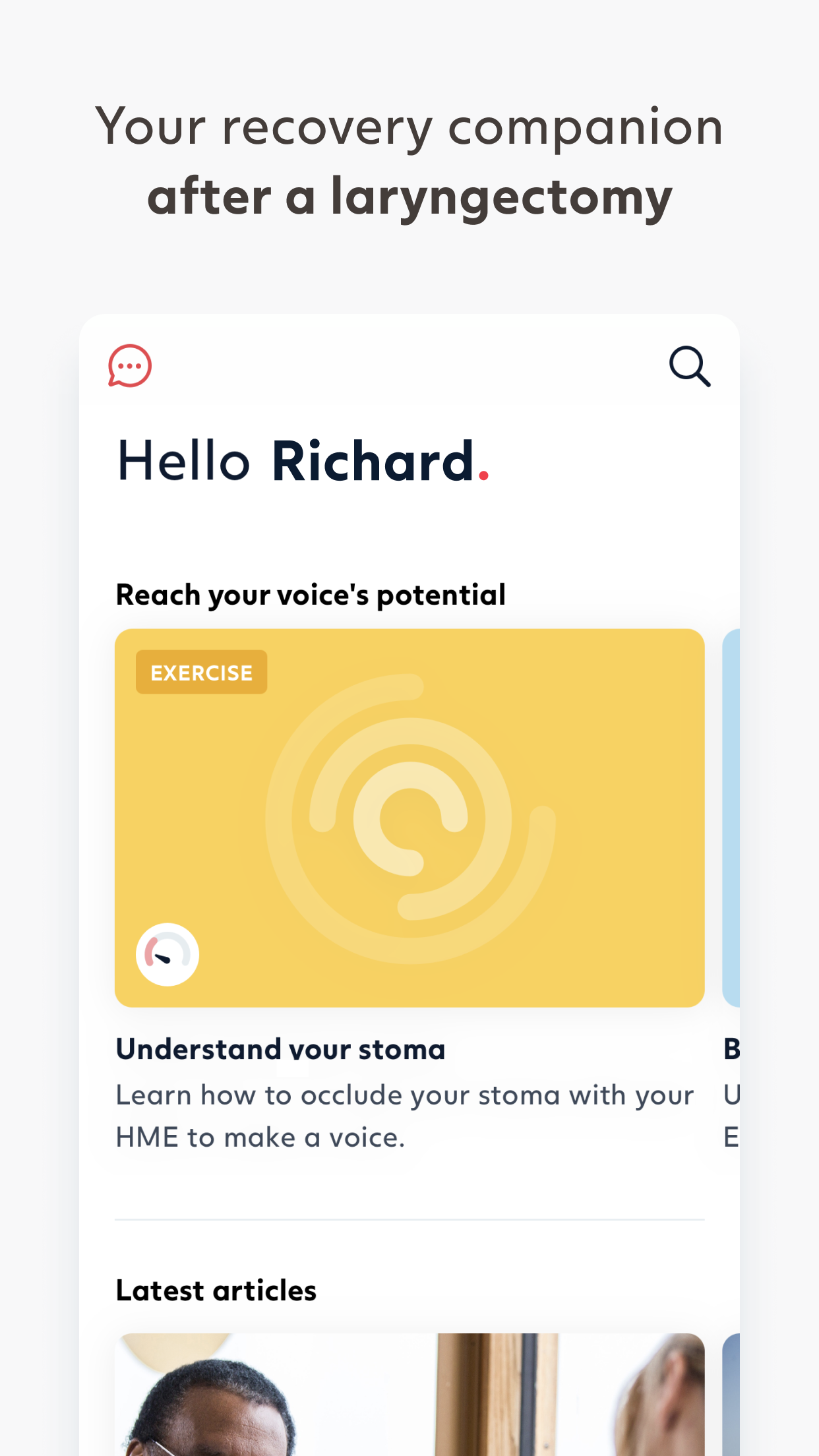 - Valuable information: Explore a range of videos, articles, and exercises to learn more about your stoma, breathing, speech, laryngectomy care, and more.