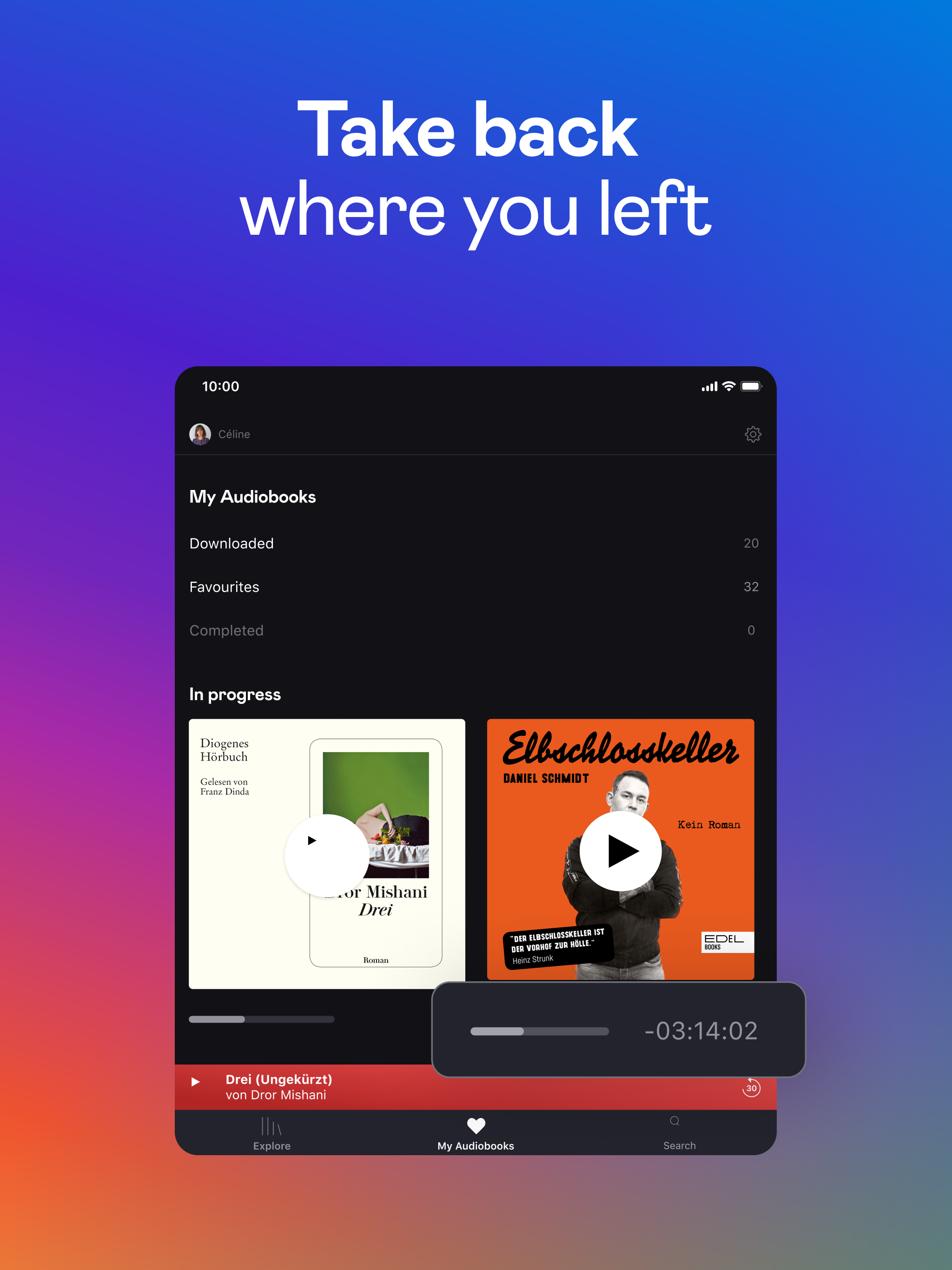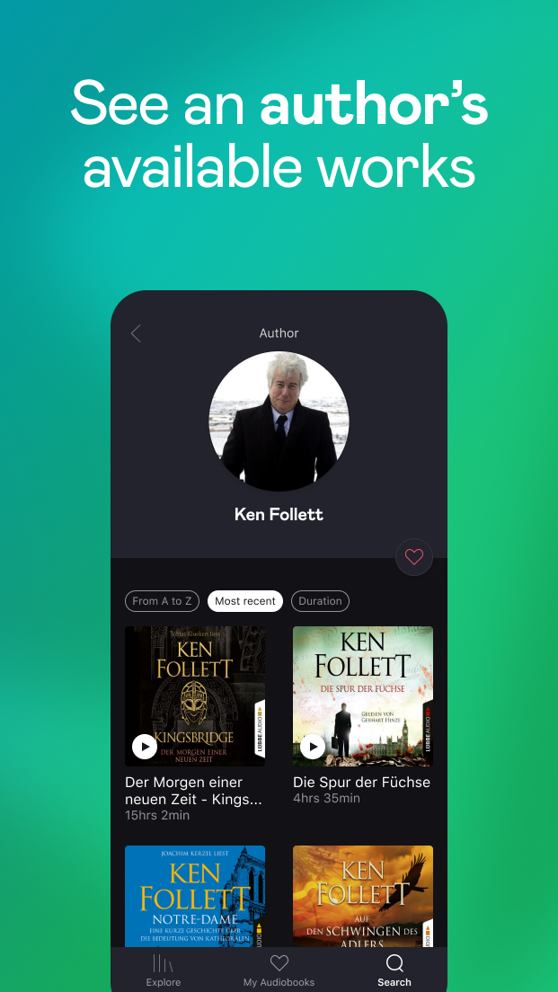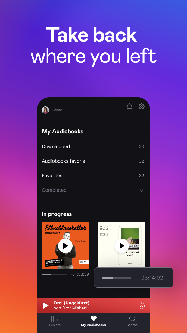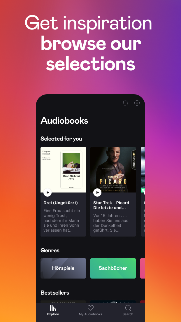 Get lost in a story with Audiobooks by Deezer. Discover a dedicated, offline-accessible space for all your audiobooks and with the exclusive mobile app, enjoy a smoother, more streamlined experience. Now you can discover, collect, stream and download audiobooks all in one place. This exclusive audiobook app is easy to use, convenient and free for those with a paying Deezer subscription. Enjoy an extensive catalog of audiobooks with a wide range of genres, including: • Thrillers • Audioplays • Science-fi & fantasy • Drama • Health & Wellness • Kids and many more to be discovered on the app. Listen to audiobooks the way you want to. From winding down before bedtime with a good book, listening while you cook or sharing a story with the kids at night, this app fits into any lifestyle for on the go mobile accessibility. Stream straight from your phone wherever you are, or download free audiobooks and listen offline. Audiobooks by Deezer features include: • Inclusive accessibility: Blind and visually-impaired accessible. • Offline listening: Download audiobooks to listen offline anytime, anywhere. • Easy discovery: Browse by new features, top charts, recommendations and more. • Bookmarks: Pick up right where you left off. • Favorites: "Like" the audiobooks you love by tapping the heart button to keep a wishlist of what you plan to listen to next. • My audiobooks: Keep your favorites in one place, including your downloaded, in progress and completed audiobooks. • Extra details: Find information like a brief summary listed below to help you choose your next book. This mobile app also offers weekly highlighted audiobooks, so you can spend less time searching, and more time listening. To access Audiobooks by Deezer, you'll need a paying Deezer subscription (Deezer Premium, Deezer Student, Deezer Family or Deezer HiFi) first. After downloading the app, you'll use the same account credentials to log in. If you're a Deezer Free user you'll need to register online or on the Deezer app for a paying Deezer subscription to access free audiobooks. Audiobooks by Deezer is available for users in Germany only.