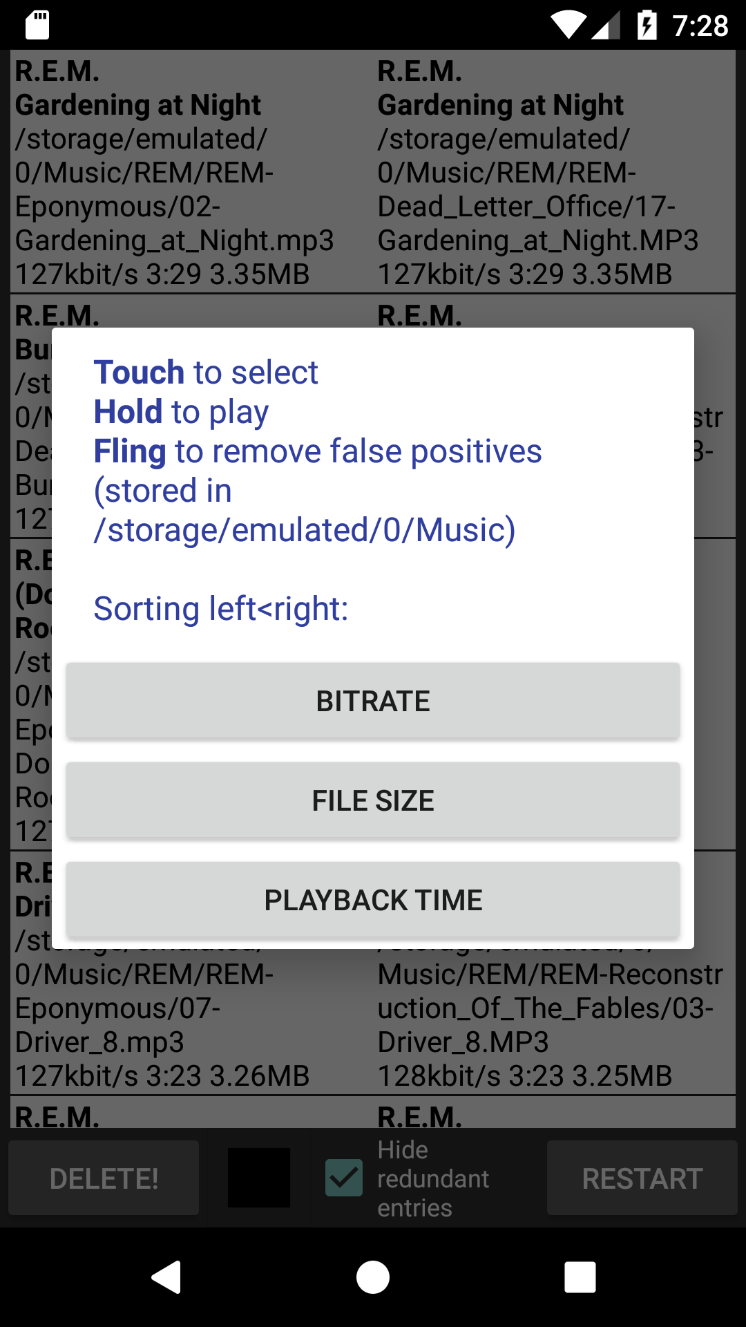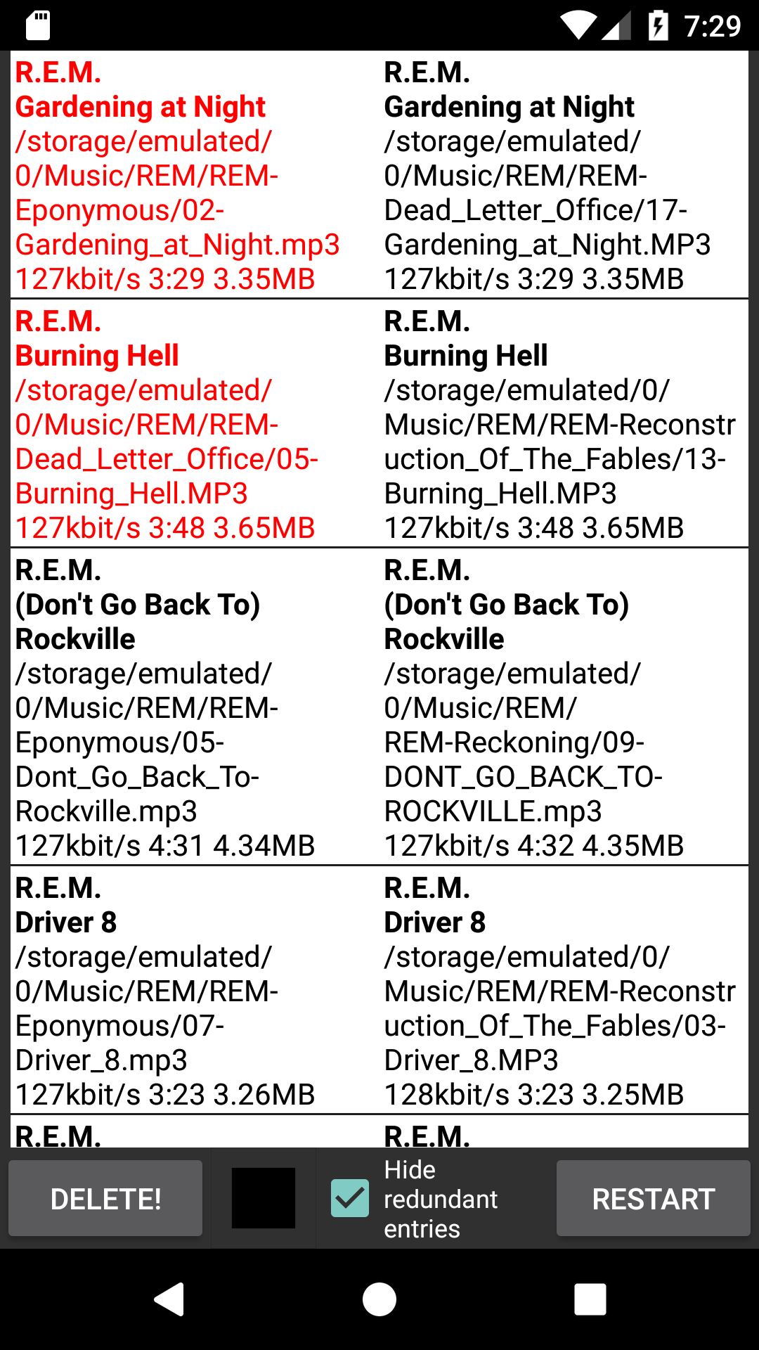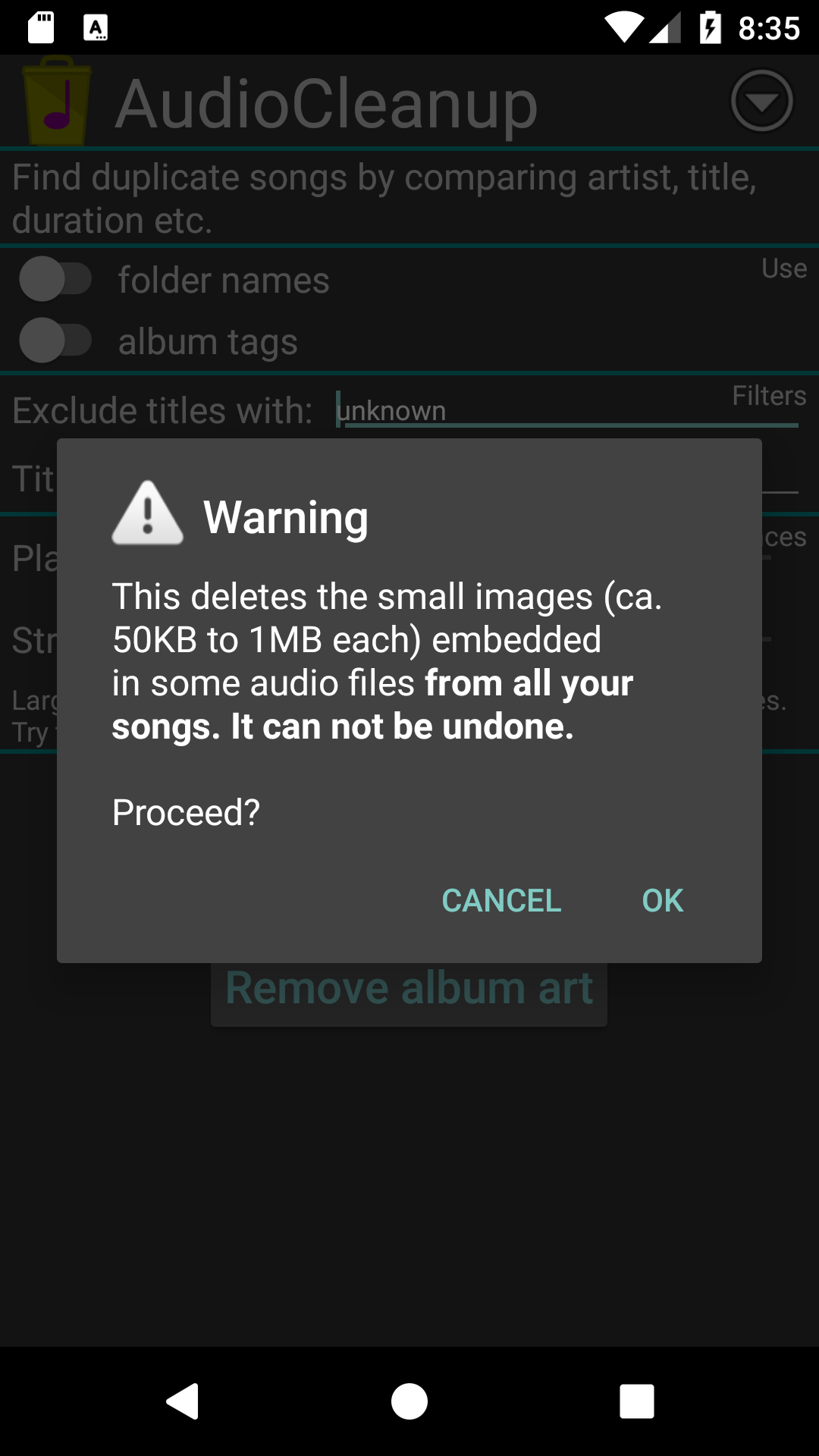 Free up storage by cleaning up your messy audio library! 1. This App searches the music library for duplicate songs by searching for similar track length and title/filename/foldername strings. The results are listed, and users may select and delete files. 2. It can delete all album art images from audio files with ID3.2+ audio tag. Features: - supports most audio formats - adjustable tolerances for the fuzzy comparison keywords: music, audio, library, collection, free, space, storage, mp3, id3, album art, album cover, clear, clean, remove, delete, optimize, cleanup