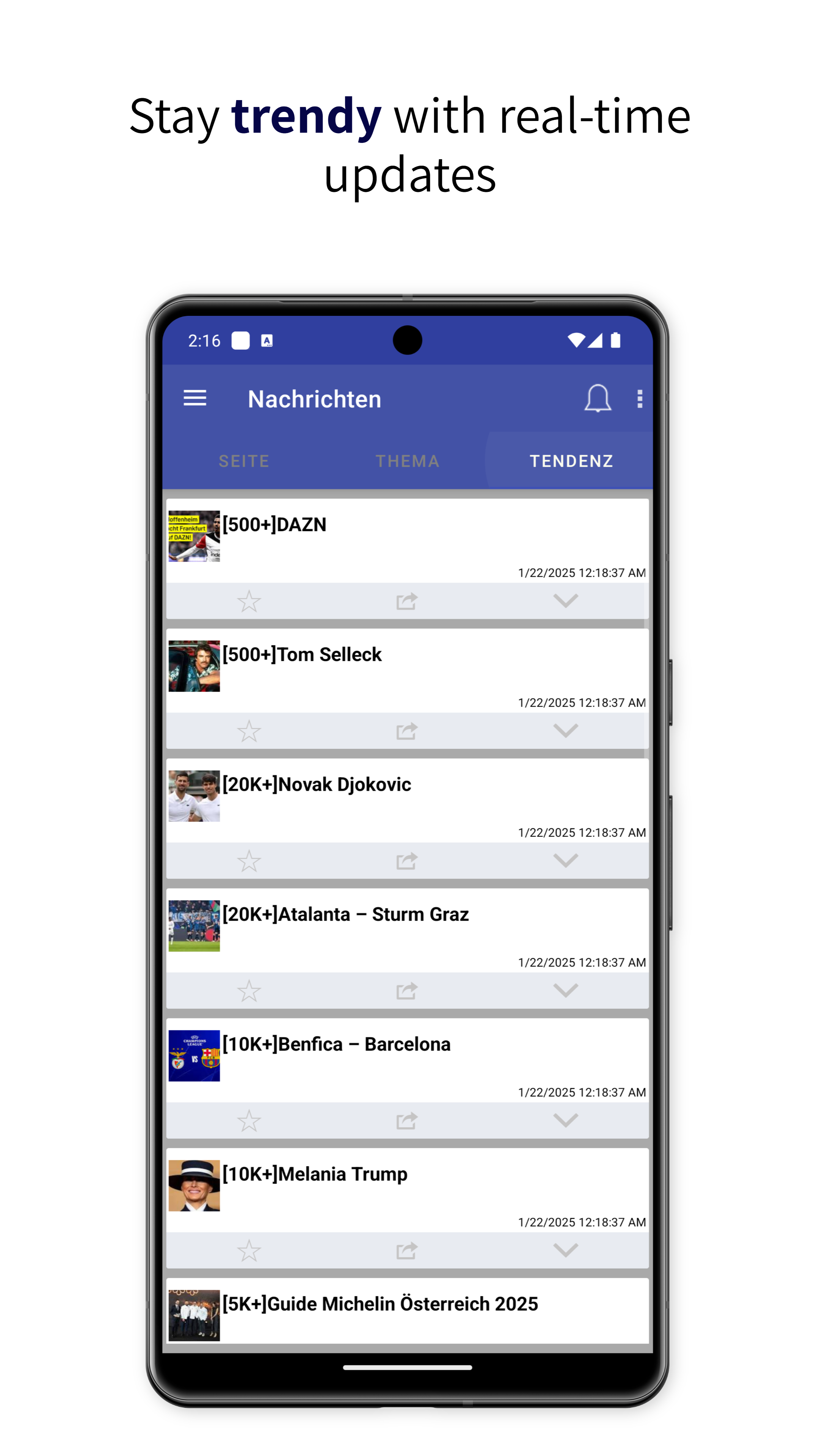 Austria News brings you instant access to the latest news, trending topics, and real-time updates from trusted sources in Austria. Stay informed with news from top media outlets like Die Presse, Der Standard, Kurier, Wiener Zeitung, Kronen Zeitung, Heute, ORF, News.at, Salzburger Nachrichten, Tiroler Tageszeitung, and many more. Whether you’re interested in politics, business, sports, entertainment, or technology, you’ll find everything you need in this simple and easy-to-use app.