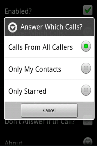 Do you want your phone to answer the incoming calls automatically? Sometimes,your hands are full and you couldn't empty one hand to answer the call. Don't worry.This app Auto Answer To Call could help you a lot! How to Use: First step is to enable the app which is also the most important.After activating this application,it could work normally. Then,you could make some personal settings.It includes: ---Answer which calls.You could select to answer whose call automatically.This app enables you to select all callers, contacts or only starred. ---Delay Before Answer.Set the delay time as you wish. ---Allow you to force speakerphone or not. ---You could also only use BT Headset. ---If you are in call,you could also select not to answer. Main Features: 1.Free 2.For Android and tablets 3.Easy to control 4.Bring convenience to life 5.Some personalized setting If you like it,please share it with your friends and family. Waiting for your 5 stars!