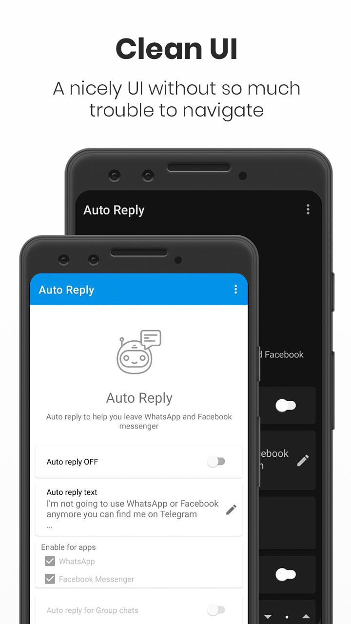 Auto Reply (Package Name: com.logapps.autoreply) is developed by LogApps and the latest version of Auto Reply for WhatsApp & Face 1.0 was updated on May 17, 2021. Auto Reply for WhatsApp & Face is in the category of Communication. You can check all apps from the developer of Auto Reply for WhatsApp & Face. Currently this app is for free. This app can be downloaded on Android 5.0+ on APKFab or Google Play. All APK/XAPK files on APKFab.com are original and 100% safe with fast download.