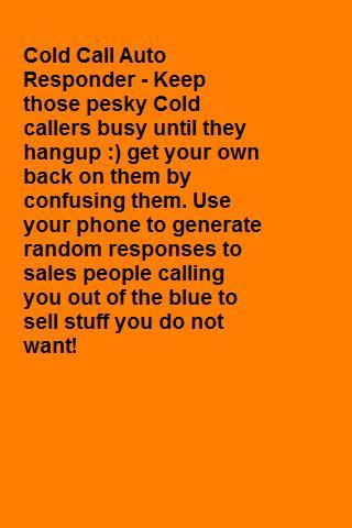 Auto Responder - Keep those pesky Cold callers busy until they hangup, allowing you to do other more useful stuff :) Get your own back on them by confusing them. Use your phone to generate random responses to sales people calling you out of the blue to sell stuff you do not want! Keep them guessing. How to use: Say you get a cold call on your landline, start the app on your mobile, press the start listening button. Then put your phone close to the handset and leave it there, it will answer to the cold caller's talking and questions automatically (with random and funny responses of course), until they decide they have wasted enough time and hang up, leaving you to do other more useful things and can laugh at these calls! The application will, after the caller speaks, reply with a response (uses android's built in text to speech function), it randomly selects a response from 20 different carefully worded responses. Future updates might include more responses, ability to add own responses, use real recorded audio responses. Have fun with it.