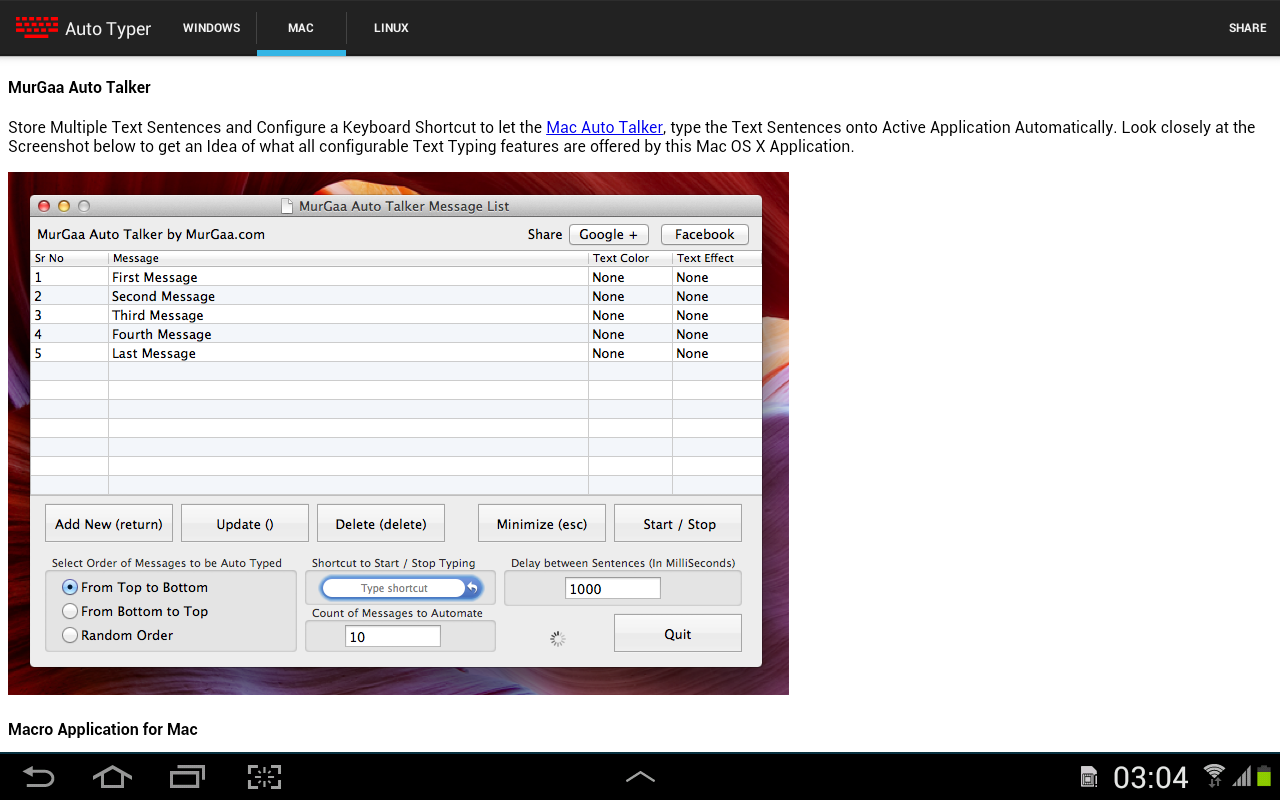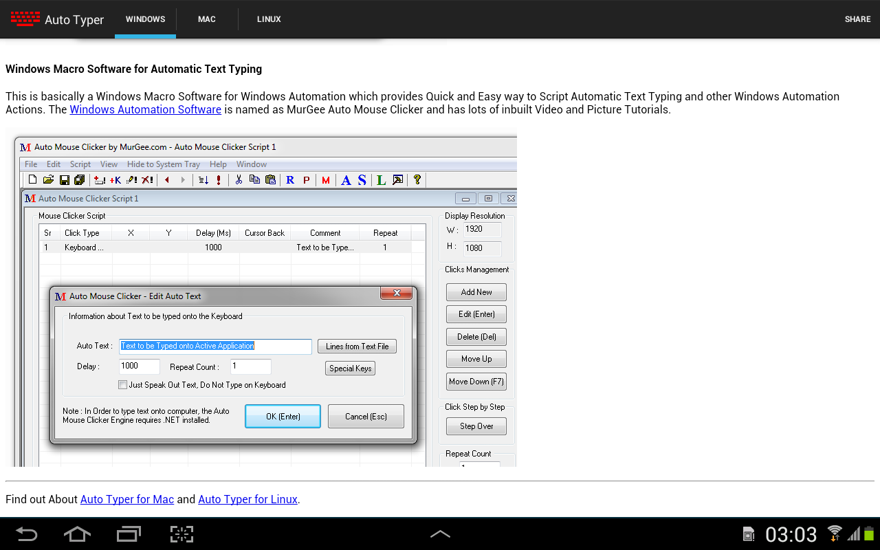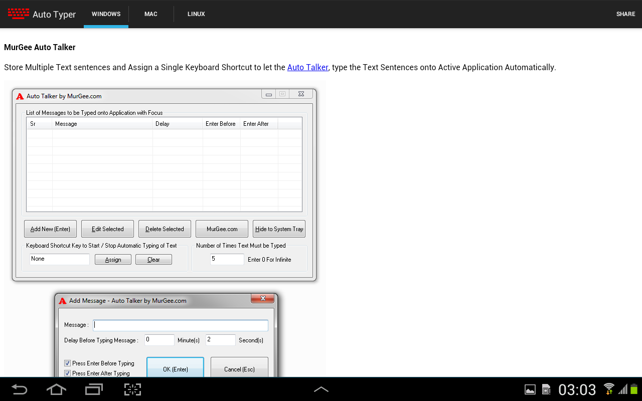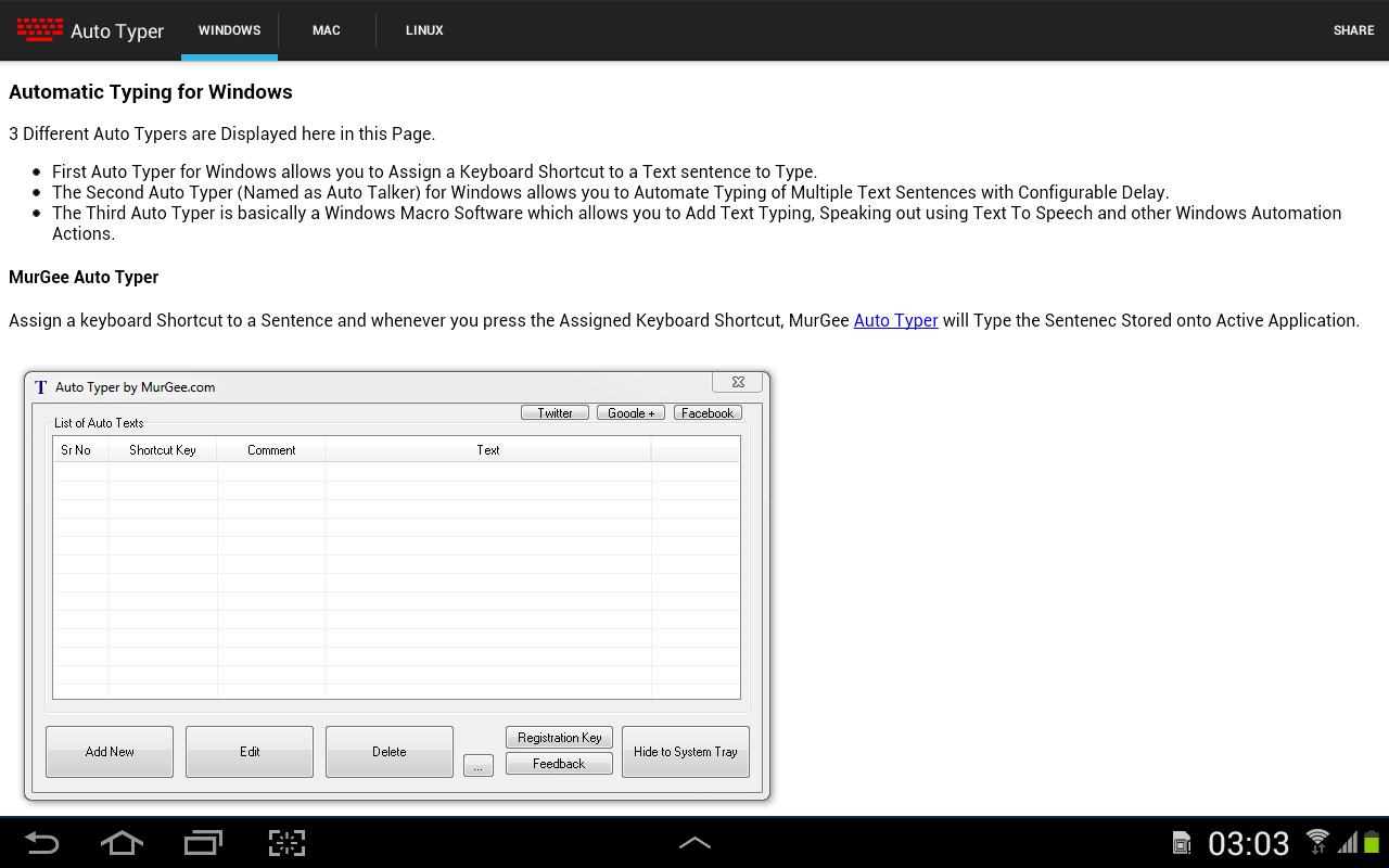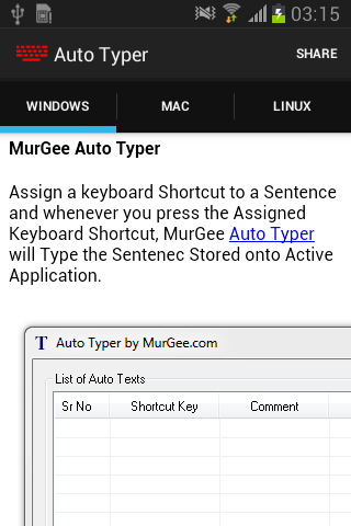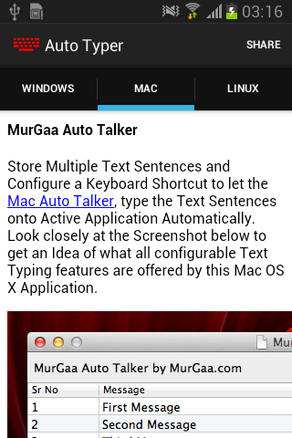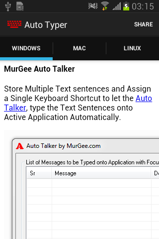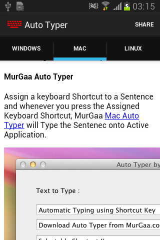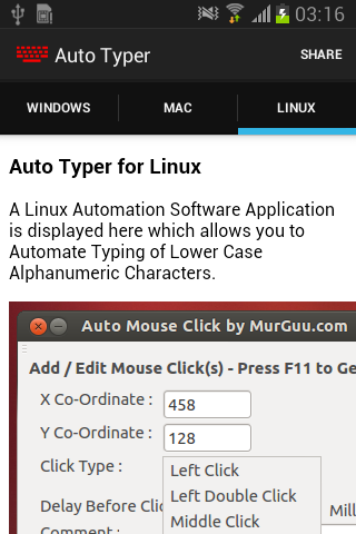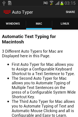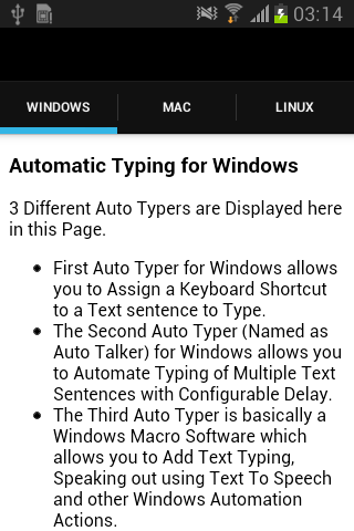 This Auto Typer is collection of information and is not an Android Automation Application. You can use information provided in this application to automate test typing on other operating systems.