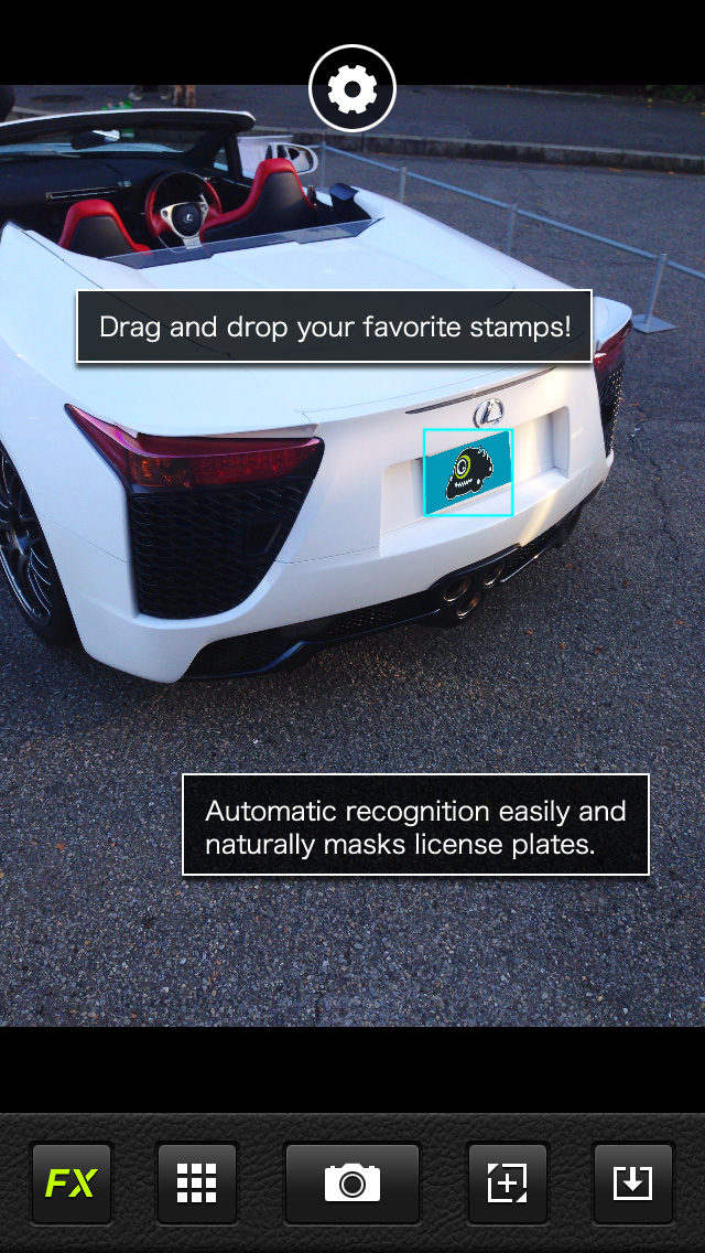 Automo Camera can automatically mask license plates from car photos taken with the app or selected from your library. New to the app is the Stamp Feature which allows the user to stamp their favorite brand logo, car club logo and event logo to their own photos. [Share your photos real time!] The app instantly masks license plates with a natural finish. Sharing car photos from club meets and events in real time is now easier and safer than ever. [Edit your stamps in 3D!] In addition to the 2D editing (resizing, rotating) of logo stamps, the app comes with 3D edit mode which allows you to reshape the stamp in 3D with depth perception. Stamp transparency can also be easily controlled. Combined with the image recognition technology of license masking, stamps can be inserted into the license plate, automatically adjusting to the size and angle of the target license plate. Insert your favorite brand logo into your license plate. Place your car club logo onto your car photo like a real decal. Or place a logo of your choice in the background of your car photos. The possibilities are endless! Automo Camera is for the true car enthusiast, specially developed to take car photos. We are committed in improving the app for our users. Now, you're ready to share your car photos! --------------------------------------------------- Automo Camera Main Features --------------------------------------------------- - Auto recognition and masking of license plates - Share your photos immediately and directly on Facebook, Twitter and Instagram. - Logo stamps can be edited in 2D and 3D edit modes. - Automatic Stamp Insertion allows you to place logo stamps into the license plate with size and angle automatically pre-adjusted. - Make your brand/club logo available on Automo Camera by submitting your logo thru our online logo submission service (rules & restrictions apply) - Choice of license plate masking color from a palette of 38 colors. - Manual Mode can be used on photos that cannot be processed automatically.
