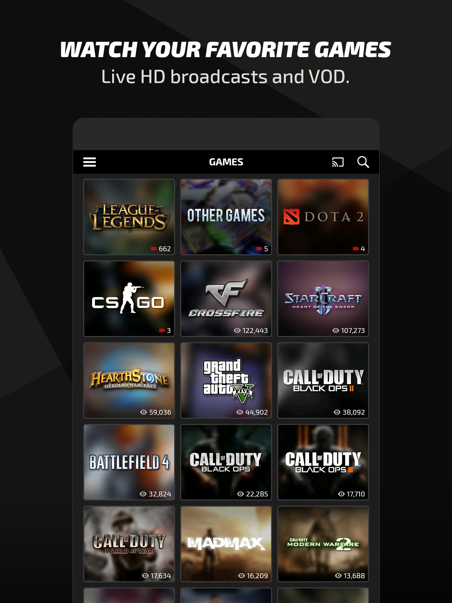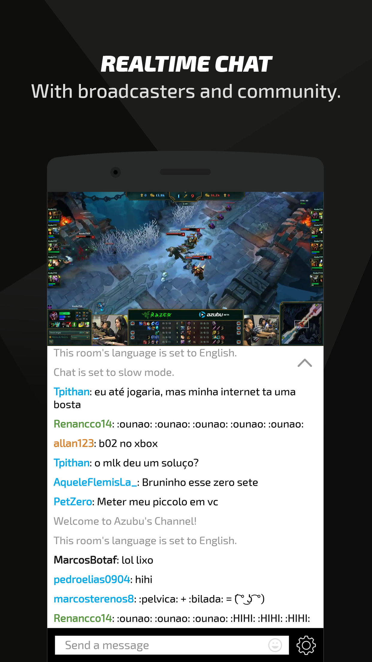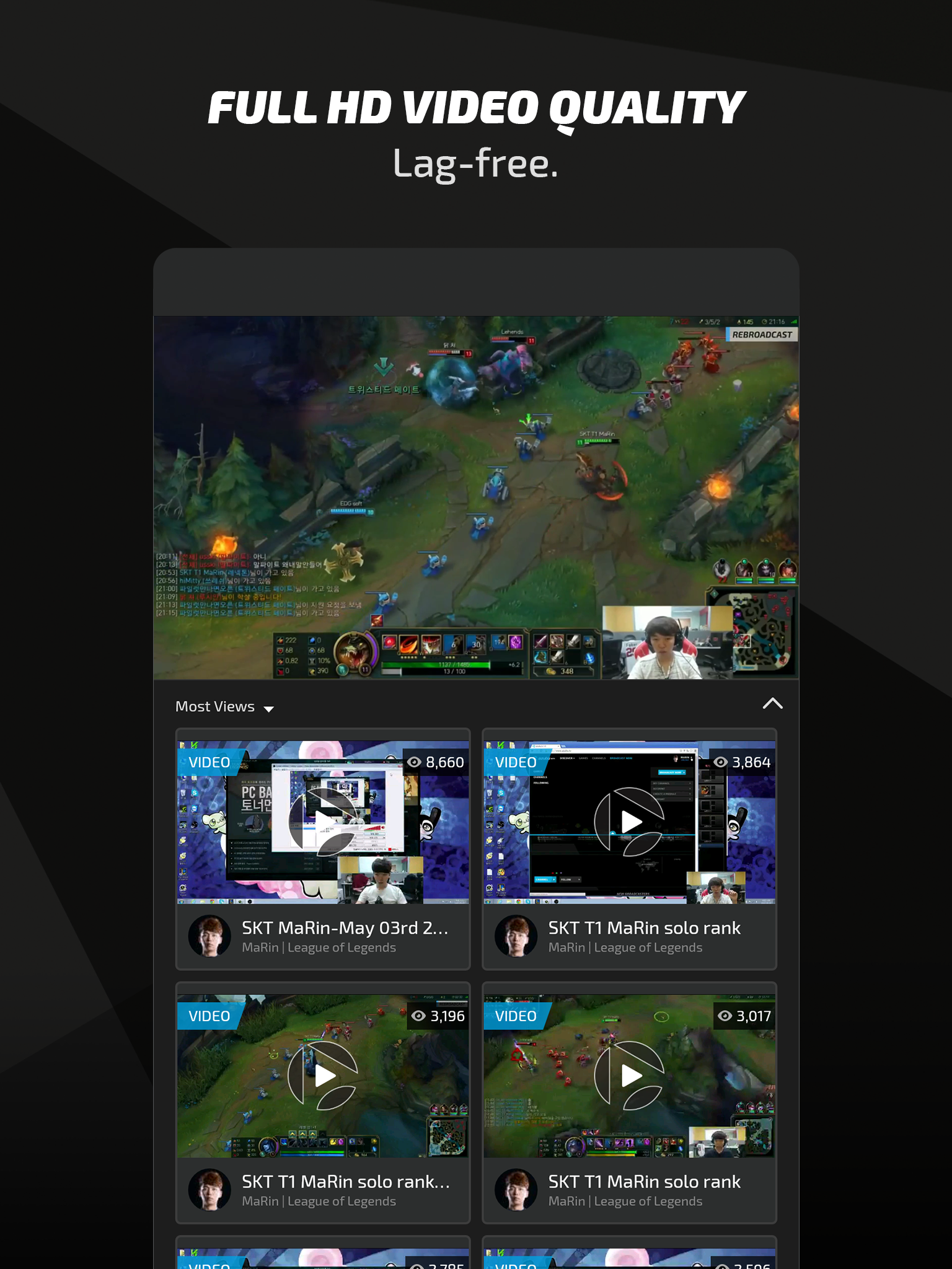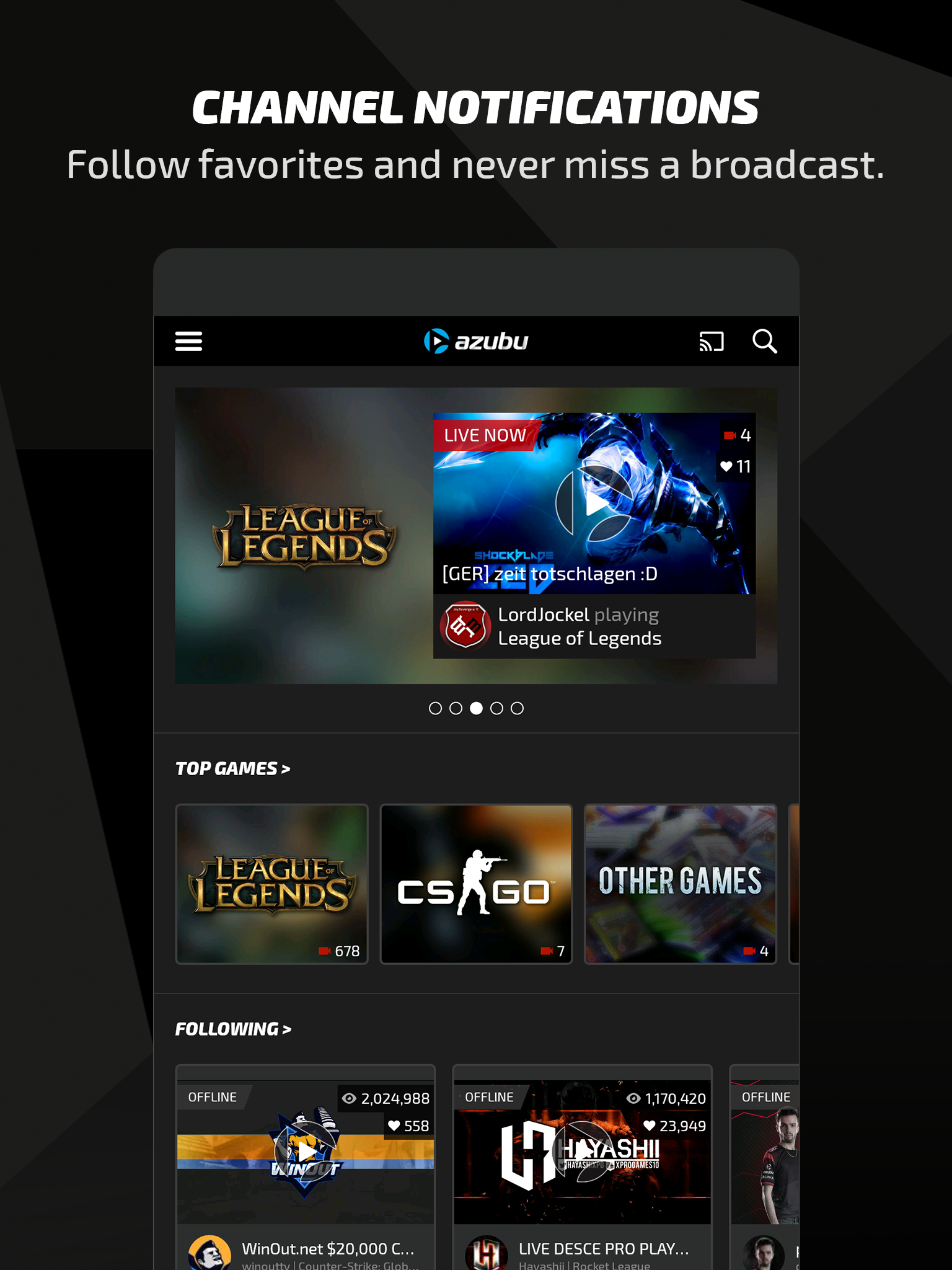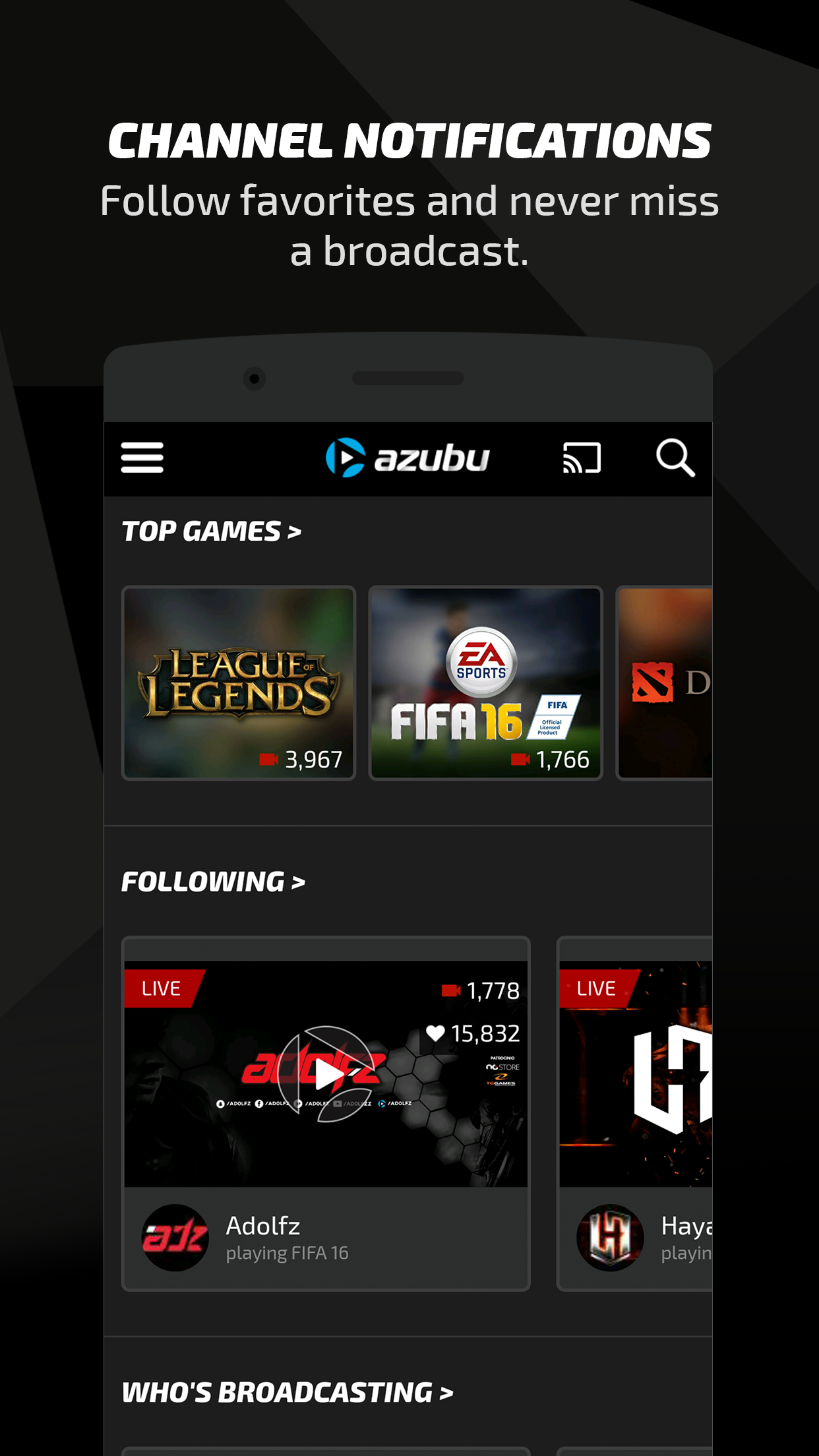 The Azubu TV mobile app! Your favourite high definition, lag-free streams, with you wherever you go. Available for free. All of the features from our main site, Azubu.tv, are included. Chat with everyone else that's watching or load up a VOD that you missed from earlier. WATCH YOUR FAVOURITE ESPORTS ON YOUR PHONE AND TABLET Watch live and on-demand videos on your favourite devices with the entirely redesigned Azubu mobile app, now with tablet support. We’re giving you more screen space to find the eSports content you want to watch. A true full screen experience, for every screen you want to use. The app provides you with all the great content you want and are familiar with on Azubu.tv. GET CLOSE TO THE ACTION WITH FULL HD STREAMING We want you to have the clearest, fastest mobile experience possible. The Azubu mobile app supports lag-free, full HD video resolution of up to 1080p, anywhere in the world. FOLLOW YOUR FAVOURITE PLAYERS, TEAMS AND CHANNELS EXCLUSIVELY ON AZUBU Follow the best players and teams exclusively on Azubu, such as Faker, Rush, Espeon, Yellowstar, Skyred and many others. If life gets in the way and you do miss a stream, VODs are just a click away so you’ll always be able to catch the action you want to see. CONNECT WITH BROADCASTERS AND THE COMMUNITY Chat in real-time with players and fans right from your mobile device. You become connected to and a member of an engaged and passionate eSports community. MOBILE NOTIFICATIONS Set notifications for the teams, players, channels and tournament coverage you want to watch, so you’ll never miss the action. VODs ON YOUR MOBILE DEVICE VOD support on mobile. Never miss a thing even in different time zones.
