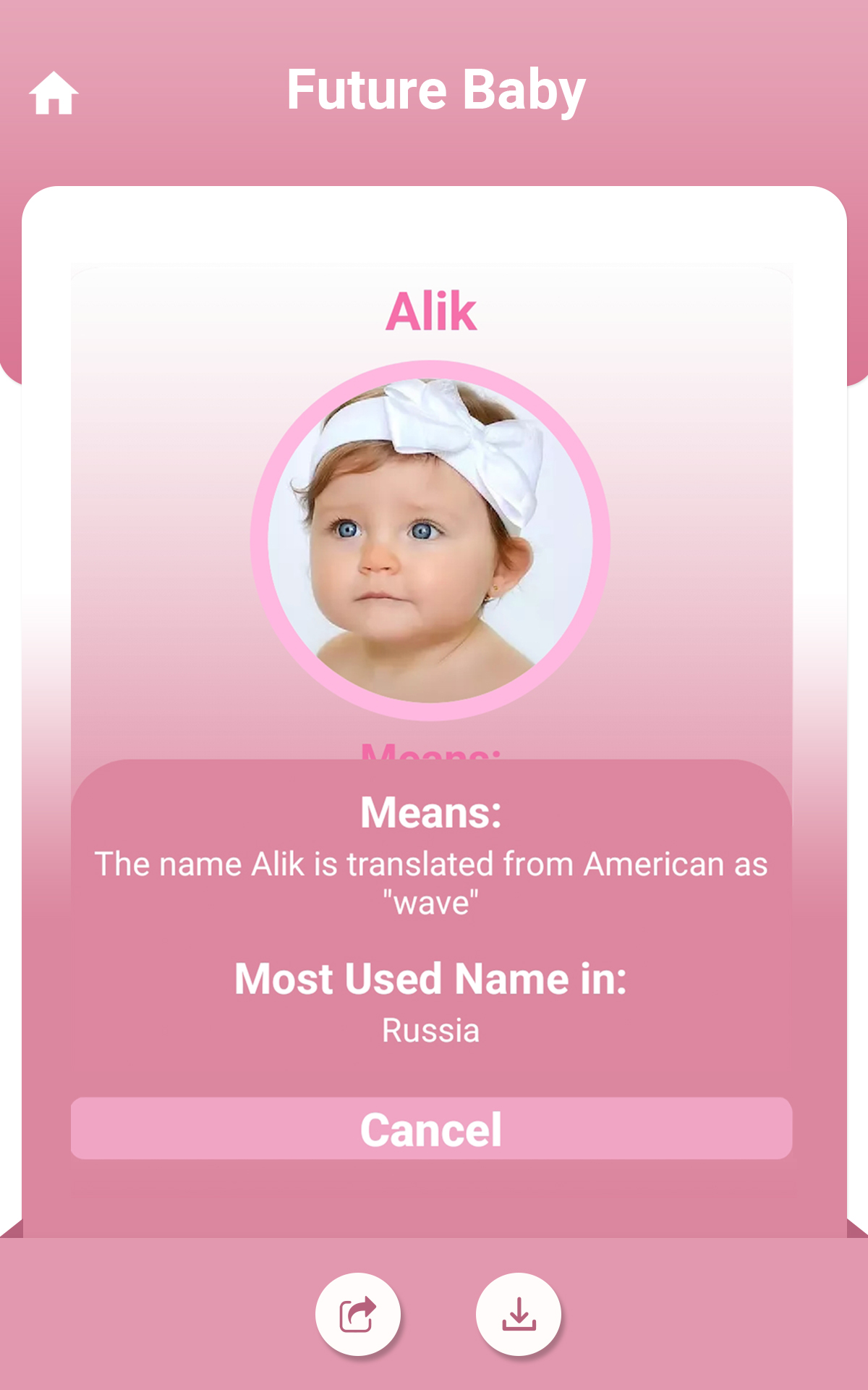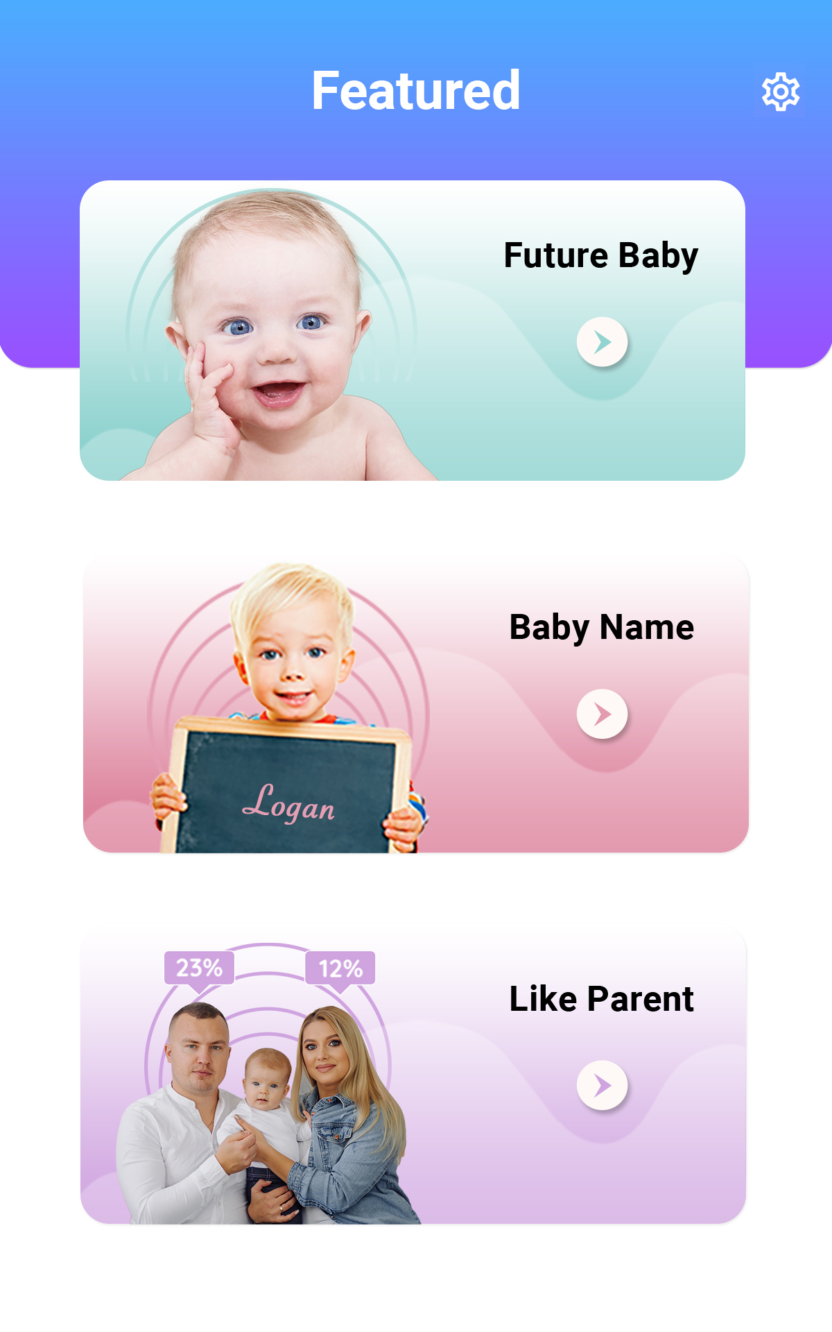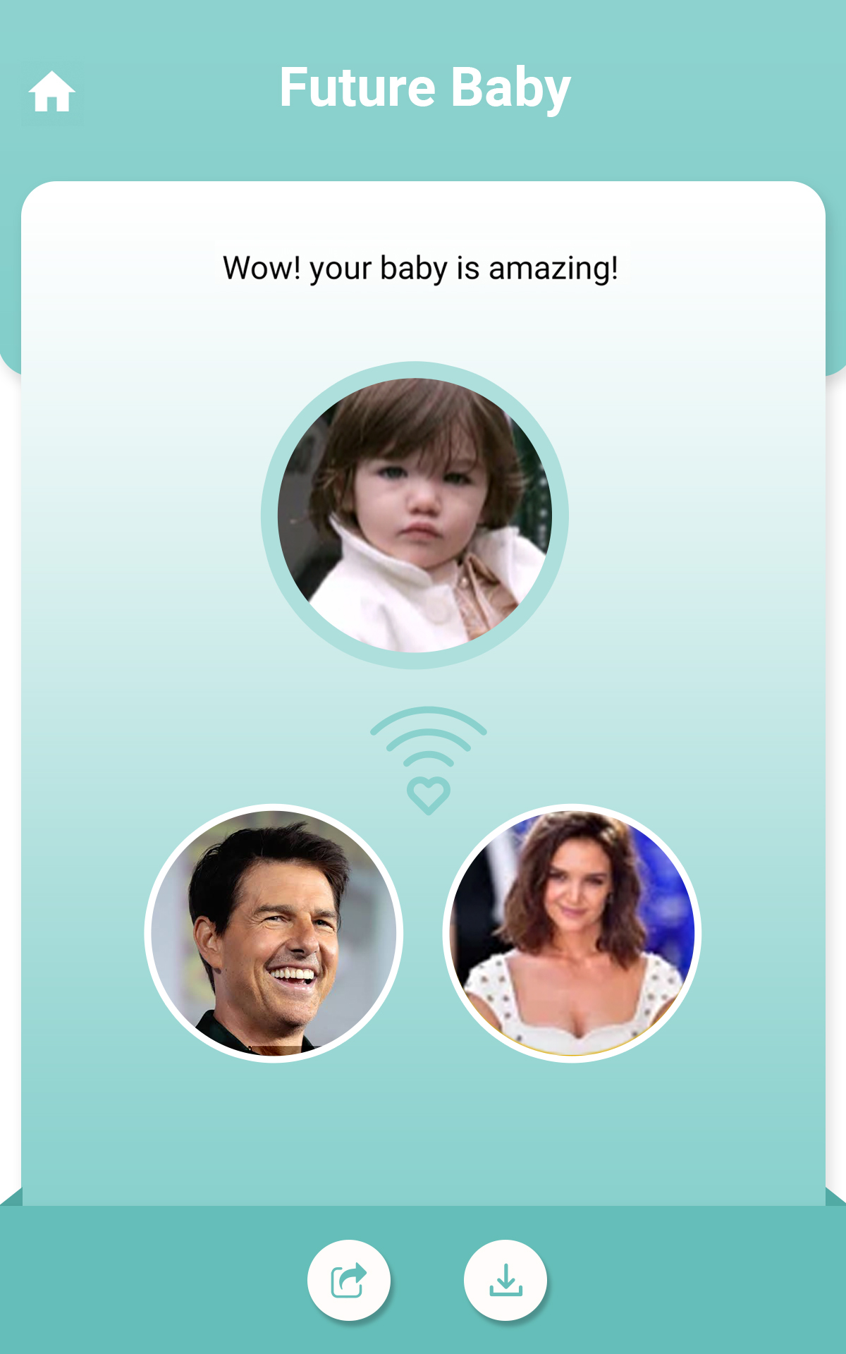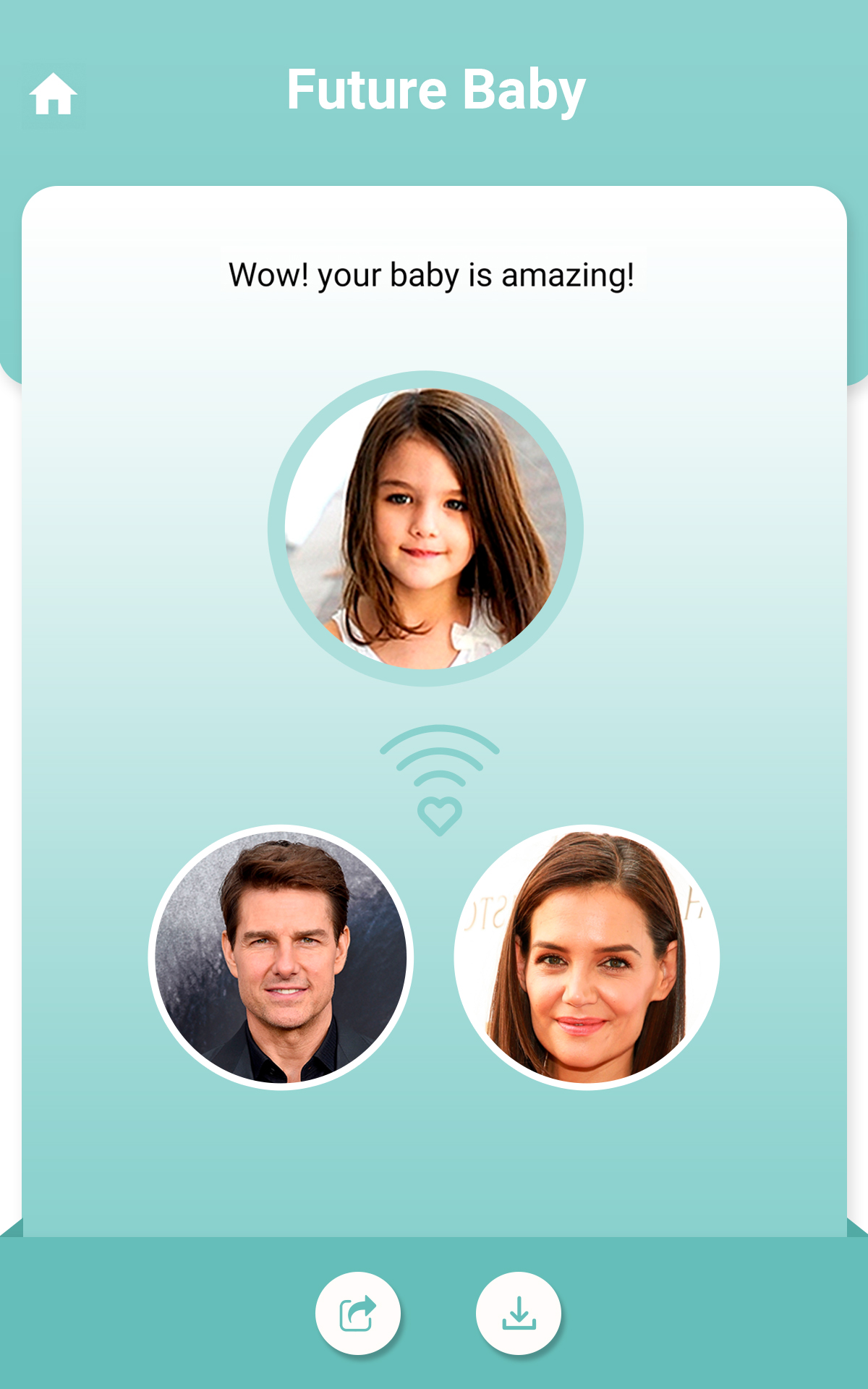 AI Baby Generator will predict your future baby face. Have you ever thought How will my baby look like? or What will my baby look like? If yes, then this application “Future Baby Generator” is perfect for you. Future Baby Generator uses advanced artificial intelligence (AI) algorithm. We use the newest facial recognition technologies to analyze faces of Mother and Father and generate an image of your cute baby. You can see the baby face with this Baby Maker app. App consists of 2 features:- 1- Future Baby Generator (Make a baby) You need to follow below steps for baby face generator. ◆ Choose photos of Father. ◆ Choose photos of Mother. ◆ Press on the “Check Future Baby” button and wait for a second. Future Baby Generator will use the artificial intelligence and make a baby for you. 2- Like Parent (Baby Maker percentage) You need to follow below steps to predict your child match percentage with Mom and Dad. ◆ Choose photos of Father. ◆ Choose photos of Mother. ◆ Choose photos of your cute baby. ◆ Press on the “Check Analyse Child” button and wait for a second. Baby Maker will use the artificial intelligence and analyse the percentage of Mom and Dad match with your baby. 3- Baby Name (Name of your cute baby) ◆ Press on the “Baby Name” button. ◆ You can check list of Baby Names. Origin of the Name and description so It will be easy for you to conclude your baby name. Future Baby Generator is now simple and you need to keep below points in mind to achieve the best results: ◆ The images are of high quality, good lighting condition. ◆ Face looking directly at the camera. ◆ Face without beard. ◆ Choose Future Baby’s skin tone. Find out how you and your partner's baby face can look like with this baby maker app!!! Try it with your boyfriend's/girlfriend's photo and amaze your partner and friends! Check it now this Baby Maker app and make a baby face for fun!!!