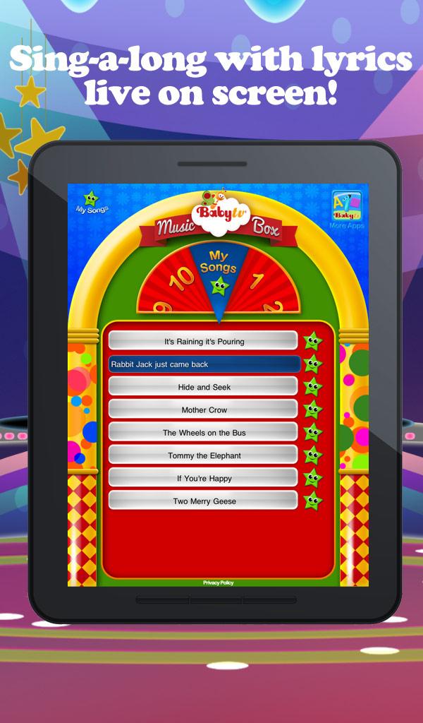 With 95 popular songs this ‘Baby Rhymes' app allows you and your child to listen and sing-a-long to nursery rhymes including The Wheels on The Bus , Baa Baa Black Sheep, Old MacDonald, Twinkle Twinkle and many more. Songs are sorted into 10 individual playlists and the ‘My Songs’ feature allows you to create your own playlist of all of your favorite songs and rhymes.