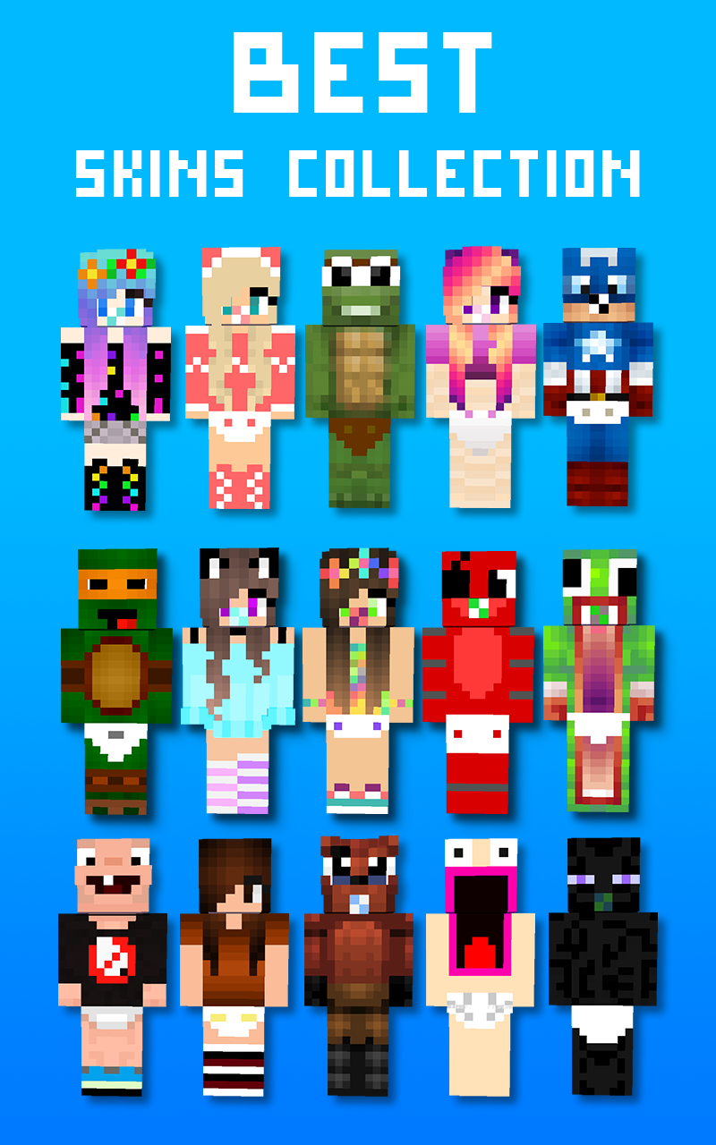 300+ popular skins in high quality, which will appeal to every player in multiplayer mode. Also you will meet skins: herobrine, girls, boys, letsplayers, superheroes, turtles, homeless and others!