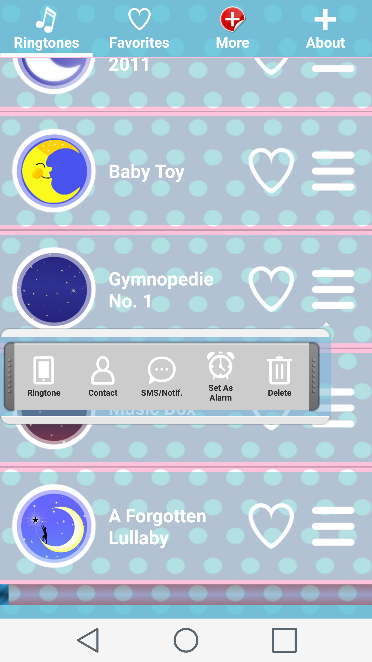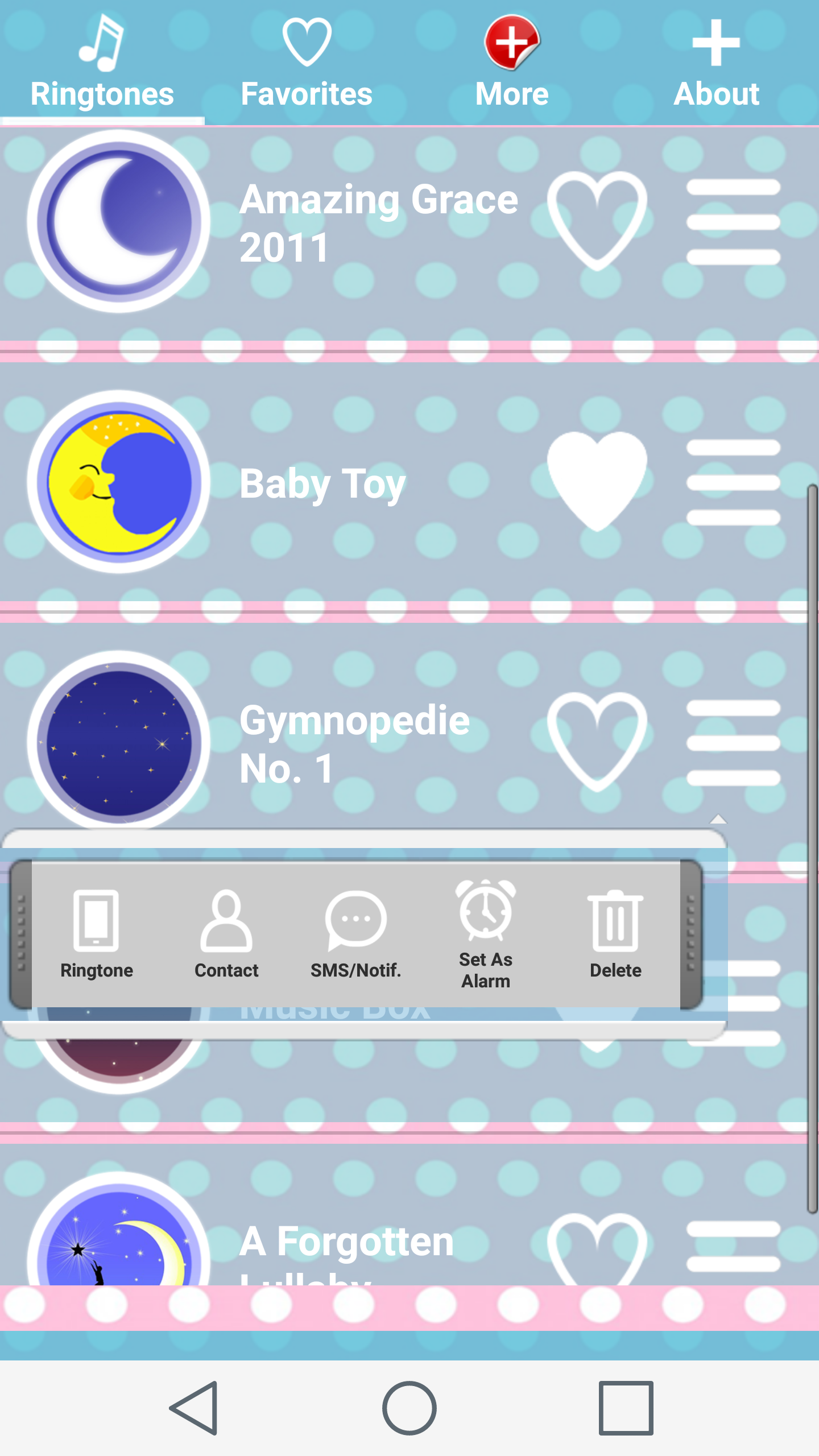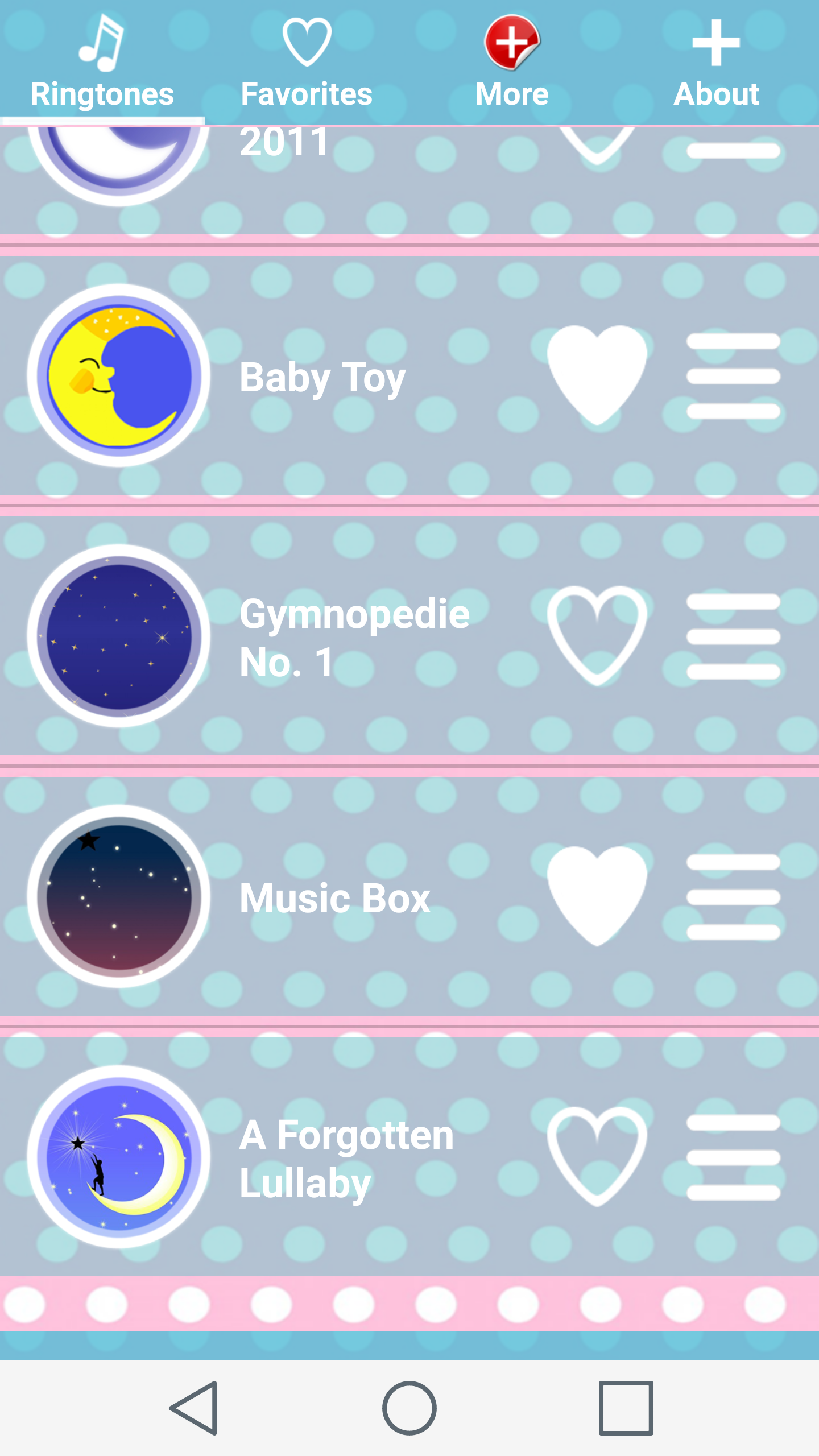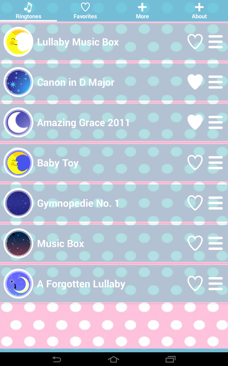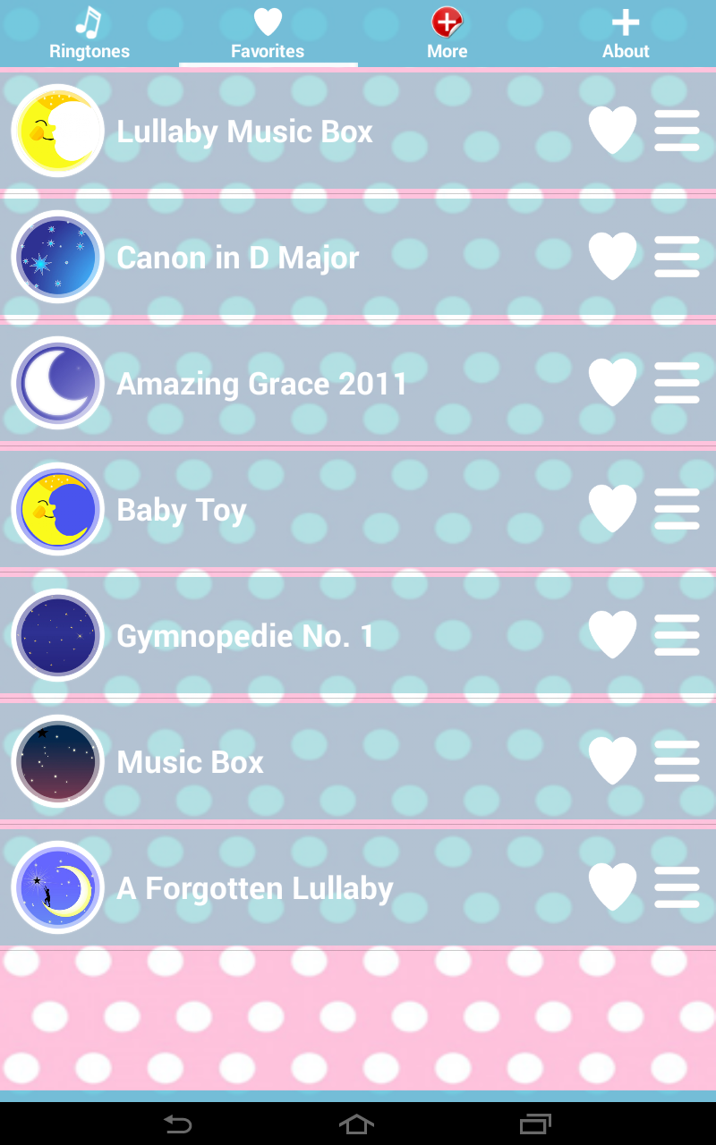 If your baby can't sleep than we have best lullaby music for you. If your baby keeps you awake all night long then our Baby Sleep Music will help you for sure. With this best ringtones you won't never again go to work tired and exhausted. Our new cool baby songs free will help your baby for sure. And not only your baby, they will also help you. Lullaby music is great way to keep calm you and to make you sleep. We have great collection of lullaby songs for babies. With this app you can be sure that your baby will have great and comfortable sleep all night long. We choose the best lullabies for babies and your baby will adore them for sure. You will never be awake all night long because your baby is crying and don't want to sleep. Amazing, isn't it? But, that is not all. If you want to wake up with a smile on your face you can set one of these popular ringtones as alarm sounds on your Android™ phone. You can, also set some of these lullaby songs as SMS notification on your phone and you will enjoy in the best lullaby music wherever you receive message. Your baby will be happy, you will be happy with our new Baby Sleep Music. Music box lullaby in one place just for your Android™ phone. Your job is only to download this free ringtones application and to enjoy in great baby sleep sounds. And all of these great things for free. Babies are the most important thing in the world so, they must have only the best things. Download our Baby Sleep Music application, relax and enjoy with your baby.