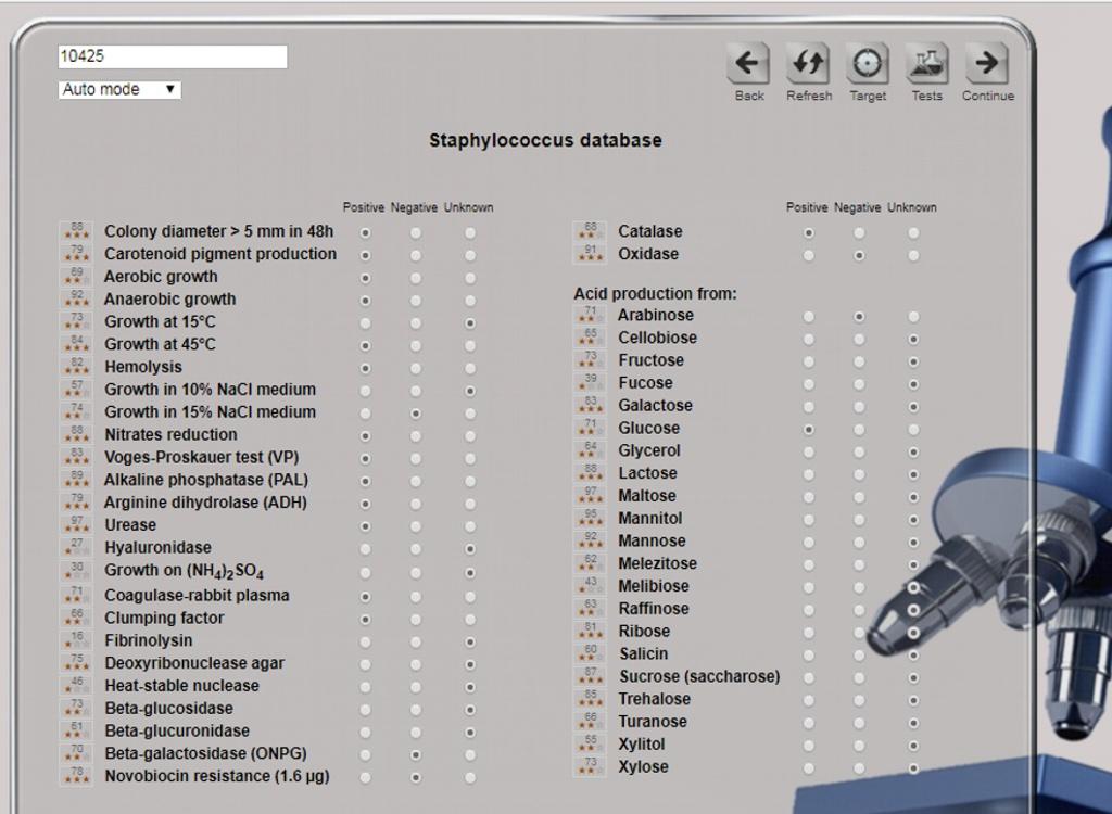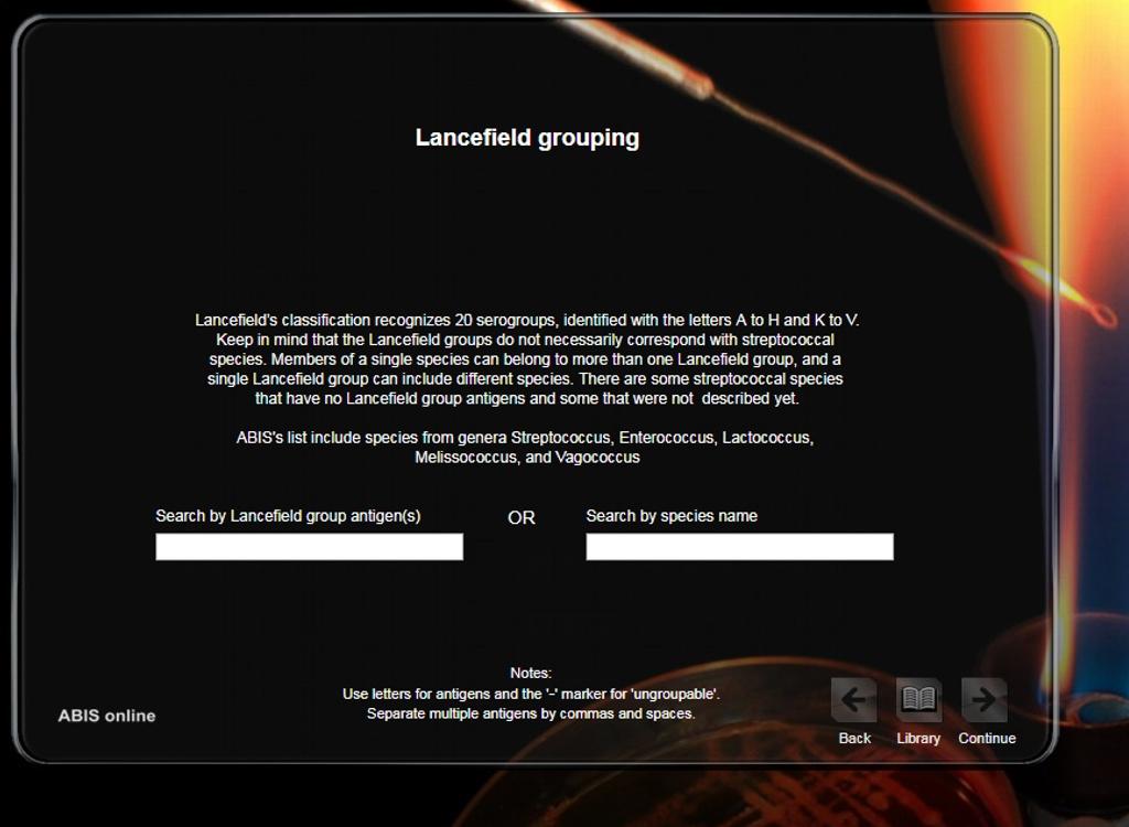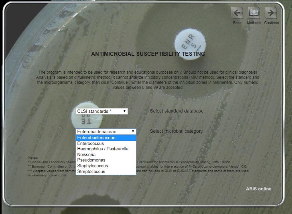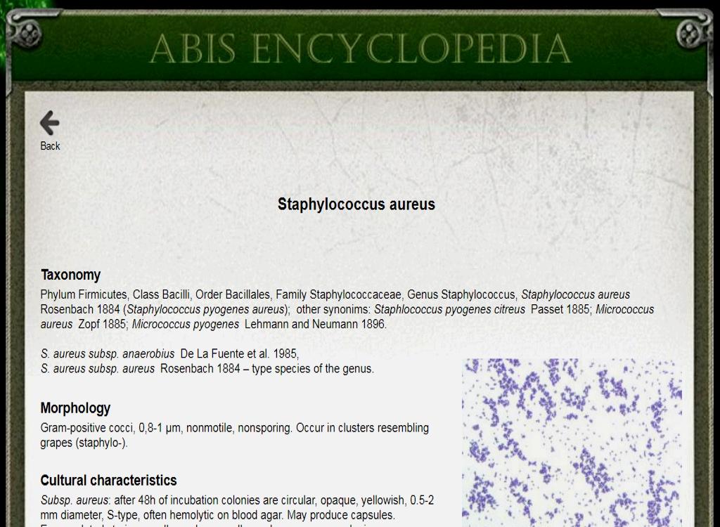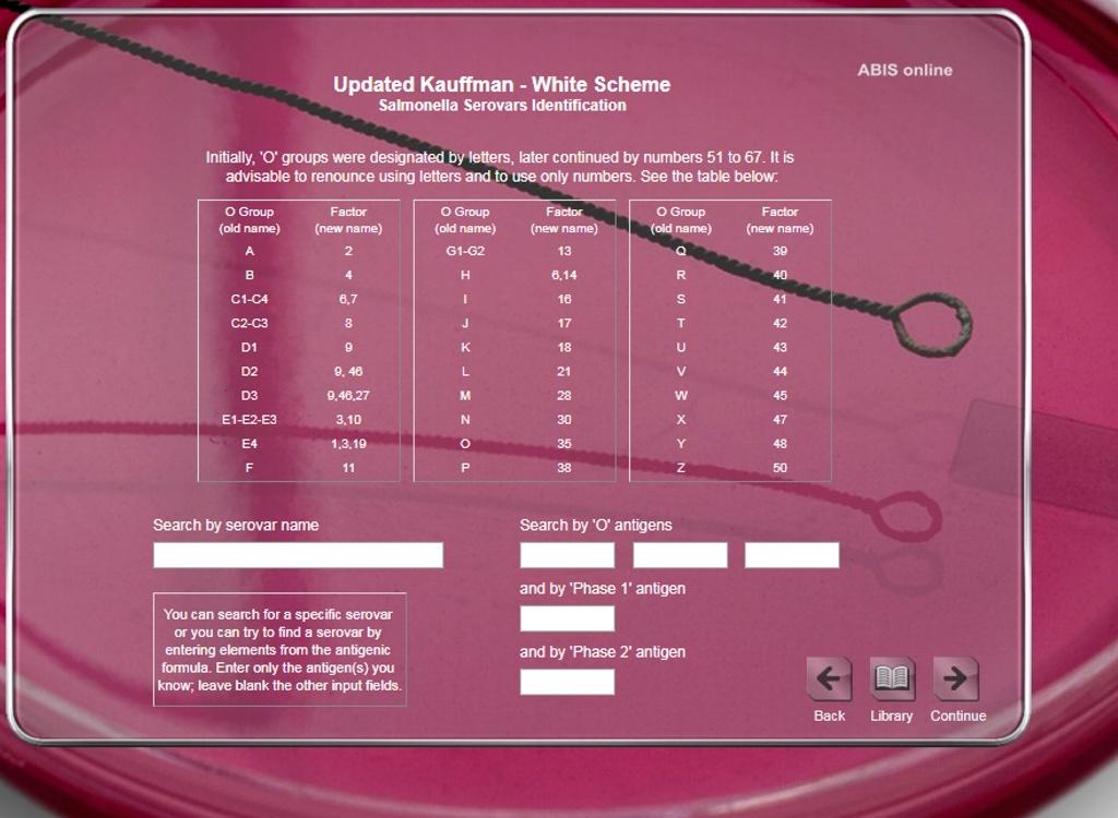 ABIS online - Advanced Bacterial Identification Software is a laboratory tool for bacterial identification, based on morpho-biochemical characters, cultural characteristics, growth conditions, ecology & pathogenicity data. The program allows a great flexibility in choosing biochemical tests and is an alternative to commercial systems, code-books or identification tables. The software is linked with a germs Encyclopedia, the Kauffman-White scheme for Salmonella serovars identification, Lancefield grouping for streptococci and an antibiogram interpreter. Main identifiable taxa: Enterobacteriaceae, Pasteurellaceae, Campylobacteraceae, Bacillaceae, Lactobacillus, Staphylococcus, Streptococcus, Clostridium, Vibrio, Listeria, Erysipelothrix, Corynebacterium, Neisseria, Chromobacterium, Aeromonas, Alcaligenaceae, Pseudomonas and related species. More than 1600 species are included in databases and in bacterial encyclopedia.