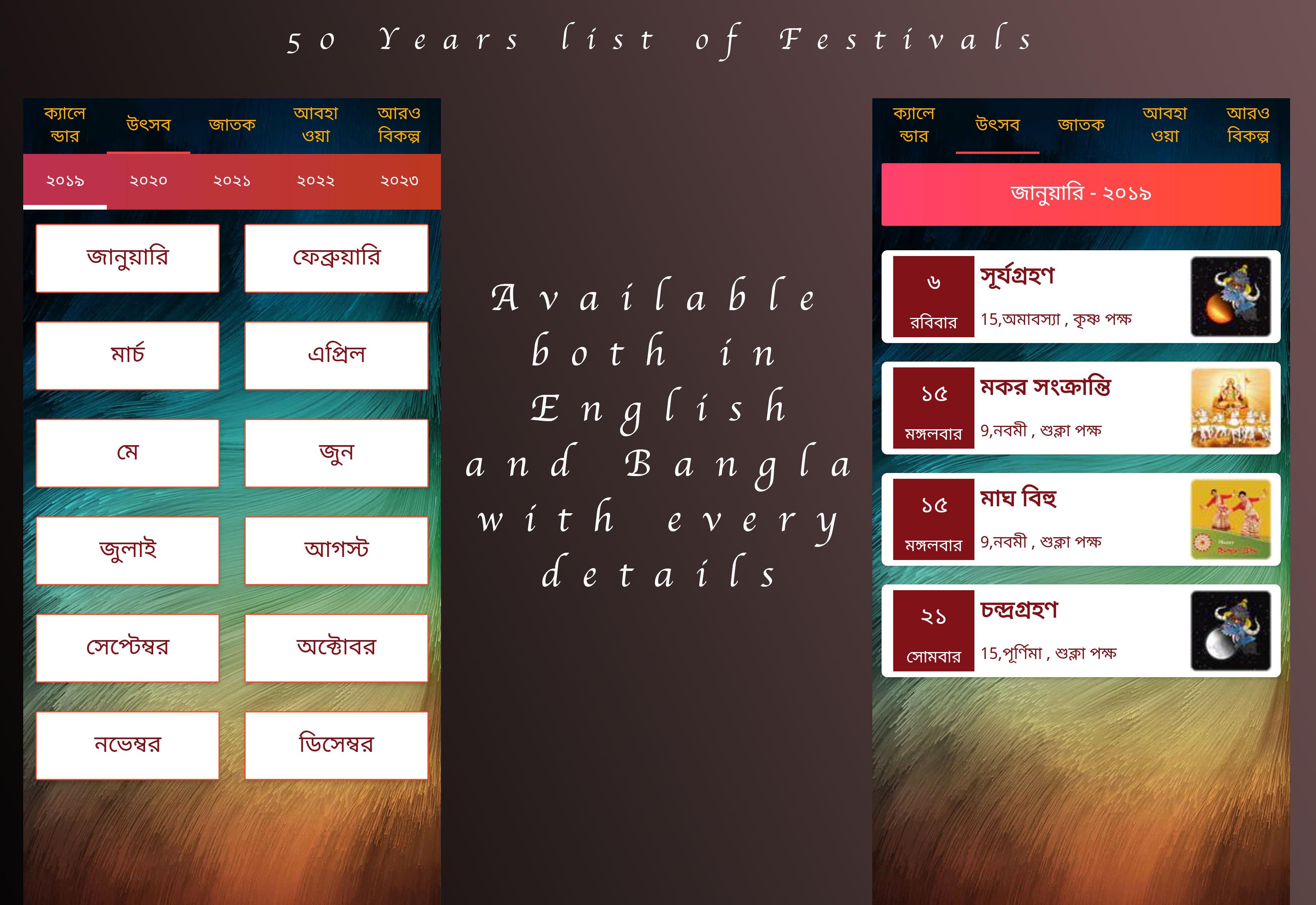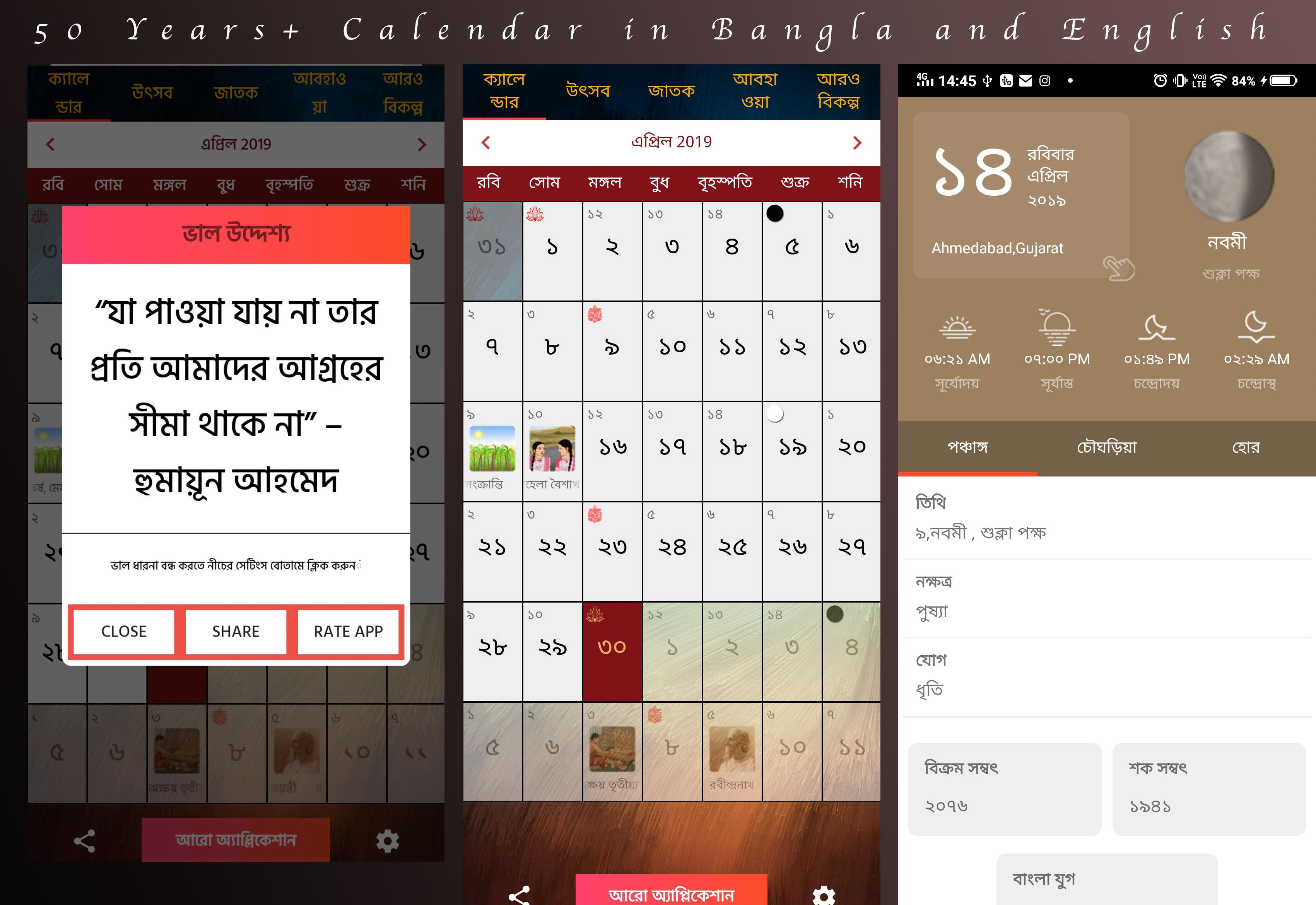 Bangla Calendar (Package Name: bangla.calendar.panjika2019) is developed by Oh Its Trending ! and the latest version of Bangla Calendar 2021 - Panjika 1.42 was updated on April 30, 2019. Bangla Calendar 2021 - Panjika is in the category of Books & Reference with the feature Multi-device Sync. You can check all apps from the developer of Bangla Calendar 2021 - Panjika and find 11 alternative apps to Bangla Calendar 2021 - Panjika on Android. Currently this app is for free. This app can be downloaded on Android 4.1+ on APKFab or Google Play. All APK/XAPK files on APKFab.com are original and 100% safe with fast download.