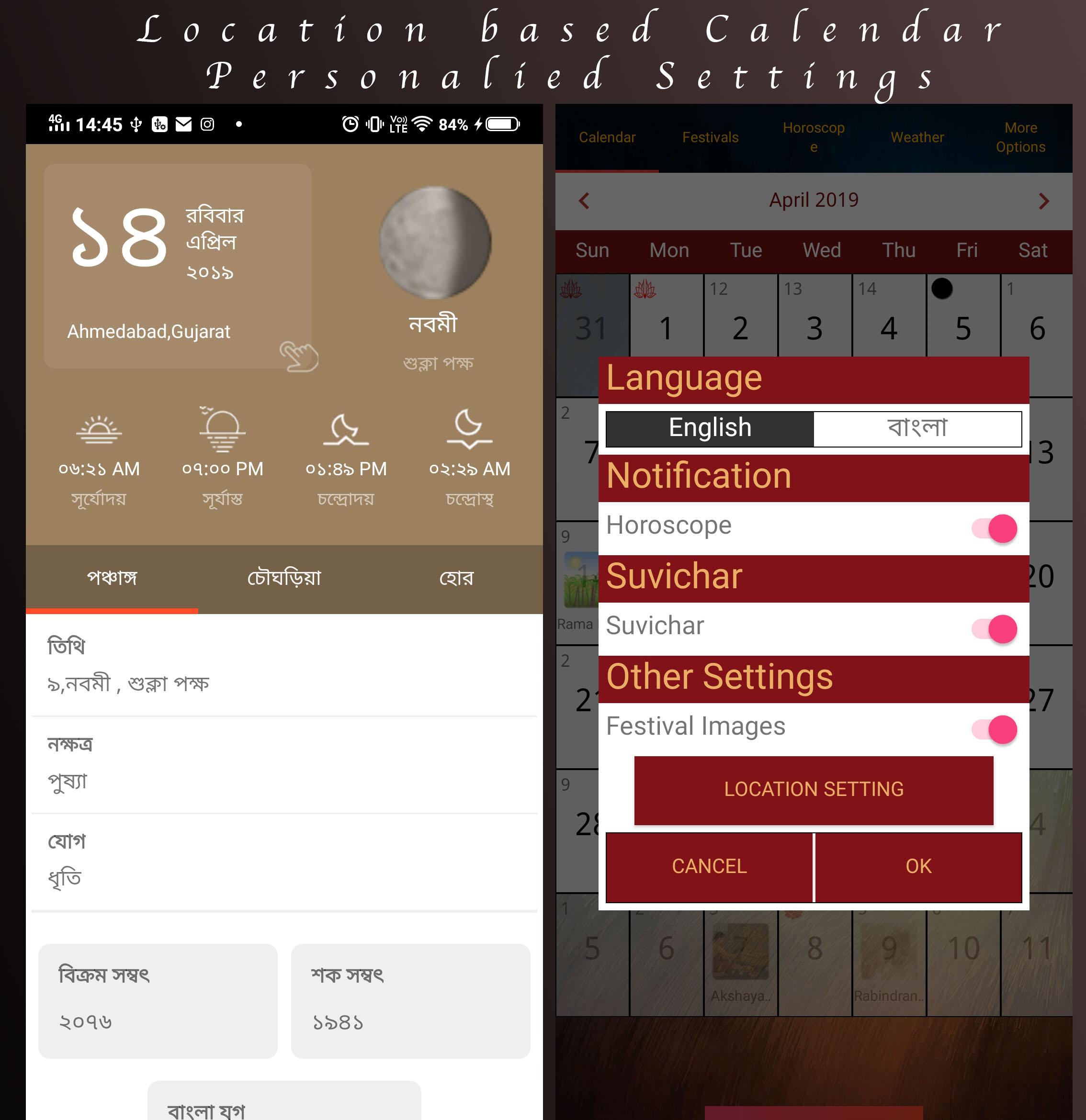 Bangla Calendar 2021 - Panjika 2021 with All Festivals, Rashifal, Sun/Moon Timings. Audio Rashifal (Daily, Weekly, Monthly, Yearly). Aap apna Rashifal Bangla me sun sakte ho. Weather Information Full Bangla Calendar Panjika of the year 2021 with all the Hindu festivals, Tithi, Vaar, Paksha, Karan, yoga, rahukal, dur muhurat, hora, Nakshatra in Bangla. Daily Rashifal, Weekly Rashifal, Monthly Rashifal, Yearly Rashifal. Any Date Any year, any month. Sun/Moon Timings of different cities. Bangla Calendar with list of all festivals. Features : - Any year, Any Date calendar - Click Calendar - Bangla and English both Language Available - Muhurat and Festivals for all Years - Automatically selects current month. - You can view your today's rashifal, weekly rashifal, monthly rashifal and yearly rashifal. - You can check out timings of sun/moon. - Bangla calendar 2021 contains details of Bangla festivals, tithi, public holidays and other key events. - Bangla calendar contains Holidays list 2021 - Calendar for year every year. - The calendar will help you find when the next Ekadashi is, what the Paksha (Sud,Vad) on a particular day is, when the next Poonam is (Full Moon) or the next Amavasya is.