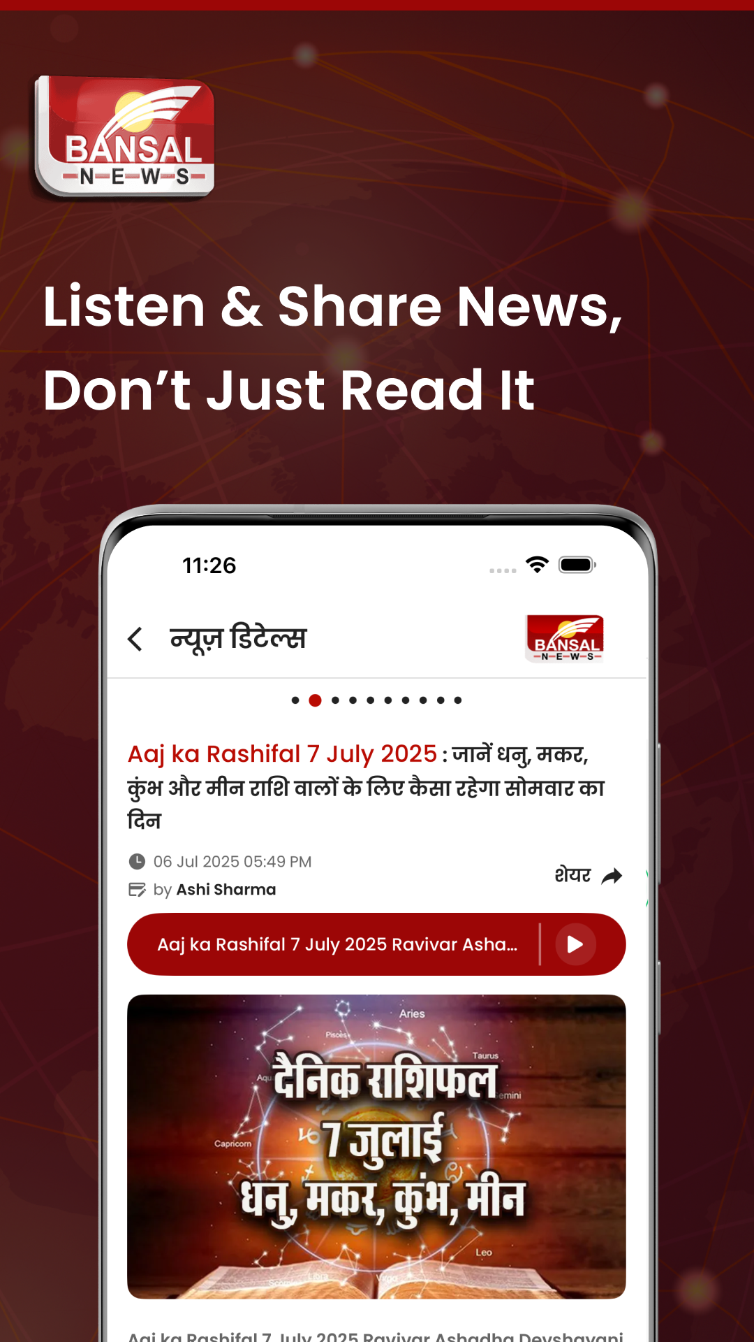 With Bansal News' Audio Playlist feature (ऑडियो समाचार प्लेलिस्ट), you can now listen to back-to-back news stories in Hindi, just like your favourite music playlist. Whether you're cooking, driving, working out, or simply relaxing, stay updated without looking at your screen.