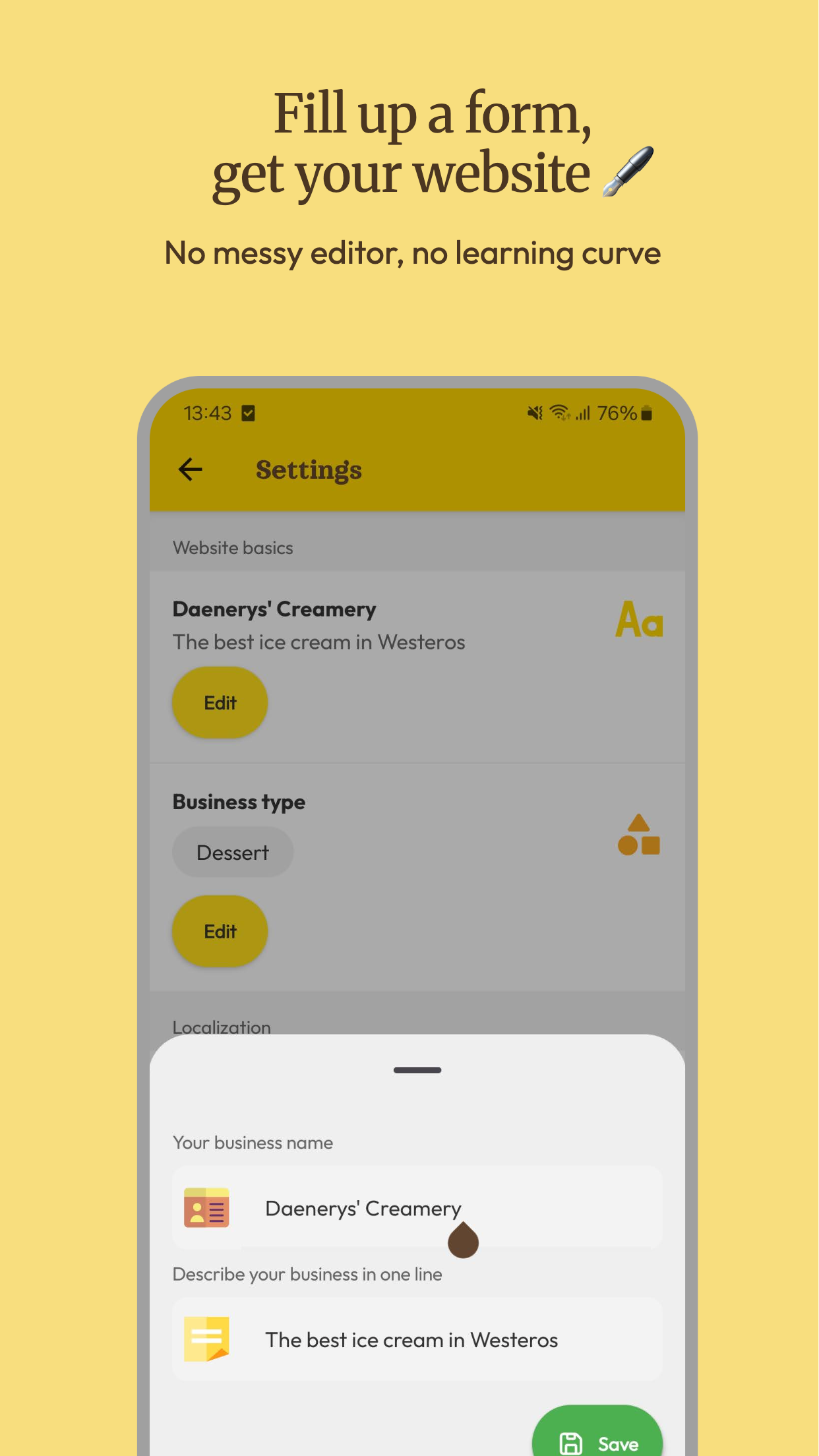You have a business, and you need a website. But the other website builders are way too complicated to use. Your time is precious, Baya is here to fix this. Baya is a super simple website builder for small businesses. You get the whole website done right inside the app. 1. No drag and drop, no template, no time wasted choosing rearranging text a thousand time: Only fill up your content in the app, and our clever machine will do everything else for you. 2. You do the easy part, we take care of the boring stuff: That includes latest design, layout arrangement, color scheme, search engine optimisation (SEO), show up on search engine, website speed, analytics, mobile-friendly, desktop-friendly, human-friendly, website hosting, image Hosting, image resize, social media integration... 3. You are in control: Change anything at anytime, for FREE. 4. Choose what to show, and hide the rest: You can pick from the many "blocks" we offer, like Contacts, Products, Gallery, Operating Time, Why Us... You can show or hide any block at anytime. 5. We scale up with you: As your business grows, Baya does not restrict you. Add as many products, services, or images as you want, or tell your customers a thousand reasons to choose you. You have the freedom. 6. Choose from the many designs we have. Choose different design per block. one click to start using. 7. Smart, but you have the control: Changing theme colour? Show/Hide something? Do it anytime, right in the app. Oh ya, it's free to use too 😮 Whether you are a restaurant owner, a barber, a cafe entrepreneur, a coach or a personal trainer, Baya makes it easier than ever for your business to be seen online. Why are you still reading this? Download now!
