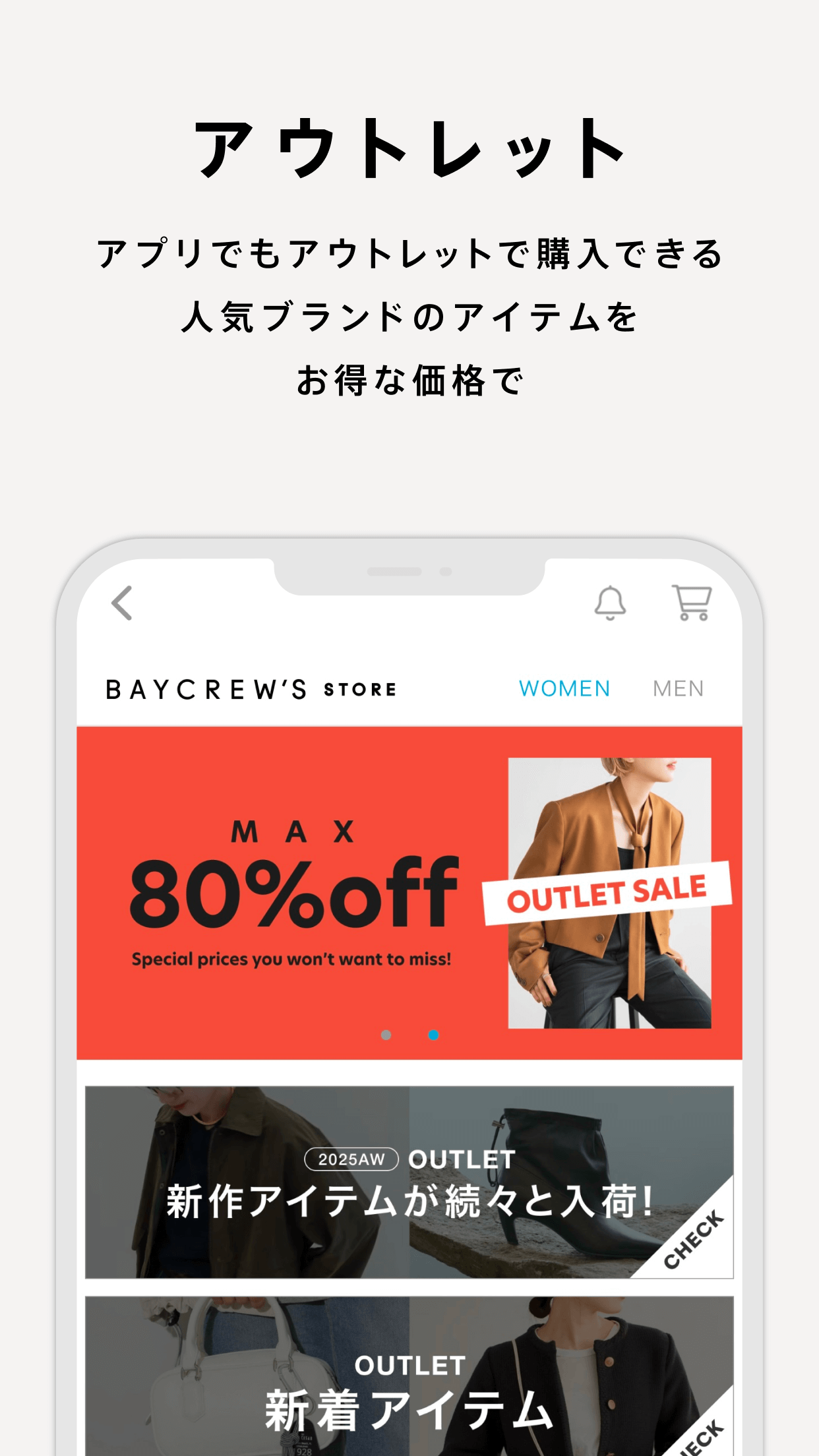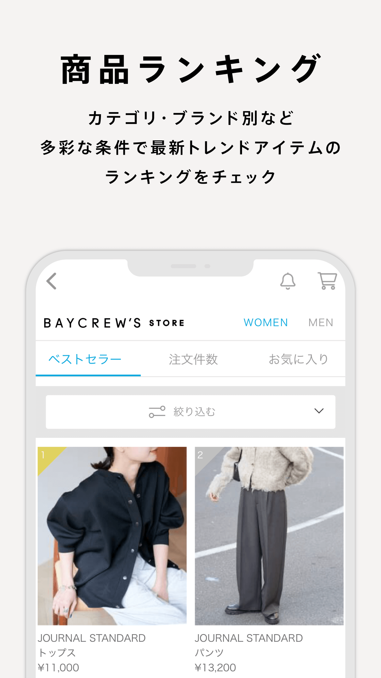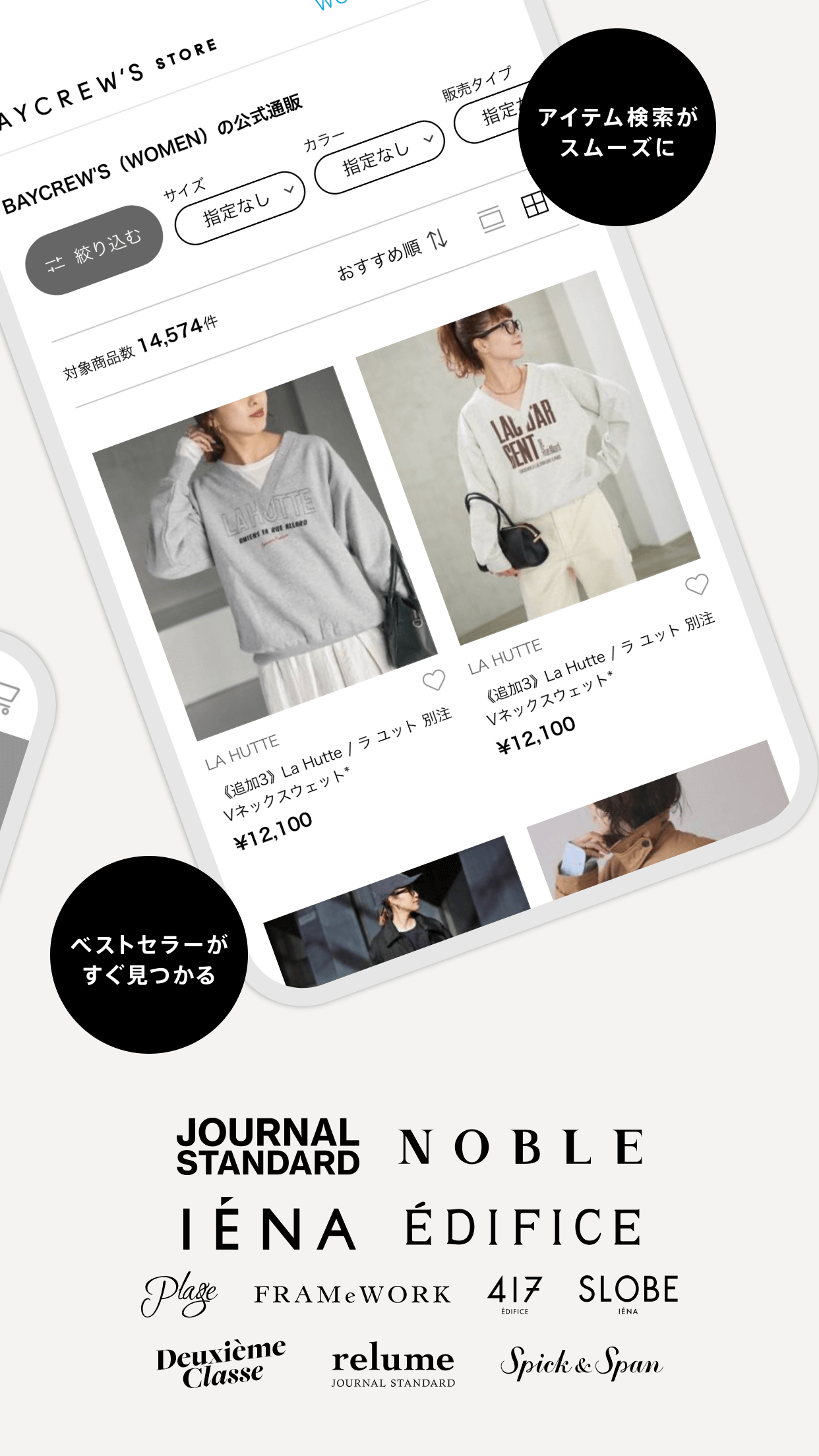 ~BAYCREW'S Official Fashion Online Shopping App~ The official BAYCREW'S app brings together popular brands. Check out the latest trending items from brands like IENA, JOURNAL STANDARD, and EDIFICE faster than anywhere else. ~Introducing the BAYCREW'S Official Fashion Online Shopping App~ ■Membership Card Easily display your membership barcode, which can be used for in-store purchases. ■Product Rankings Not sure what to buy? Check out our product rankings. You'll see popular items at a glance, and you'll be able to find the perfect fit, mix and match, and enjoy a satisfying shopping experience. ■Favorites Add items you like to your "Favorites" and create your own personalized item list. Automatically sync with your PC or other smartphones, allowing you to browse and purchase at home or on the go. ■Snaps Shop staff recommend outfits, updated daily. Items worn by staff can be purchased through the app. ■Reviews Includes honest feedback based on real experiences, including customer age, height, and body type. You can refer to the "real fit" of items on people with a body type similar to yours, eliminating the anxiety of choosing the right size that's unique to online shopping. ■Product/Store Search Not only can you search for products by detailed criteria such as brand, category, or topic, but you can also quickly find nearby stores from your current location. You can also check store addresses, business hours, and inventory status in real time, making it easy to try on and purchase items in-store. ■Notifications Turn on push notifications to receive the latest information, from "your favorite items now on sale" and sale information to the latest news you care about. ■ Brand List JOURNAL STANDARD IENA SLOBE IENA EDIFICE 417 EDIFICE PULP Plage Spick & Span U by SPICK&SPAN ~The official BAYCREW'S fashion online shopping app is recommended for~ ・You like BAYCREW'S brands, such as JOURNAL STANDARD and IENA ・You want to easily check out trending items using the official app ・You want to efficiently find the best-selling items in a ranking format ・You want to receive price drops on clothes you've been eyeing ・You want to carefully read authentic wear reviews (including height, body type, and age) before making a purchase ・You want to be the first to know about special offers, such as pre-orders for new items and limited edition items ・You want to get great deals on brand-name items through outlet and sale information ・You want to check in-store inventory using the app before going to the store ※ If your network connection is poor, the app may not function properly, such as not displaying content. [About Push Notifications] We will notify you of special offers via push notifications. Please set push notifications to "ON" when you first launch the app. You can change the on/off setting after launching the app. [About Copyright] The copyright of the content contained in this app belongs to Baycrew's Co., Ltd., and any unauthorized copying, quotation, transfer, distribution, alteration, modification, or addition is strictly prohibited. Recommended OS Version: Android 12.0 or higher For the best experience using the app, please use the recommended OS version. Some features may not be available on OS versions older than the recommended version.