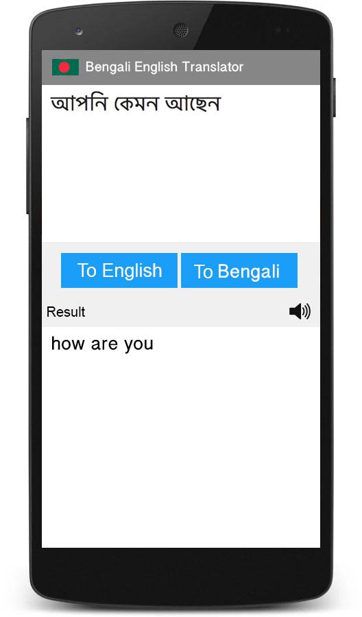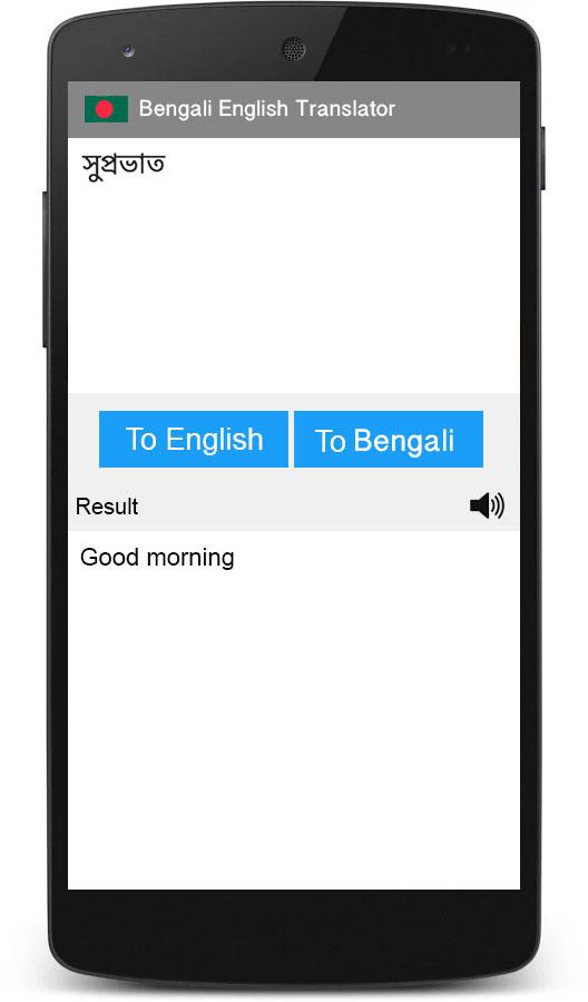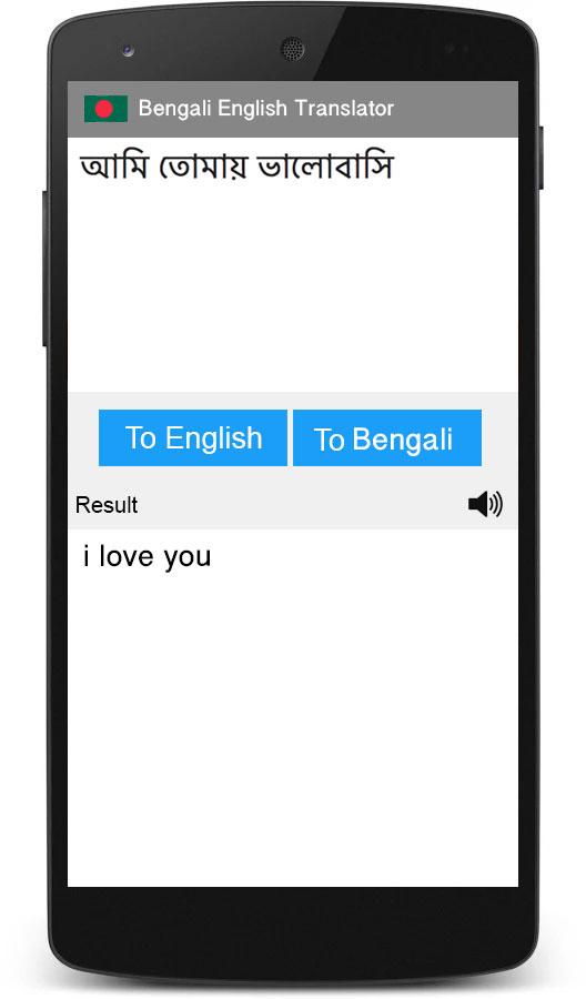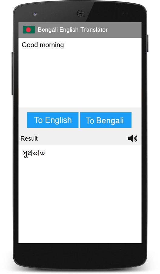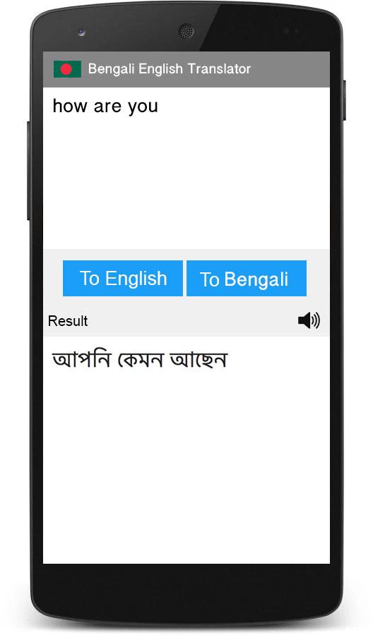 Translate text, word or sentence from Bengali to English or from English to Bengali language. You can use this apps as a Bengali to English dictionary or English to Bengali Dictionary too. Uses of Bengali English Translator are following: - Bengali English Translator - English Bengali Translator - Simple User Interface(Easy to use for Translator) - Listen translated text, sentence in English or Bengali - Used as a Bengali to English dictionary or English to Bengali Dictionary. - Social Media - Easily share with Friends and Family. Bengali is popularly known as Bangla too. So, you can use this app for Bangla To English Or English to Bangla Translator. Facts about Bengali/ Bangla Language: - Bengali is primary language in Bengal, India. - Bengali is an official language of India and Bangladesh.