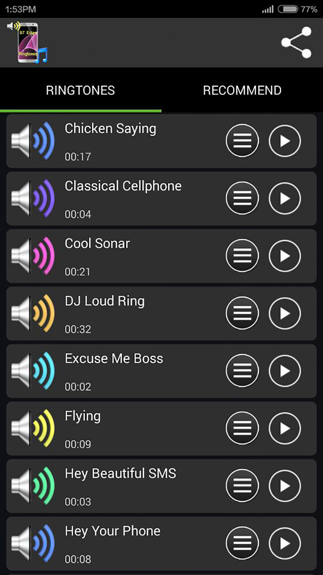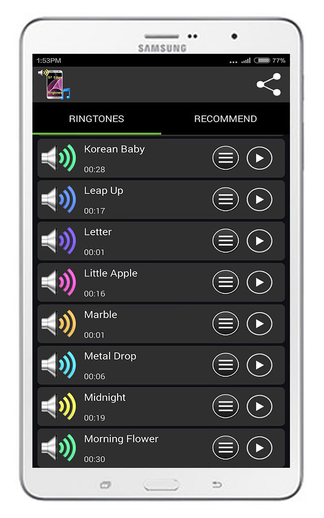 Ringtones for Galaxy S7 (Package Name: com.trfa.samsungs7) is developed by TRFA Ringtones and the latest version of Ringtones for Galaxy S7 1.5 was updated on June 26, 2023. Ringtones for Galaxy S7 is in the category of Entertainment. You can check all apps from the developer of Ringtones for Galaxy S7 and find 17 alternative apps to Ringtones for Galaxy S7 on Android. Currently this app is for free. This app can be downloaded on Android 5.0+ on APKFab or Google Play. All APK/XAPK files on APKFab.com are original and 100% safe with fast download.