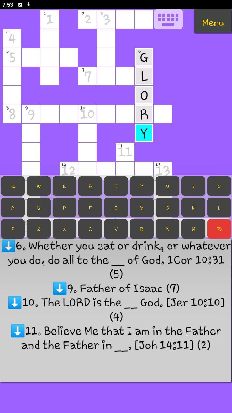 Enjoy playing Bible based crossword puzzles while you get edified! See how well you know the Bible! With over 2000 questions gathered from favorite and inspirational verses, historical accounts, Biblical characters (patriarchs, prophets, kings, judges, widows, prominent historical figures, heroes of faith, mighty men and women of valor, people with moral flaws, etc), the Gospels, the work of the Spirit, Jesus Christ, prophetic books, the reality and remedy for sin, grace and salvation, resurrection of the dead, Christian living, God's love, etc you will surely enjoy and be blessed. FEATURES - This app is like a Mustard seed. It's small in size (4MB) but comes with hundreds of questions in the database - Get extra questions by downloading them from our server. Simply press Menu -> Download more questions. There are 2000+ on the server - Each puzzle is unique, randomly created every time you choose "New Puzzle" - Has a custom Keypad that does not get in your way but gives a convenient way to read the puzzle questions even on small screens - Multiple background colors (themes) to choose from - Easy navigation through the questions - The database has a mix of both simple and cryptic questions, questions for those new in the Christian faith and questions for mature in the faith HOW TO PLAY - Tap in the white boxes when you want to type answers. The currently active cell will be highlighted - Tap in the empty space to hide the keypad. Click on the Menu to create a New Puzzle, Check Answers, change color themes and more - To navigate through questions: * Click on the arrows at the far left or right of the questions or * Swipe on them with two fingers or * Swipe on them with one finger May the __ of our Lord Jesus Christ be with you all. Amen. 2Thes 3:18; Rev 22:21