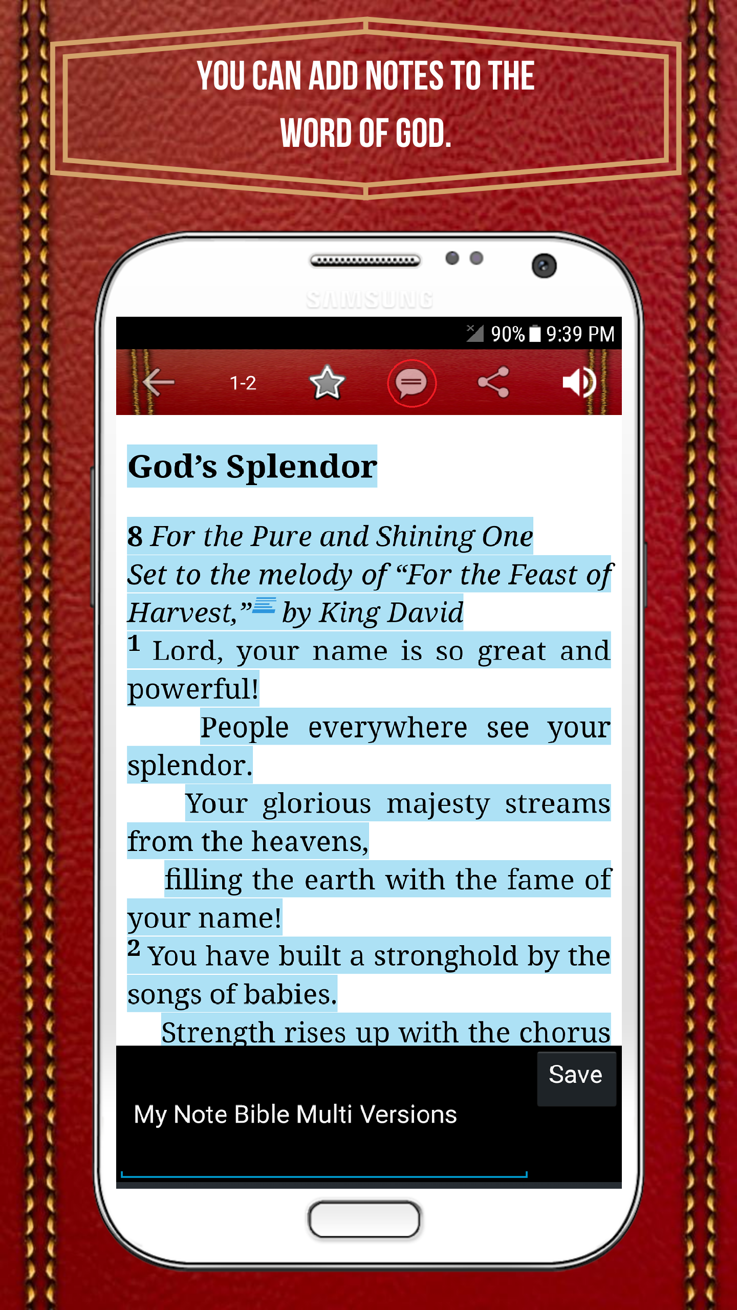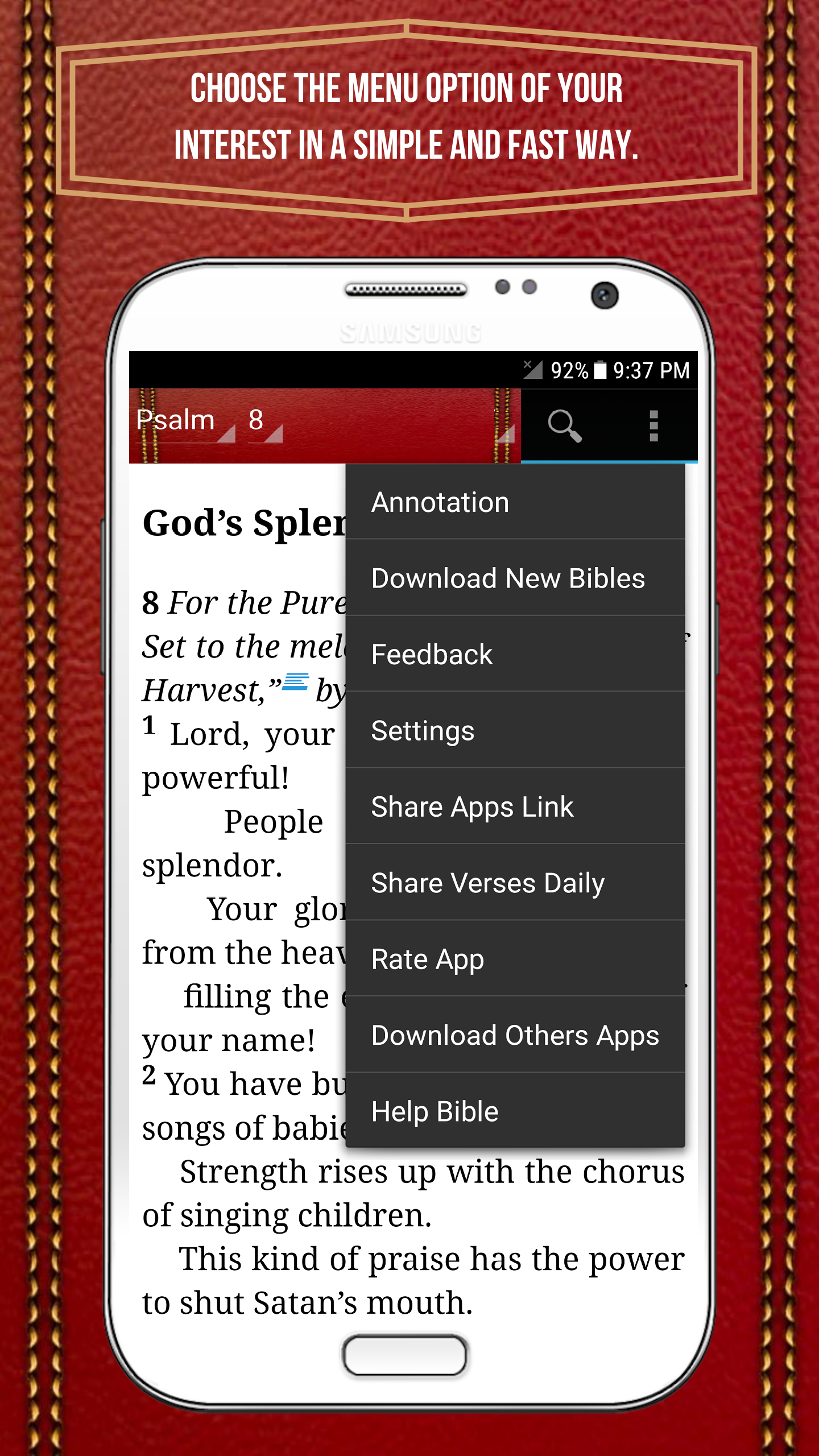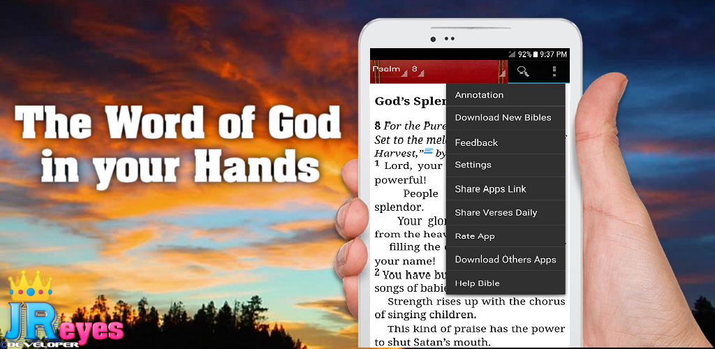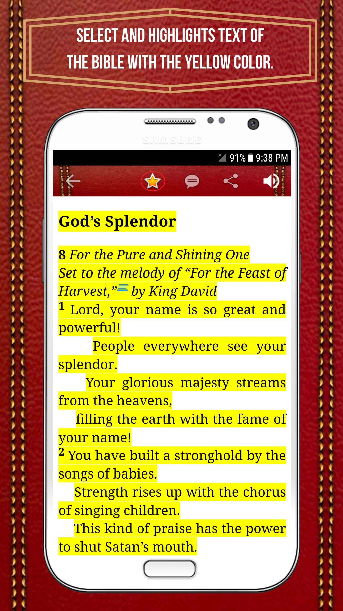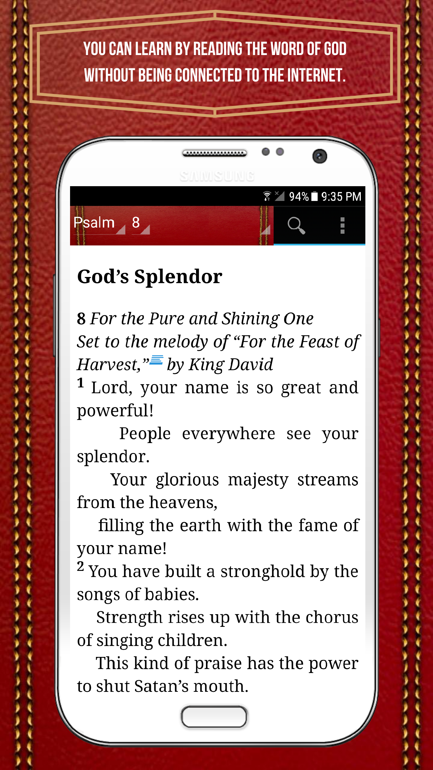 ✝️ Day and night mode to read the Bible. ✝️ Adjust the text size. ✝️ Add verses to favorites. ✝️ Bookmark your favorite verses and add notes. ✝️ It does not need an Internet connection for its operation. ✝️ Share your verses on social media with your brothers and sisters in faith ✝️ Advanced verse search. ✝️ Install or move the Bible from or to the SD memory. ✝️ Help. ✝️ Share daily word. ✝️ Notifications.