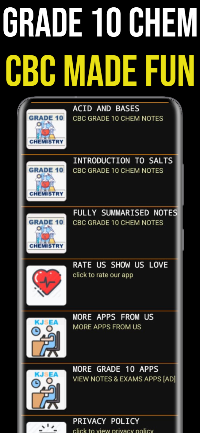 Master the fundamental elements of science with this comprehensive and clearly organized notes app for Grade 10 Chemistry under the CBC / CBE curriculum. Designed for Senior Secondary School (SSS) students, this app provides the essential foundation to begin your effective preparation, reading, and revising for the KSSEA examination in Grade 12. Formulate a Smooth Transition from JSS to SSS: This app is expertly designed to catalyze a smooth, efficient, and effective transition from Junior Secondary School (JSS) to Senior Secondary School (SSS). We help you react and adapt your revision strategy from the KJSEA format to the detailed requirements of KSSEA. Our Grade 10 Chemistry notes are carefully balanced to be comprehensive yet clear—breaking down complex reactions and concepts without being too hard—to build your confidence from the very start of your SSS journey. Why This App is Your Essential Chemistry Resource: Perfectly Organized Content: All Grade 10 Chemistry topics are neatly organized and well split into logical, structured chapters. This organized approach makes reading and revising formulas, equations, and theories straightforward and highly effective. Clarity for Deeper Understanding: Essential concepts in matter, bonding, and reactions are explained with student-friendly clarity, making reading and understanding chemical principles significantly better. Aligned with CBC / CBE: The content follows the official CBC / CBE curriculum progression, ensuring you focus on the precise material required for your SSS advancement and ultimate KCBE assessments. Strategic KSSEA Foundation: Build a strong conceptual base now to empower your future KSSEA preparation. These Grade 10 Chemistry notes are your critical first element toward excelling in KCBE examinations. Features: Complete coverage of all Grade 10 Chemistry topics. Simplified notes with clear explanations and illustrative examples. Intuitive design for seamless navigation and focused study sessions. The ideal preparatory resource for the KSSEA pathway. Disclaimer: This application, titled "GRADE 10 CBC / CBE CHEMISTRY NOTES," utilizes curriculum-referential terms such as Grade 10, Chemistry notes, CBC, CBE, KSSEA, KCBE, KJSEA, Junior Secondary School (JSS), and Senior Secondary School (SSS) solely for the purpose of creating familiarity and accurately describing the educational level and curriculum framework for which the content is designed. The developer is an independent entity and is in no way affiliated, endorsed, sponsored by, or connected to the Government, the Ministry of Education, or any governmental institution responsible for administering the CBC/CBE, KJSEA, or KSSEA examinations. By downloading, accessing, or using this app, you explicitly acknowledge that you have read, understood, and agreed to this disclaimer. If you do not agree with these terms, you should not proceed to use this application. All content provided is for personal study and revision purposes only.