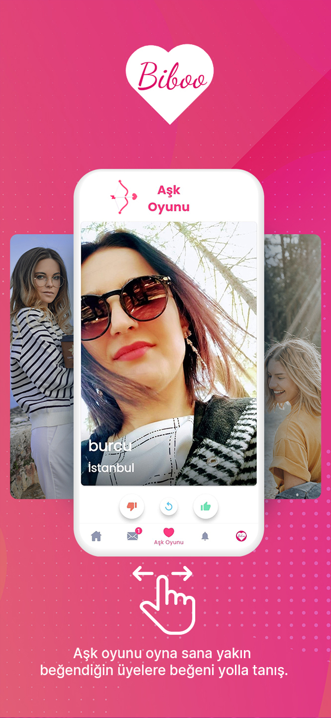 Biboo, which is active visually and vocally, renews itself every day and works to bring you together with the love you are looking for. Now it's even easier to use. Create your profile, upload your photo, play the love game, like it or make a video and audio call. Now the borders are gone with the love you are looking for, wherever you are, you have the opportunity to meet people near you. * Create Your Profile: Download Biboo now, create your free membership and fill in your information about yourself in the most impressive way. * Upload Photos: Upload a few quality photos that reflect yourself. Upload an impressive image that expresses yourself to be appreciated. * Play the Love Game: With the love game, swipe right on the profiles you like, starting from the members closest to you. Didn't you like it? Don't worry, swipe left to go to the next profile, choose the profile that suits you best and like it. * Like: Like the people you think are suitable for you in the profiles you visit, take your time and wait. * Now is the time to get to know the other person and introduce yourself. Come on, what are you waiting for? Hundreds of thousands of people are waiting to chat with you in the application.