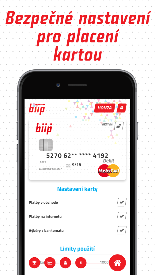 • můžete kdykoliv jednoduše omezit typ plateb. Sami si určíte, jestli lze s kartou platit na internetu nebo vybírat z bankomatu.