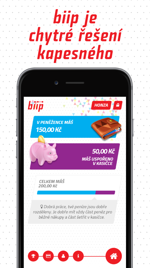 • vaše dítě se s aplikací biip učí odpovědně hospodařit díky nápovědě a motivaci ke spoření.