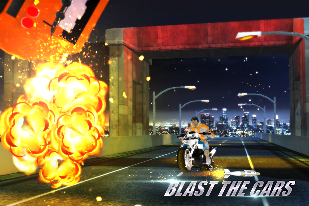 In this bike racing game, you will control an ultimate maniac motorbike rider. Go garage and select one of the high performance race motorbikes. You can upgrade their speed, handling, and braking features with coins. To get coins, ride in extreme speed on endless road. Play either in endless one way or two way. There are 4 locations: bay view, old west, tunnel side and small town. Perform close overtakes like a motor sports junkie for more action! The road is filled with cars, trucks, buses, and motorcycles. With the fist button, the aggressive rider can punch and kick the other motorbike riders. Collect missiles and rockets on the highway and then, launch them to fire and bomb the cars, trucks and buses. This aggressive and fast-paced combat racing game presents explosion and crash effects in high resolution to increase racing fever. The road is endless so go as far as you can. If you crash one of the vehicles on highway, the bike race game restarts. To avoid illegal crashing, you need to handle your motorbike or to blow up the cars on your way illegally. Don't slow down the speed. As you are riding above 100 km, close overtakes bring more scores. So pass caar closely and rac aggressively in this endless traffic game like moto gp. Generally, traffic games or endless car games don’t include maniacs, aggressive traffic racer or maniac attack. But this excite bike game is very aggressive. If you are an adrenaline junkie and like extreme motor sports, this ultimate bike racing game is for you. You have everything you need for aggressive, illegal and maniac traffic battle there. Just use them only in game to blow off steam and live racing fever. This bkie trial game gives you freeride chance. Keep your speed high above 100 km because speed performance affects race traffic your score. If you like traffic games and be assertive about your handling skills, this aggressive and illegal bike race game is for you with rocket launch, freeride, close combat features making it like a moto gp. Unfortunately there is no pov. You don’t need pov change to overtake caar, motors and bikes illegally or for rocket launch and maniac attacks. The garage in this maniac and aggressive bike race game is full with sentidos bikes like dirt bike, chooper, and motors. Overtake closely and illegally the caar on the road but don’t rear end or crush it. This aggressive and maniac bike race game is like mixed race because there are many vehicles on the road to overtake and rocket bomb. Bike Racing Traffic Rivals is for bike and motos sports junkie and maniacs with its aggressive and illegal close combat and roket. Overtake caar and bikes illegally and aggressively in this bikes rac game like moto gp as going at a speed over 100km. Features: - Battle racing game in ultimate speed with bikes and motors - High performance sport motorcycles, vintage or retro motorbikes for bike tech junkie - Up-gradable speed, handling and braking - 4 thematic locations: bay view, old west, tunnel side and small town. - One way and two way traffic options - Endless racing adventure and crazy traffic - Cars, trucks, buses, motors and bikes on the highway to overtake closely, aggressively and illegally - Rockets to collect for close combat - Chance to win free coins to continue your rac trial - Missiles and rocketx to fire cars, trucks and buses - Combat attack button like a fist to kick motorbikes - Extra score for speed above 100 km