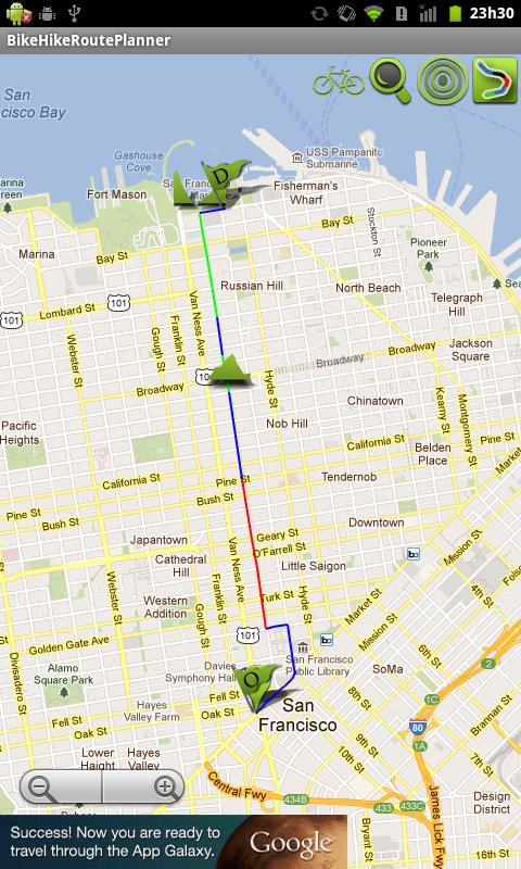 The Bike Route Planner is a tool to assist route planning and navigation, and many other tasks related to cycling and walking. Routes can be shared with others, and are then available at www.bikerouteplanner.net. Routes can also be recorded, based on GPS readings. Tracks can be adjusted to the ground altitude. Possible routes are shown on top of Google maps, with colors representing different inclinations. This is of vital importance to bikers and hikers, that frequently prefer to avoid steep slopes. The route's highest and lowest points are also depicted graphically, through 'peak' and 'valley' icons. Routes can be analyzed on the map, by their coloring, or through their summary and details, accessible from the menu. They can also be saved on the phone's storage, for future reference. An altitude profile graph is available, to better visualize the elevations along the route. All data concerning routes and the actual user's position is only used internally to the application, and is not shared in any way. See full details here: http://www.bikerouteplanner.net/privacy.html Info about bike routes is available for Australia, Austria, Belgium, Canada, Denmark, Finland, the Netherlands, Norway, Sweden, Switzerland, the UK and the US. Other countries' users can plan routes based on normal roads. The application is configurable. It may use metric or imperial distance units. It can be set to always show your location, and also to keep the map centered on it. Some data about you can be entered, to support estimation of calorie consumption. Although BikeRoutePlanner is not directed to car drivers, it is also possible to search routes for automobiles. Several new features will be added shortly. Further down the development road-map is the implementation of several other features, that will make Bike Route Planner a complete companion for your cycling and hiking activities. BikeRoutePlanner was developed by a frequent bike commuter, that felt that some navigation and route planning needs were yet to be fulfilled. Altitudes may seem irregular due to GPS's altitude inaccuracy: this can be solved by selecting 'Simplify and adjust to ground', in the 'Route' menu. Avoid recording very long routes, with many GPS readings, as this can exhaust the phone's memory!