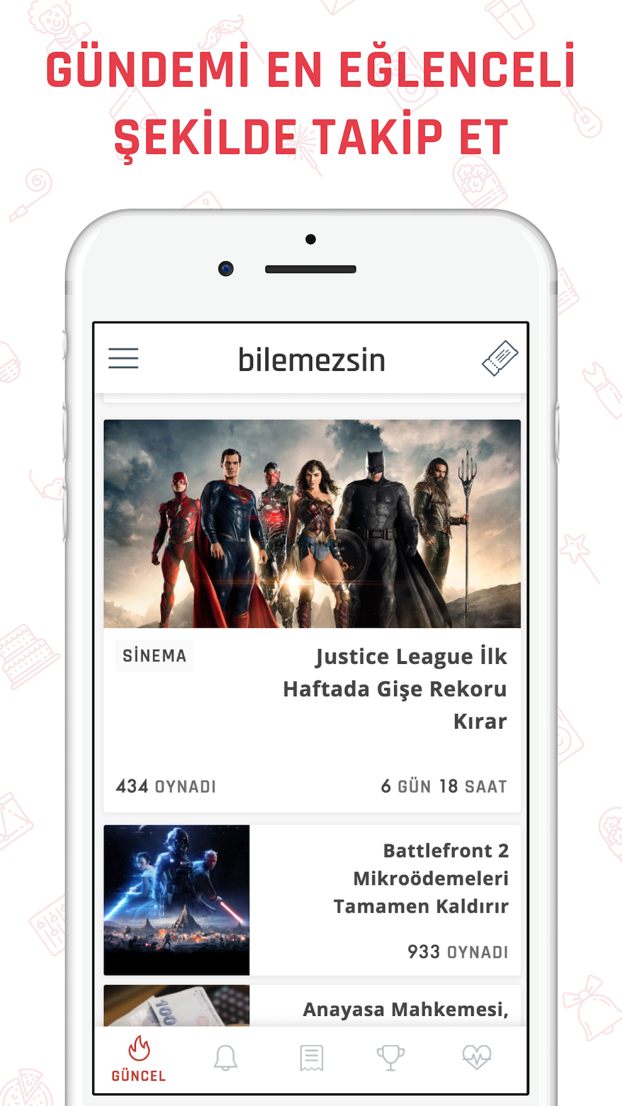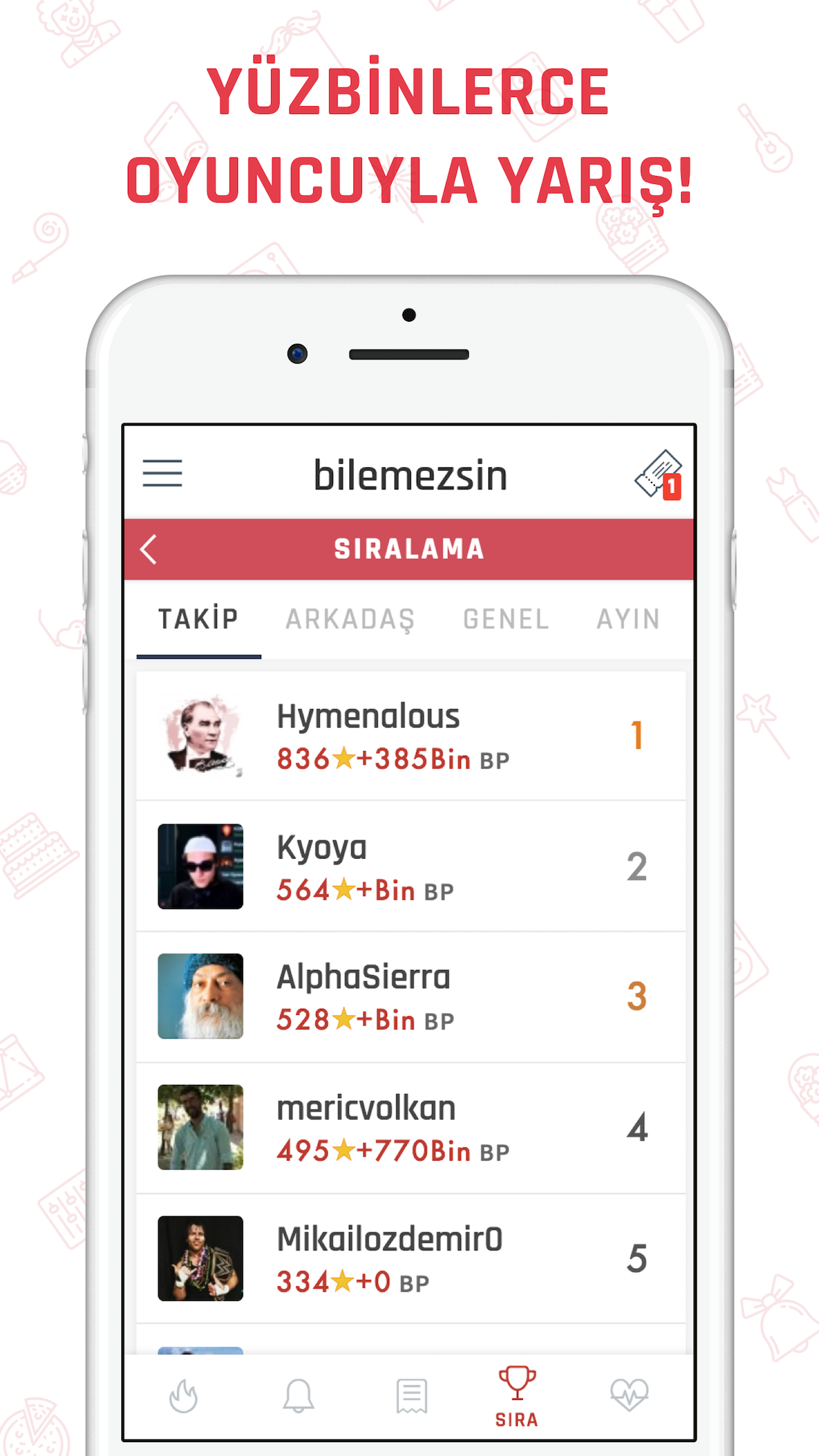 Binlerce 5 yıldızlı yorum yanılıyor olamaz! İddia ediyoruz, Türkiye'nin en bol ödüllü, en hediye dolu ve en sıra dışı uygulamasıyız! Gündem ile TONLARCA HEDİYE KAZAN! Tamamen ücretsiz! Türkiye'nin en farklı konsepte sahip haber, maç, gündem, spor, komik ve eğlenceli mevzu bahis konular üstüne, hediyeler kazandıran sosyal tahmin oyunu. Sosyal medya çekilişlerimiz ile de ünlüyüz desek, havamızı atsak? :) Bilemezsin ve Bilemezsin eSpor ile birlikte gündemdeki her sosyal konu ve haber hakkında tahmin yapabilir, doğru tahminlerin sonucunda kazandığın puanları hiçbir ücret ödemeden onlarca hediyeye çevirebilirsin. Üstelik gerçek para kaybetme riski yok ve tamamen ücretsiz! Ne duruyorsun, zekanı ve hislerini kullanarak doğru tahminleri yap, hediyeli yarışmalarımızda yer al ve hediyeleri kap! + Nedir bu Bilemezsin? - Hediyeli yarışmaların en güzelidir! Gündem'de yer alan, Başbakanın bıyığını kesip kesmeyeceğinden, "39 derece sıcaklıkta yumurta pişer mi?"ye kadar geniş yelpazede sosyal konular ve haberler üstüne, Evet veya Hayır'ı seçerek tahminlerini topladığın kuponunu yapabilirsin! - Başarılı tahminleriniz sonucunda kazandığınız puanlar, bol çeşitli, mükemmel hediyelere ücretsiz bir şekilde çevrilebilir. Bilemezsin gizli ödeme veya benzeri hiçbir ücret içermemektedir. Eğlenmesi de kazanması da tamamen bedava! -Mağaza'daki tonlarca hediyeden birine sahip olmak için tek yapman gereken doğru bilmek! Hediyen kapında! - Gerçek para içermez, Baba Parası (BP) adında tamamen hayal ürünü bir para birimi kullanır. Böylece maç yattı, bahis kaybetti, para gitti riski de yok! - Kazanan kuponlarını gösterip, arkadaşlarına ben demiştim demenin en güzel yoludur! - Rekabet ise dorukta! Gündemi en başarılı sen tahmin et, haftanın ve ayın birincileri ile yarış. Sıralamada başarı gösteren üyeleri ise ayrı sürprizler bekliyor! + Nasıl Oynanır? - Bilemezsin bilinen spor bahis kurallarına sahiptir ancak maç, basketbol gibi oyunlara yönelik bahis uygulamalarından tamamen farklıdır. Sosyal konular hayatın ve gündemin her köşesinden şekillenebilir. - Sosyal konular, spor, haber ve gündem üzerine yapılan, Evet veya Hayır seçeneğinden oluşan tahminler birleştirilerek kupon yapılır. Bu kuponlara BP (Baba Parası) yatırılarak oynanır. - Hediyeli yarışmaları ile kazandırır, gündem, sosyal konular, haberler ve önemli maçlar hakkında sıcağı sıcağına bilgiye ulaştırır! + Kime Karşı Oynanır? - Bilemezsin'de yer alan sosyal konular genellikle haber formatındadır. Gündeme dair bir olay ya da bir gelecek tahmini üzerine açılır. Bu olaylar ve konular kullanıcılar tarafından gönderilir! - Diğer oyuncular da herkesle birlikte BP kazanır, kaybeder. Dişinize göre rakipler ile ligler sayesinde rekabeti doyasıya yaşayabilirsiniz. - Tahmin yorumları pek keyiflidir, bizden söylemesi! Falcıya inanmayın. Zekanıza güvenmek en güzeli! Tüm bunlar hoşunuza gittiyse, bunlar ve daha fazlasını içeren uygulamamıza mutlaka bekliyoruz! Yoksa bu app'i kırıcaz. :/