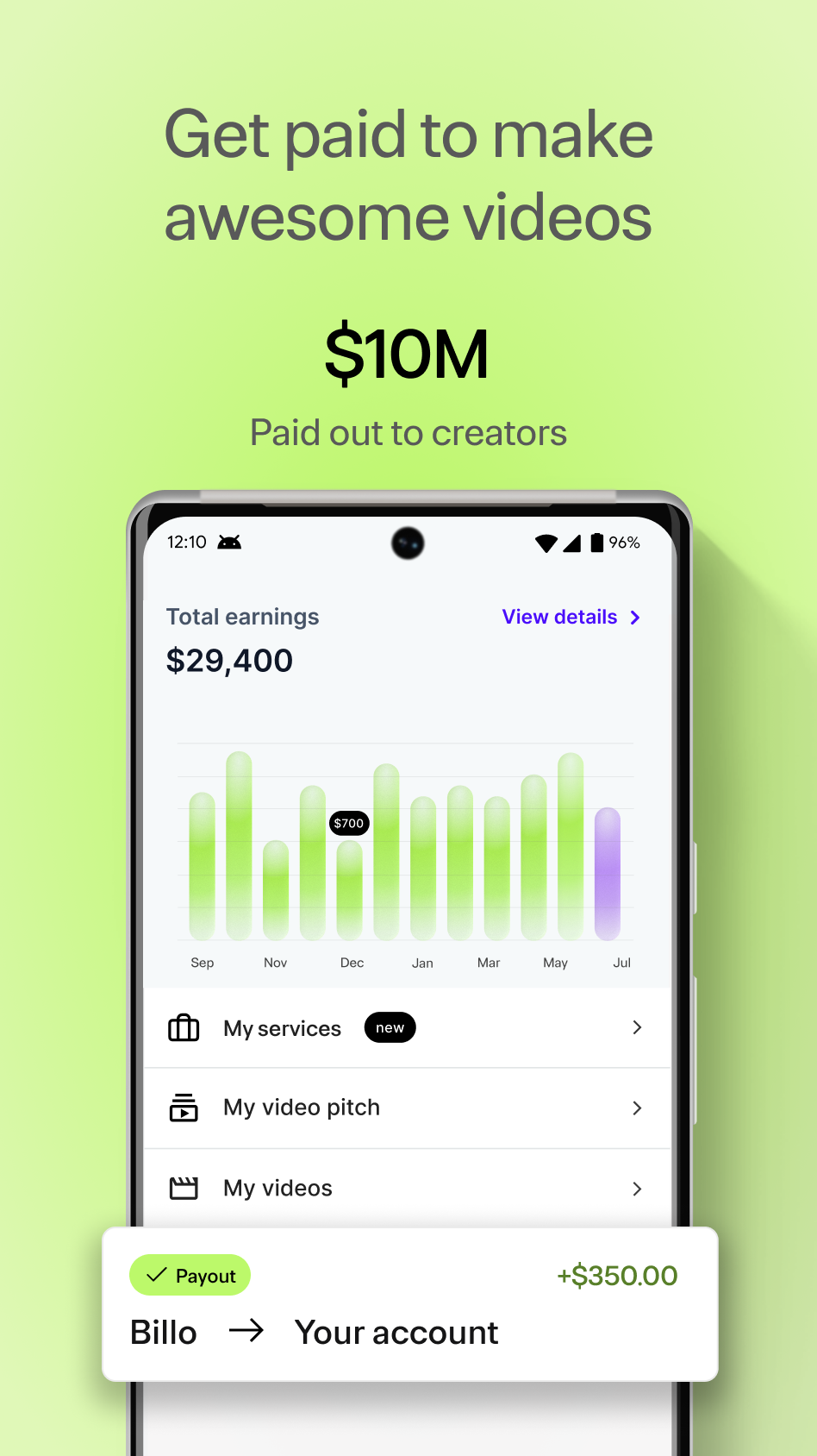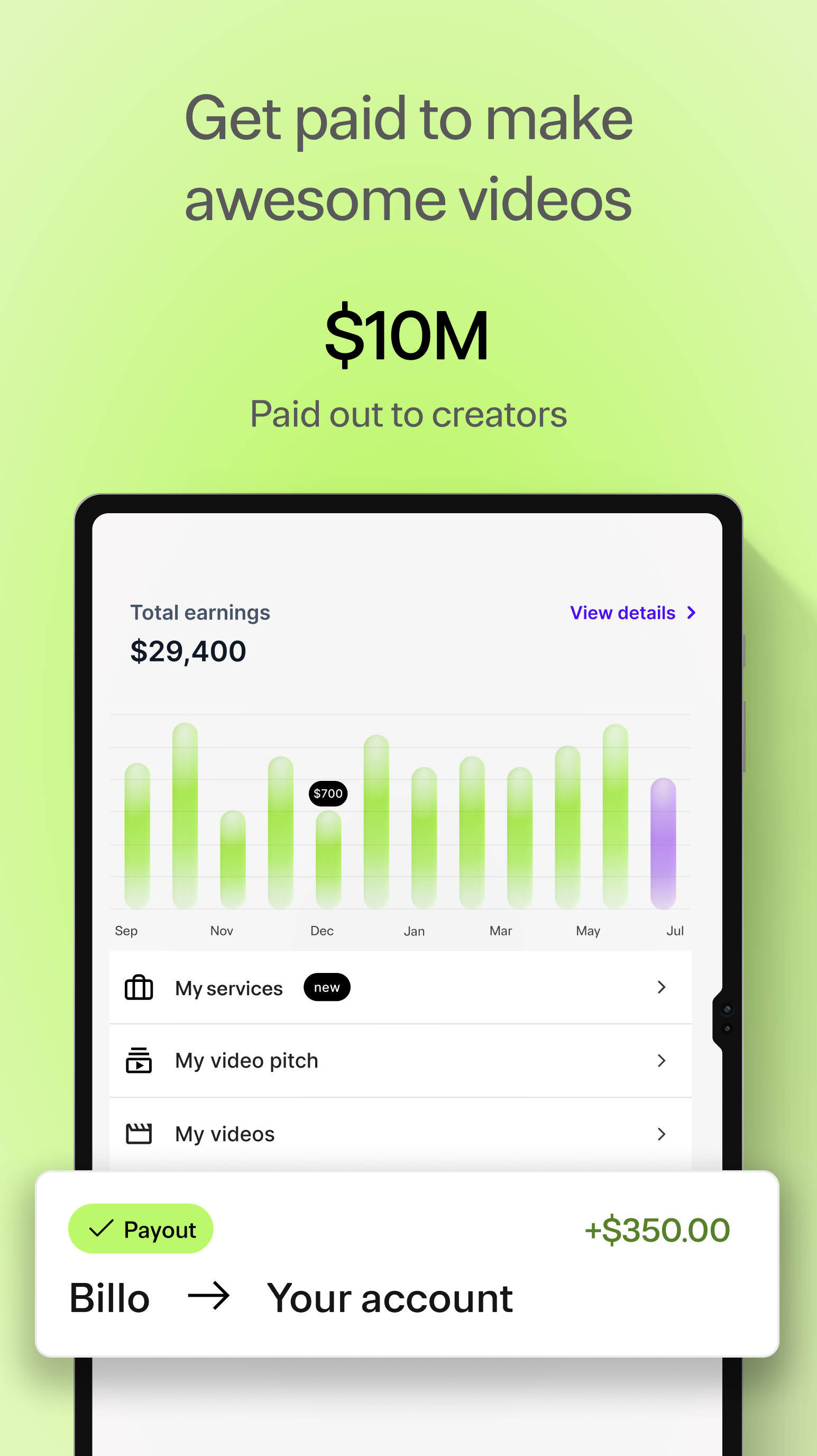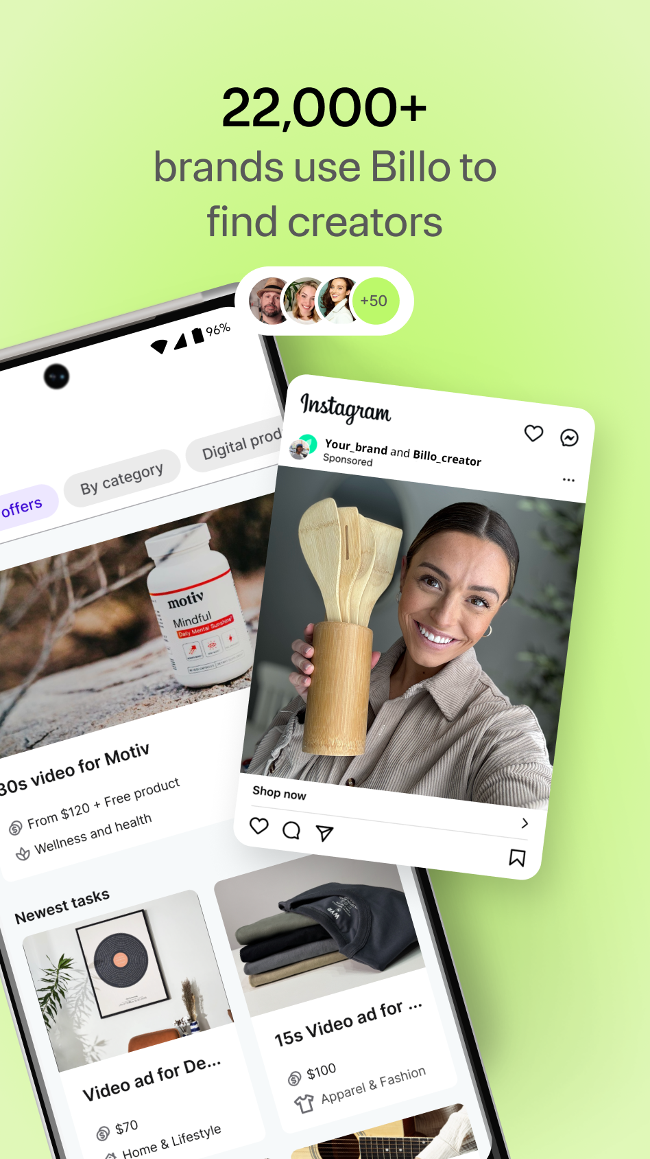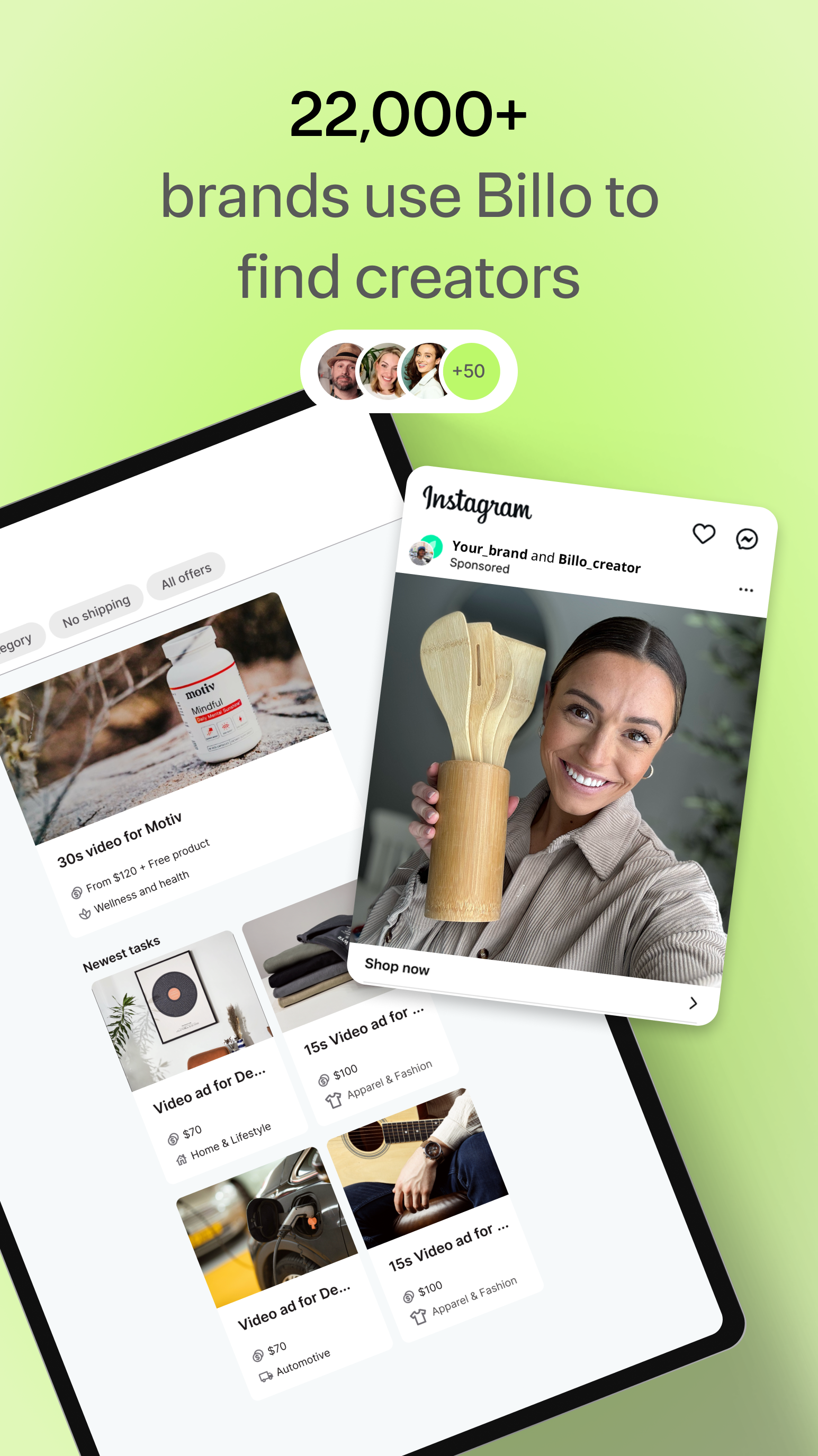 Get paid to create videos for top brands in the US, UK, Canada, and Australia! Join the biggest user generated content platform in the US and connect with thousands of brands looking for creators like you. Shoot short UGC videos reviewing products, build your portfolio, and enjoy the freedom and flexibility of being a Billo creator. All you need to get started is a smartphone. - 5,000+ creators have already joined Billo - 22,000+ brands you can collaborate with - $8.3 million paid out to creators BIG NEWS: Billo expands beyond the US and is now available to creators in the United Kingdom, Canada, and Australia. WORK WITH TOP BRANDS Access thousands of top brands looking for UGC creators, quickly build your portfolio, and get rewarded for your creativity with free products and competitive earnings. ACCESS 500+ WEEKLY JOB OFFERS Never run out of UGC creator jobs to apply to. Find hundreds of video job offers every day, pick the ones you like most, and apply in minutes! HASSLE-FREE EARNINGS The Billo UGC platform for creators handles all the paperwork and payments, so you can focus on creating awesome videos. Enjoy regular and protected payouts, with no contracts or complicated negotiations. NO EXPERIENCE REQUIRED Whether you're a stay-at-home mom, a fitness enthusiast, or an experienced UGC content creator, the Billo Creator app offers opportunities for everyone. GET FREE PRODUCTS From tech gadgets to beauty products to fashion accessories, get free products from a variety of exciting brands to feature in your videos. HOW TO GET STARTED Sign up to the Billo Creator UGC app and start making paid content in just four easy steps: 1) Download the free Billo Creator app and create your profile. 2) Upload a short intro video introducing yourself to brands. 3) Browse hundreds of video job offers every day, find projects that excite you, and apply in minutes. 4) Once you’re approved, wait for the product to arrive, shoot the videos, and get paid. You can keep the products as well! Download the Billo Creator app and start earning today!