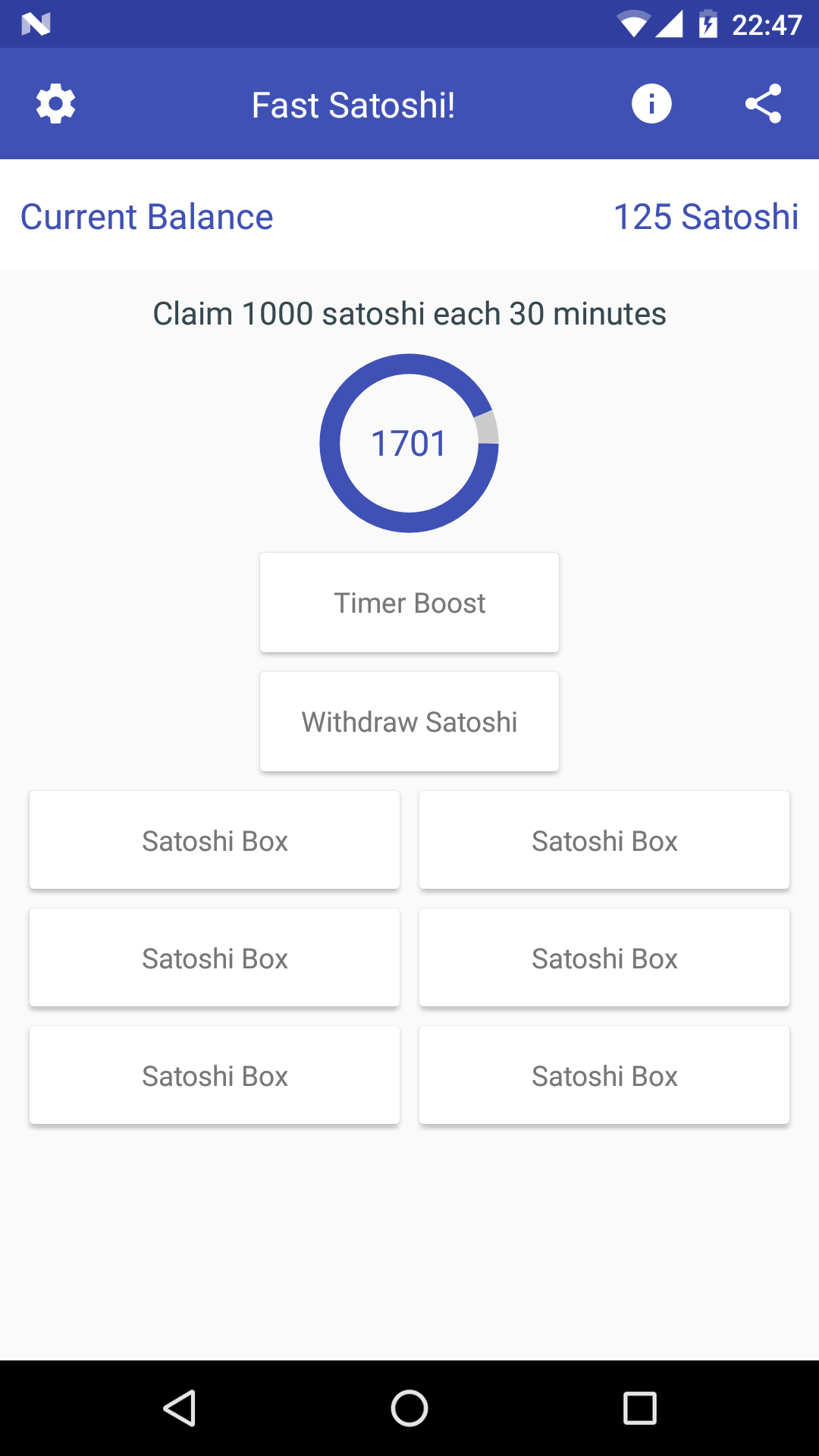 Fast Satoshi! (Package Name: com.bitapps.earnfreebit) is developed by Suraj G and the latest version of Bitcoin Faucet. 11.0 was updated on March 3, 2018. Bitcoin Faucet. is in the category of Entertainment. You can check all apps from the developer of Bitcoin Faucet.. Currently this app is for free. This app can be downloaded on Android 4.2+ on APKFab or Google Play. All APK/XAPK files on APKFab.com are original and 100% safe with fast download.