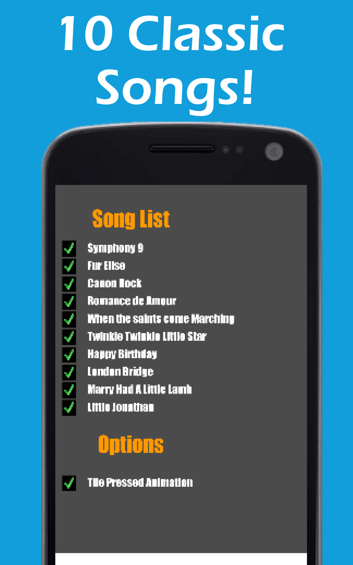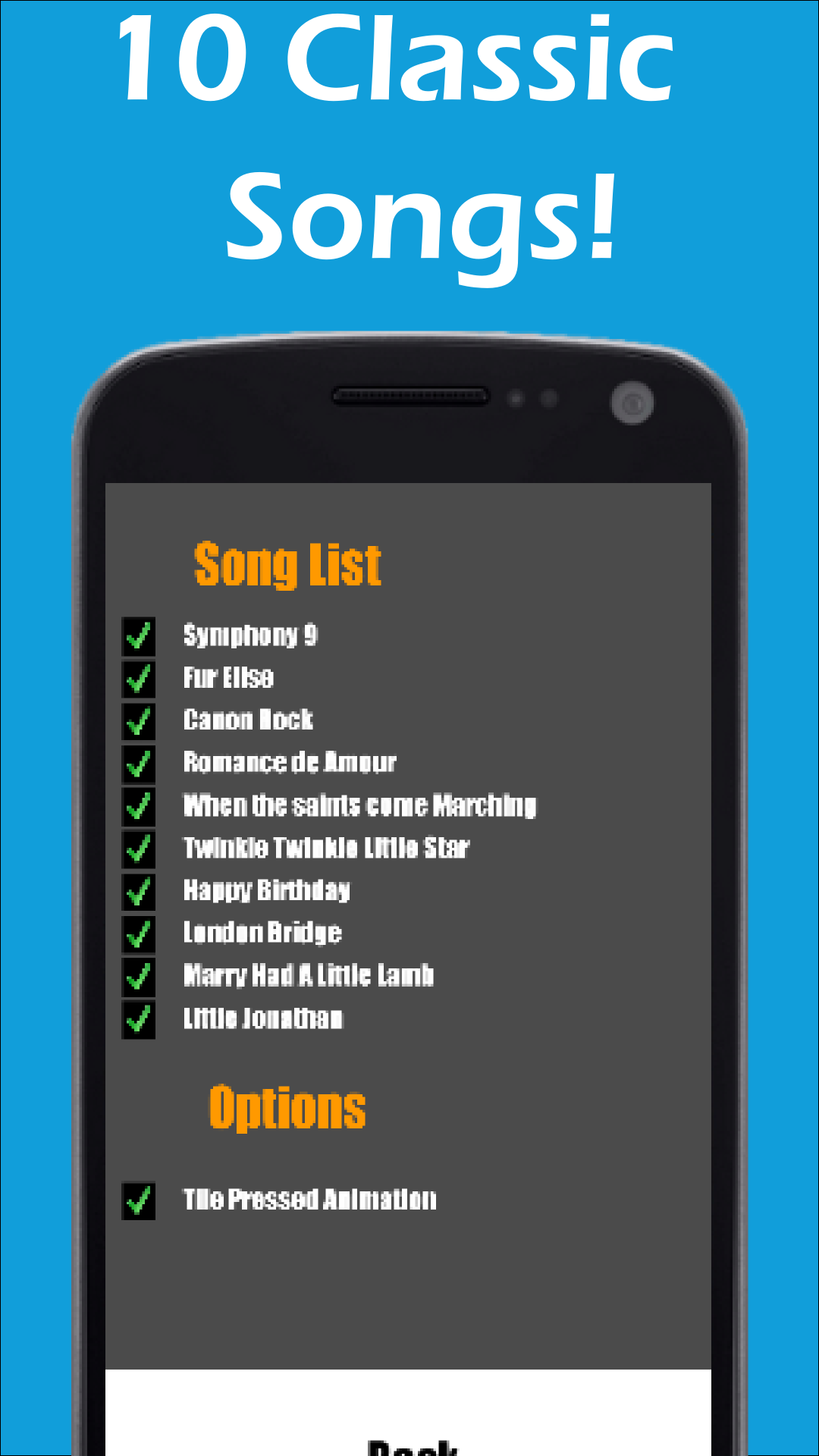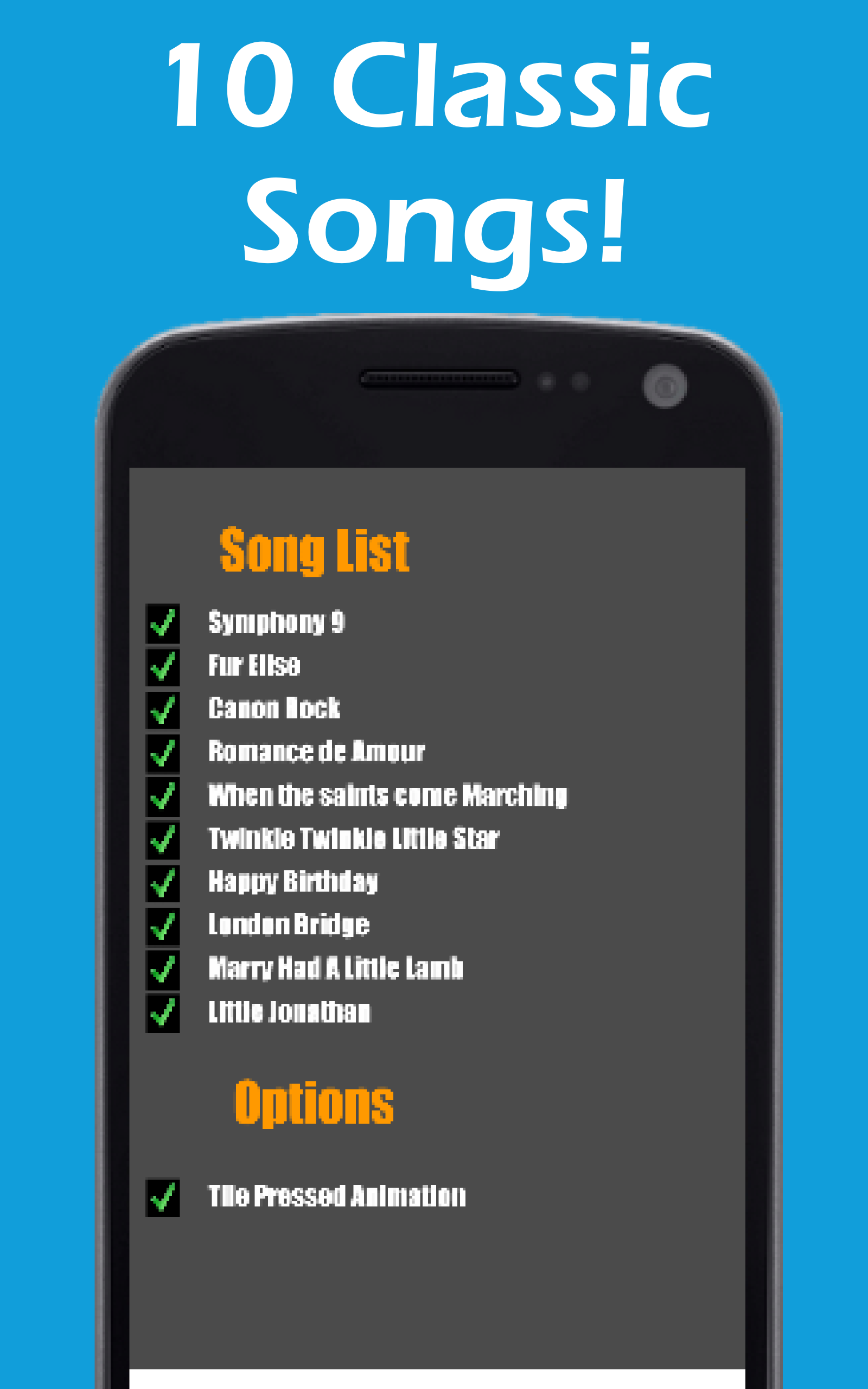 This fun and extremely addictive game is perfect for everyone! How To Play: This game is very easy: play your piano by touching the black tiles. Don't tap the white tiles, or else! All you need is fast fingers and a fast mind. Think it sounds easy? Give it a try and see if you can beat your friends! Never get bored! 5 Fun and Addictive Game Modes! ◈ Classic ◈ Arcade ◈ Relay ◈ Zen ◈ Free Play 10 Song Customizable Awesome Classical Piano Soundtrack ◈ Symphony 9 ◈ Fur Elise ◈ Canon Rock ◈ Romance de Amour ◈ When the Saints Come Marching ◈ Twinkle Twinkle Little Star ◈ Happy Birthday ◈ London Bridge ◈ Marry Had A Little Lamb ◈ Little Jonathan