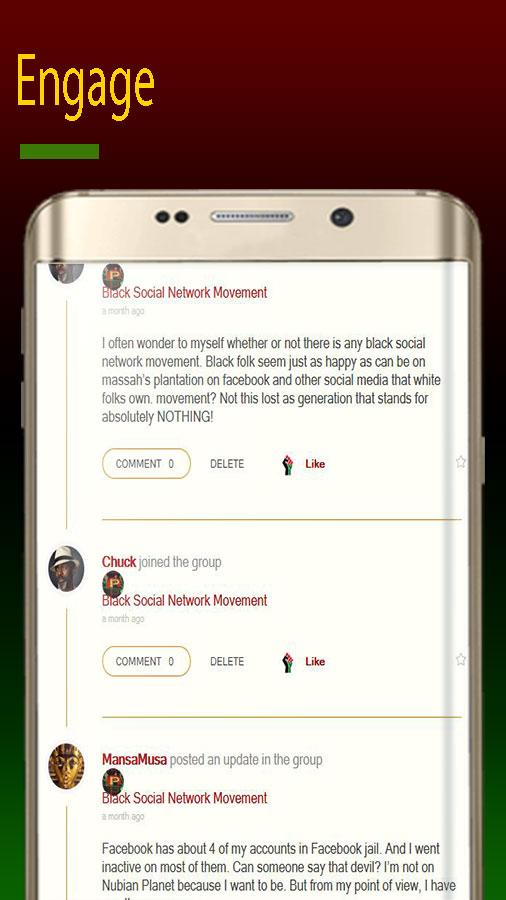Nubian Planet chat messaging app is a black news, picture sharing, networking app built with love, passion, and integrity towards the struggles Black people face on Black social networks. Join the conversation. Discover black pictures, black news, and have black fun! Meet Black melanated people. Nubian Planet chat messaging app is what's happening in the world and what people are talking about right now! #1 Nubian Planet chat messaging app social app on the planet! Black meetups have never been better. New faces. It's like being on Blackbook with black faces! Black meetups. Black melanin. There simply needs to be moor us on Nubian Planet chat messaging app! Use our advanced marketplace to sell products or services, post jobs and events or even set up your own fund me campaign! Sky is the limit on Nubian Planet chat messaging app! Nubian Planet chat messaging app social app enables you to: • Post status updates, photos, and videos. • Like posts and leave comments. • Follow your friends and favorite accounts. • Browse ‘Popular’ displaying the most popular posts or ‘Recent’ to see the latest on Nubian Planet chat messaging app. • Edit and personalize your photos. • Chat privately with your friends or create group chat A colossal Black social, Black news, Nubian Planet chat messaging app app has arrived for the eager anticipated Black social network that rival the likes of other social networks, and will have plenty of Black people meeting up and chatting on our Nubian Planet chat messaging app messenger app, spending hours trolling through pages of Nubian Planet chat messaging app, and finding out about the latest Black news updates. It's the best platform where Black melanated people meet. Nubian Planet chat messaging app is a breakthrough, servicing the largest niche in the market, and exactly what the Black community needs to be abreast with what’s upcoming and fresh by tweeting the latest broadcasts on the go. Nubian Planet chat messaging app is for the people globally dispersed across the planet. Nubian Planet chat messaging app is optimized to perform for every need, from crowdfunding, Black networking and getting the latest in Black news. Don’t be left out. Download the hottest Black social app and start connecting the right way! TEACH Tweet articles or blogs about Black History. Engage in the groups about Black History on popular topics such as Kemet, West Africa, and Nubian people and culture. Tweet content and links from around the web about our black history. INFORM Tweet news and events Engage on hot topics in the forums area or create your own Tweet trending articles about hot topics MESSENGER Chat privately with friends and followers Share tweets and other media Tweet group conversations PROFILE Customize your profile with a photo, description, location and background photo Look back at your Tweets, Retweets, replies, media, and likes Control your privacy settings EXPLORE BLACK NEWS See what topics and hashtags are trending now Discover moments, curated stories showing the best of events trending in the melanated world Get caught up on Black news, issues, and events that are particularly of importance to you Be in the know about hip hop culture and entertainment See what Black news is going viral Relive your favorite moments Get the latest on the hottest Black trending videos online TIMELINE Discover what your favorite conscious leaders are talking about Get celebrity updates right on your timeline Stay in contact with conscious celebs Now is your time to engage with Black people on Nubian Planet chat messaging app where you can meet Black people! This is the platform for you to express yourself freely without the need for you to censor your dialogue. Nubian Planet chat messaging app is revolutionary in Black social networking and we are working day and night to ensure that you have the best social experience on the planet!