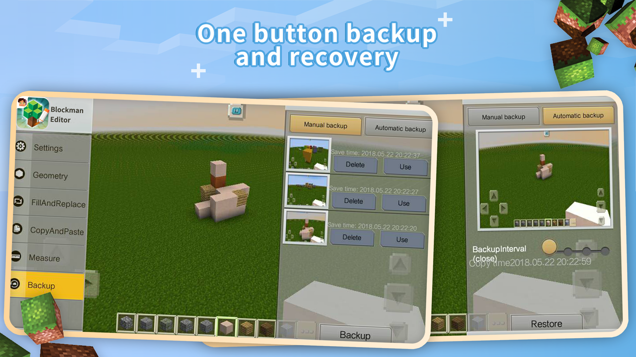 Blockman Editor is a convenient, fast, feature-rich, supports one-click revocation map editing tools.The integration of rapid construction,upgrading and optimization of interactive operations.Various editing features give you the most fluent editing experience! Main Features: 【One-key Generate】Natural landscapes, plants, decorations, buildings and so on can be created by one button. The rich and varied models of decorations can be selected, dragged and placed accurately. 【Clipboard】You can save buildings at any time and anywhere, cross map use, reduce repetitive operation, build one time, use many times, and save time. 【Fill replacement】 Fill pit, water,plane,reclamation, fill plane, replace single / multiple / adjacent box. A variety of replacement boxes and methods, edit the map more flexible and efficient. 【One-key Revocation】 Do not be afraid of operation error anymore, one key revocation, restore the previous step, do not need to destroy the map and box. 【One-key recovery】After revocation, you can return at any time. 【Map backup】Map backup can backup the current map at any time and place, and do not have to worry about map damage. Find a good backup map, restore it with one key, and continue to edit carefree 【Map submission】The good map can be submitted to us for review. The approved maps can be applied to Blockma Go's games Map copy, map name changes..Blockman Editor Editor gives you the most powerful editing function, so that you can better participate in the game production!