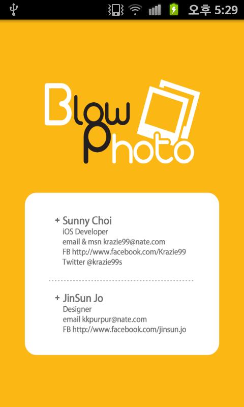Blow Photo - Timer Camera (Package Name: me.blog.krazie99.blowphoto) is developed by Sunny Choi and the latest version of Blow Photo - Timer Camera 1.1.5 was updated on February 7, 2013. Blow Photo - Timer Camera is in the category of Photography. You can check all apps from the developer of Blow Photo - Timer Camera. Currently this app is for free. This app can be downloaded on Android 2.2+ on APKFab or Google Play. All APK/XAPK files on APKFab.com are original and 100% safe with fast download.