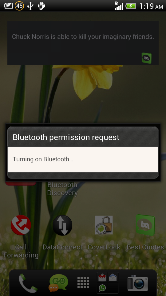**** Description **** The Bluetooth Discoverable widget allows android users to quickly change their device's Bluetooth discovery status. Features:- -This widget allows user to enter 'time in second' to make their device visible in just one click. -If Bluetooth is off, this widget will turn on Bluetooth and make it discoverable for 'x' seconds set by user in widget. -This widget also gives option to turn off Bluetooth in just one click. -Default discoverable time of device will be 120 seconds.