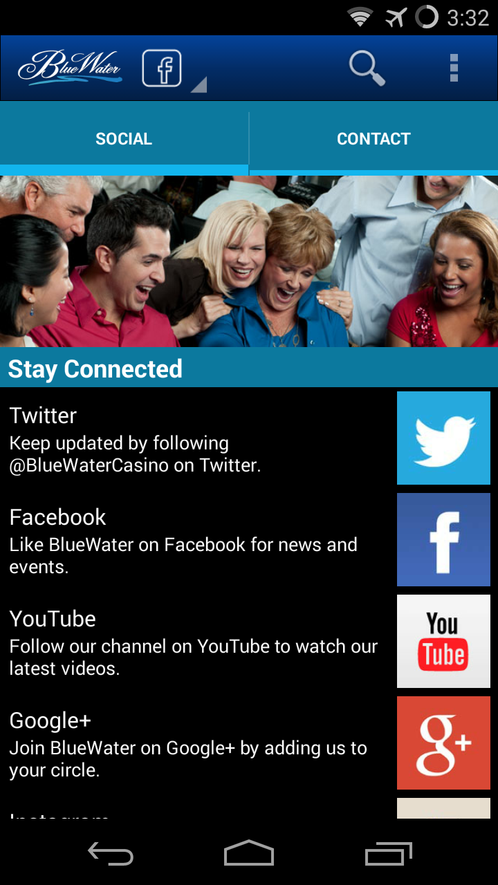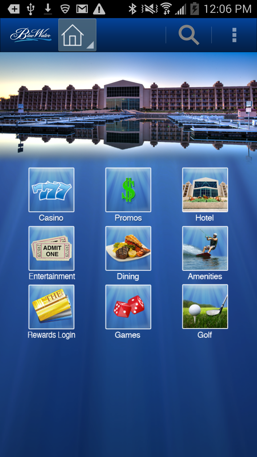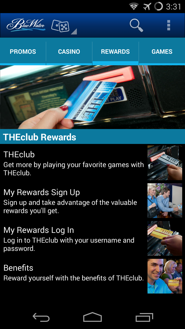 Now you can access all the fun and excitement of BlueWater Resort & Casino wherever you are with the official mobile app! This action-packed app connects you instantly to the latest promos, event listings, room booking and dining information, GPS and indoor mapping, attractions, play-for-fun slot games and much more! Features Include: CASINO When it comes to 24/7 casino gaming, no one can match the thrills, action, and excitement of BlueWater Resort & Casino! Browse through the casino section to instantly discover our table games, slots, bingo, and hot promotions. You’ll never miss out on the action with the BlueWater Resort & Casino app. HOTEL RESERVATIONS Planning a stay at BlueWater? This app makes it easy for you to browse through the rooms, view amenities and book reservations instantly while you’re on-the-go. THECLUB REWARDS Be a part of THEClub Rewards! Learn about the exclusive rewards and the perks for joining, and then sign up on the app! You can also log in to check your points, wherever you are. DINE & FUN Get information on all the great places to eat at BlueWater Casino. View restaurant menus, then grab a table at the River Willow, BlueWater Grill, River's Edge Cantina, or one of our other fine venues. Check out our upcoming live entertainment schedule. Plan your visit with just a few taps! FREE PLAY GAME - TOTAL BLAST Play Bally’s Total Blast for free! Featuring vivid animation, dynamic arcade sound, and unprecedented interaction! The bonus feature is triggered when two scattered Bonus symbols on reels one and five are hit during normal game play. Players get to target and blast enemy spaceships out of the sky using the innovative U-Shoot technology on the iDeck. Once the bonus is complete, players continue the action with the Pick Bonus. It’s a total blast! ACTIVITIES GUIDE BlueWater is the perfect vacation spot for the whole family! Take a wakeboard ride, soak up some rays at our beach, make a splash at our waterslide park, or tee off at Emerald Canyon golf course! Don’t miss the Parker area’s many attractions, including the famous London Bridge. The app has it all! GPS AND INDOOR MAPS Access overhead custom GPS maps or view detailed property maps of the casino resort and surrounding area. Use our indoor wayfinding map to easily navigate inside the property. IN-APP SEARCH Use the embedded smart-search bar to find content by keyword. STAY CONNECTED Don’t miss out on the latest news at Thunder Valley before, during or after your visit! View our tweets, connect with us on Facebook, watch our YouTube videos and more! You can also share any content page with friends on Facebook, or email it to them using the “Tell-A-Friend” feature. WEATHER UPDATES Get live weather updates in just a few simple taps, before or during your visit. CREATE YOUR OWN ITINERARY You can bookmark information about our latest offers or events and create your own schedule straight from the app. STAR RATING AND FEEDBACK Let your voice be heard. Share your experience with us at BlueWater using the feedback survey, or use the five-star rating tool to rate any of our featured services with the app AND MUCH MORE!