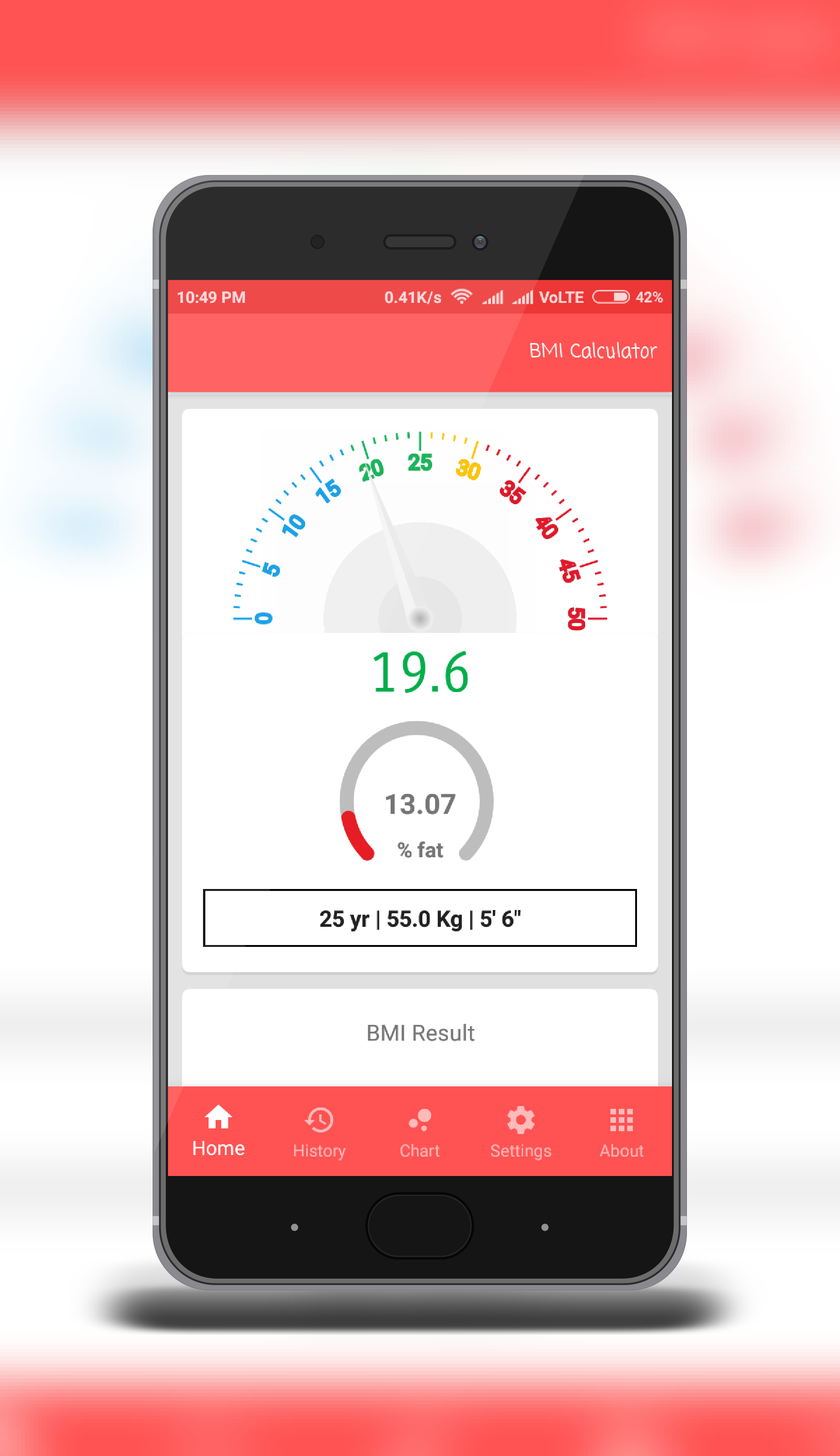 Calculate Your Body Mass Index and percentage of fat in your body. Body mass index (BMI) is a measure of body fat based on height and weight that applies to adult men and women. Enter your weight and height using standard or metric measures, and monitor Body mass index (BMI) and percentage of fat in your body. All measurements use information about your body: gender, age, height and weight. ✉ For any issue email us at [email protected] Please leave a ★★★★★ -review if you like our app! # BMI Calculator # Body Fat Calculator