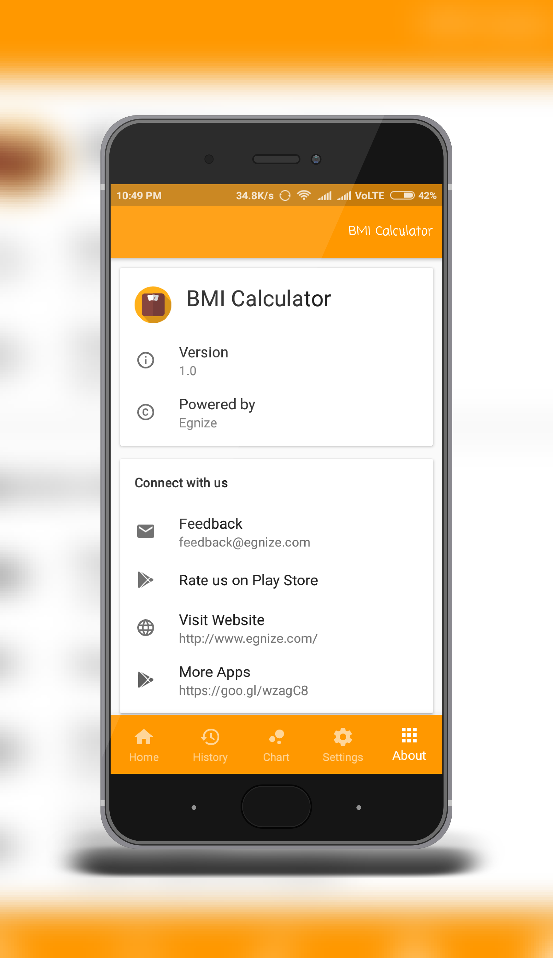BMI & Body fat Calculator (Package Name: com.egnize.bmi) is developed by Egnize and the latest version of BMI & Body fat Calculator 1.01 was updated on June 1, 2017. BMI & Body fat Calculator is in the category of Health & Fitness. You can check all apps from the developer of BMI & Body fat Calculator and find 99 alternative apps to BMI & Body fat Calculator on Android. Currently this app is for free. This app can be downloaded on 4.1 and up on APKFab or Google Play. All APK/XAPK files on APKFab.com are original and 100% safe with fast download.