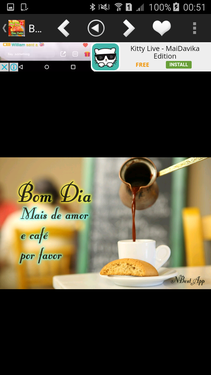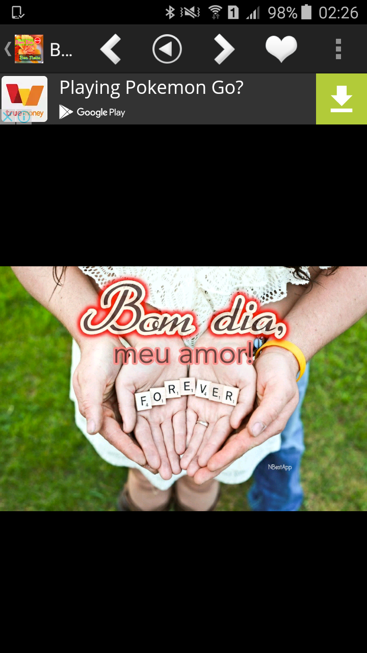 You can say good morning and good night to your friends, your lover, or your family, relatives, colleagues, and acquaintances in the early morning everyday by sending a greeting, wish Good Morning pictures, images or message card, Good Morning Quotes or every night by sending a greeting, wish Good Night pictures, images or message card, Good Night Quotes . There are a lot of beautiful picture, some quotes and poems on this app.You also can say Good morning and Good night even on a special day such as Happy New Year, Merry Christmas, Happy Father Day & Mother day. You can easily send it to your friend by:- -Save favorite picture to our phone only 1 step!! and you can send it later. -Or Share/Send that picture via all social just 1 touch easily ; such as Facebook , Line , Google + , Twitter , email , and etc. -Set awesome picture to be your Wallpapers just 1 Click. **Always Online up to date!!** Install now “ Bom Dia ”, Give a nice day to your lover every day and every night !! #You can rate us and please give +1 for motivation our development team and we will continue create a good job for you. Thank you very much!! -How to give us rate such as you want to give us 5 starts then click at the last one (The fifth star *****) but if you give the wrong one then you can be back to edit it anytime. *** Just searching "NBestApp" for the other our application. Thank you so much!! ------------------------------------------------------------------ Disclaimer: We do not claim ownership of any pictures. Which have been gathered from the internet if you belong to any image. And want it removed, or we can make you a credit picture. Please email them to us. We are happy to resolve it as soon as possible.