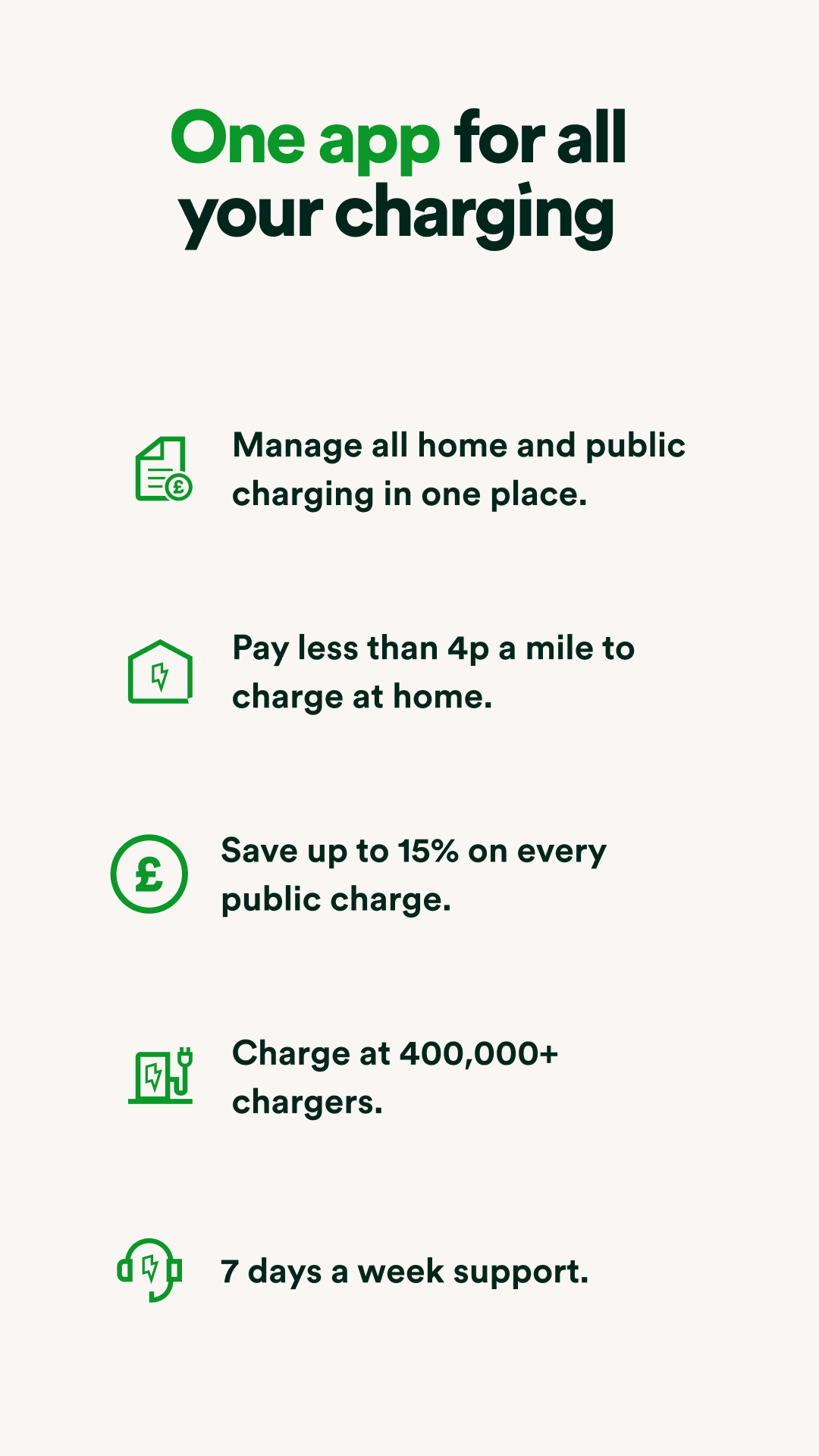 🔌 Public EV Charging with Charge Anywhere Find public EV chargers: 50,000+ in the UK and 400,000+ across Europe Filter by connector type, charging speed, network, or EV model Real-time charger status: avoid waiting or faulty stations Start, stop, and pay for charging in-app, or use your RFID card offline Compatible with 600+ charging networks like Ionity, Osprey, Fastned, InstaVolt, and more Your ideal EV charging station locator for trips, commuting, or public top-ups You don’t need to be an OVO energy customer to use Charge Anywhere - it’s open to everyone. ⚡ Home EV Charging with Charge Anytime Smart charging: smart charge your car anytime, day or night Pay less than 4p/mile to charge at home with a Pay as you go plan* Simple controls: set your ‘ready by’ time and let the app charge around your schedule Ideal for drivers searching for a home EV charging app that lowers costs, complications and emissions One monthly payment for your at home and on-the-go charging Add Charge Anytime to your OVO home energy plan to unlock low charging rates for your electric vehicle. 💷 Save on home and public charging Add Charge Anytime to any OVO energy tariff for free and smart charge your EV at any time of the day or night. See transparent, network-set pricing before you plug in on-the-road - no hidden fees Boost your savings with flexible subscriptions: Light Boost (£2/month): 10% off all public charging + exclusive rewards Turbo Boost (£8/month): 15% off public charging, route planning, and other premium features Perfect for drivers who charge on-the-go, once a month or once a week. 🌍 Why Choose OVO Charge? ✓ One unified app for home + public EV charging ✓ Compatible with major EV makes, models, and charging connectors ✓ No energy contract? No problem — Charge Anywhere is open to all EV drivers. ✓ Check your Charge Anytime compatibility on our website today. ✓ Built with real-time charger availability, trusted reviews, and Europe-wide coverage ✓ Brought to you by OVO — a leading UK energy provider committed to zero-carbon living 📲 Download OVO Charge Today Power your EV with smart, green charging at home and fast, reliable public charging across the UK and Europe. Find chargers, plan routes, and save money — all in one powerful EV charging app. *Our smart tech aims to charge your car when the grid has more renewable energy in it, within the time you’ve set. Meaning it’s less likely your EV will be charged by energy from fossil fuels. The 4p a mile claim is based on an EV customer driving the UK average of 7,000 miles at an average of 4 miles per kWh. The Charge Anytime pay as you go add-on rate on 4/11/2025 is 14p per kWh. Actual sum per mile is 3.5p. Individual costs will vary based on your vehicle efficiency, driving style and weather conditions.