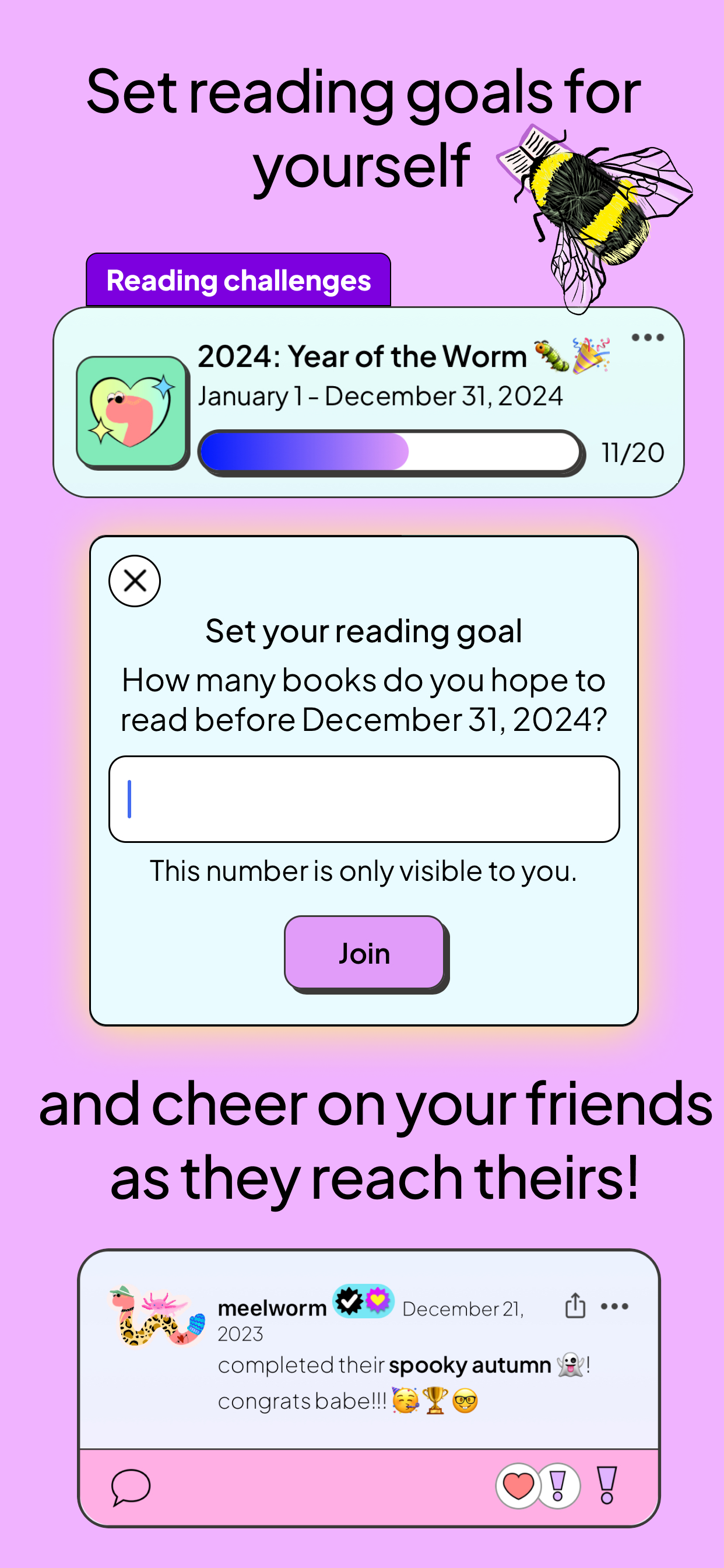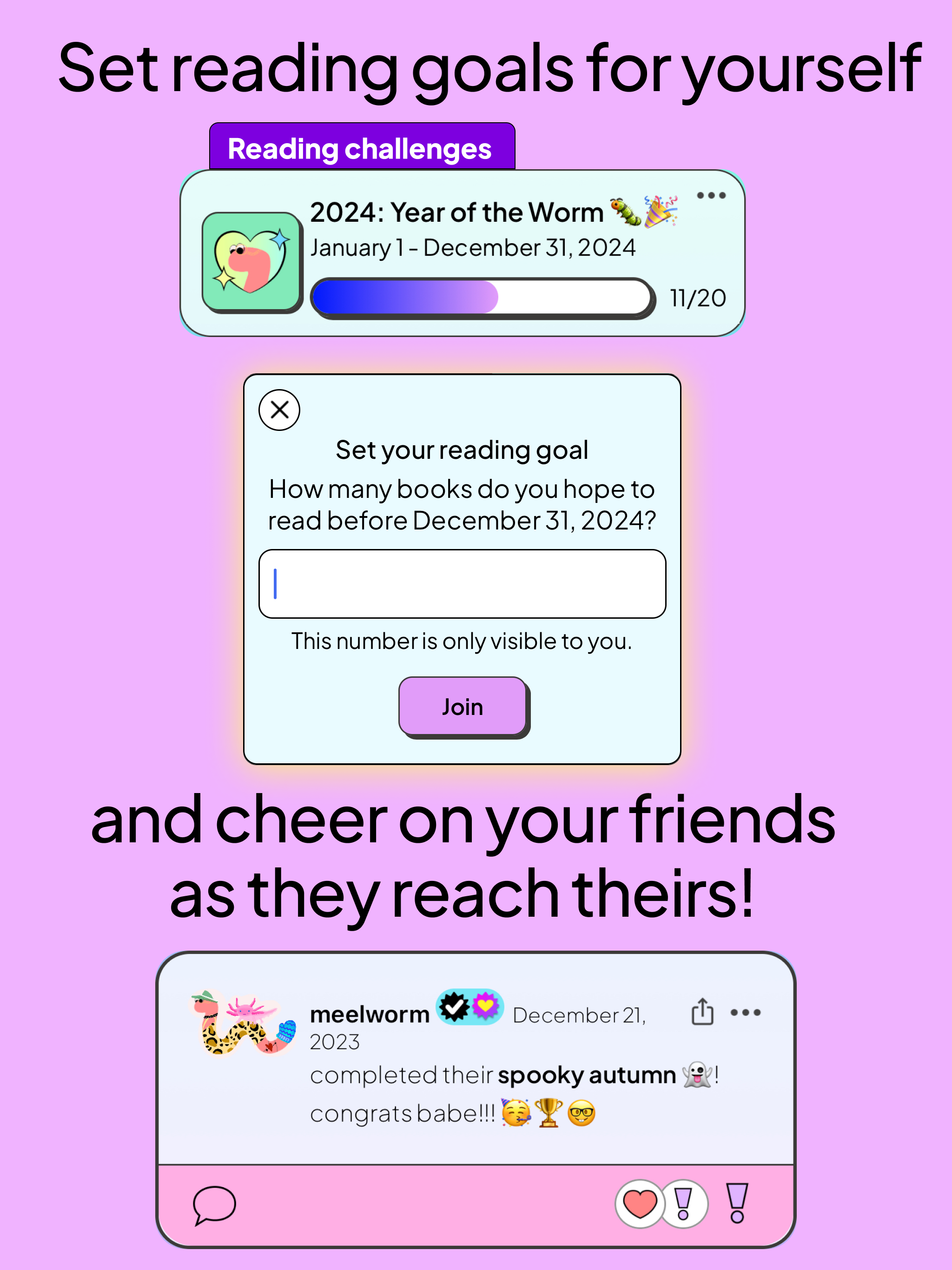 Join community reading challenges. Set a reading goal for yourself and let your friends cheer you on. The number of books you set as your goal is only visible to you. Upon joining, you get the option to give your wormy a badge to show you're participating in the community challenge. And, you can edit your goal number as the challenge continues.