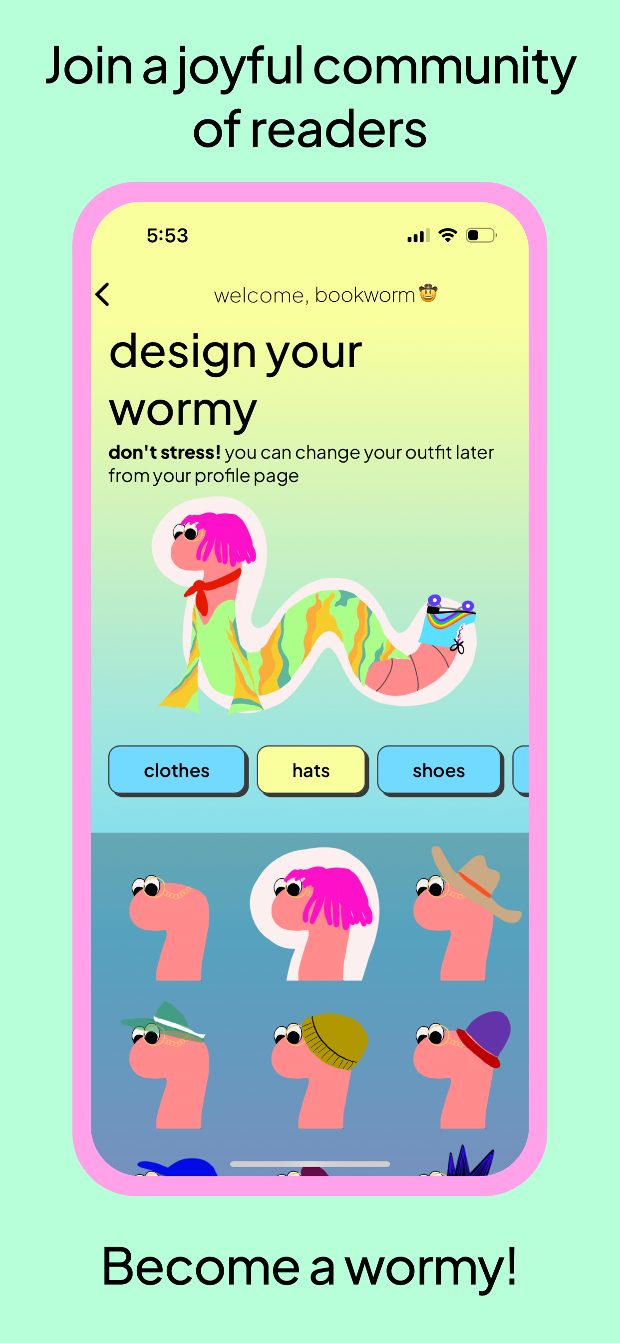 Dress up your wormy avatar. Hands down the best feature on Bookworm Reads: dress up your wormy avatar! Choose from outfits, wigs, accessories, and more to keep your wormy as fresh as you are. Get creative, and change your outfit as much as you want! You can also buy a real life bookworm bookmark + sticker pack to keep your books adorned with Bookworm swag.